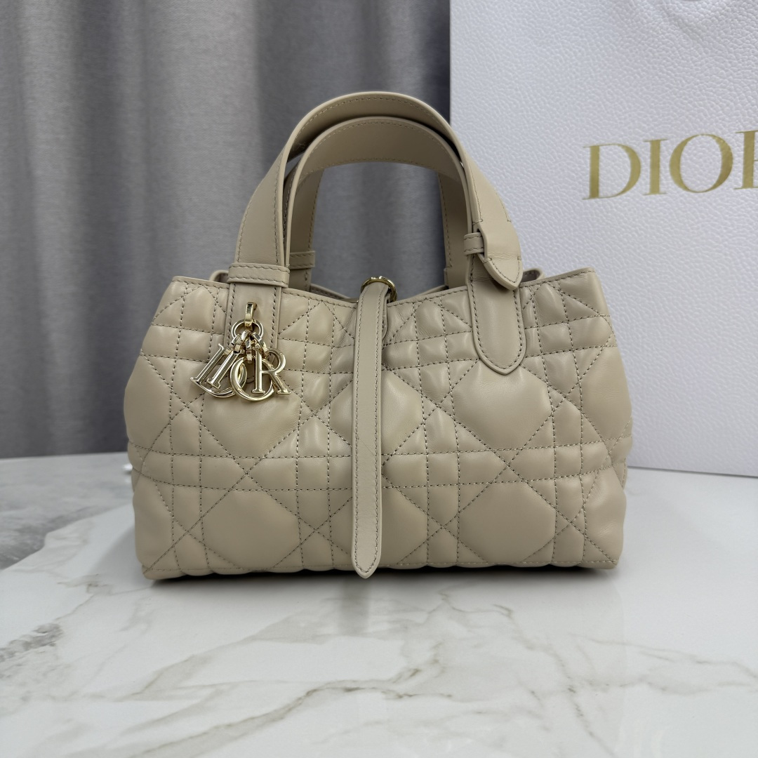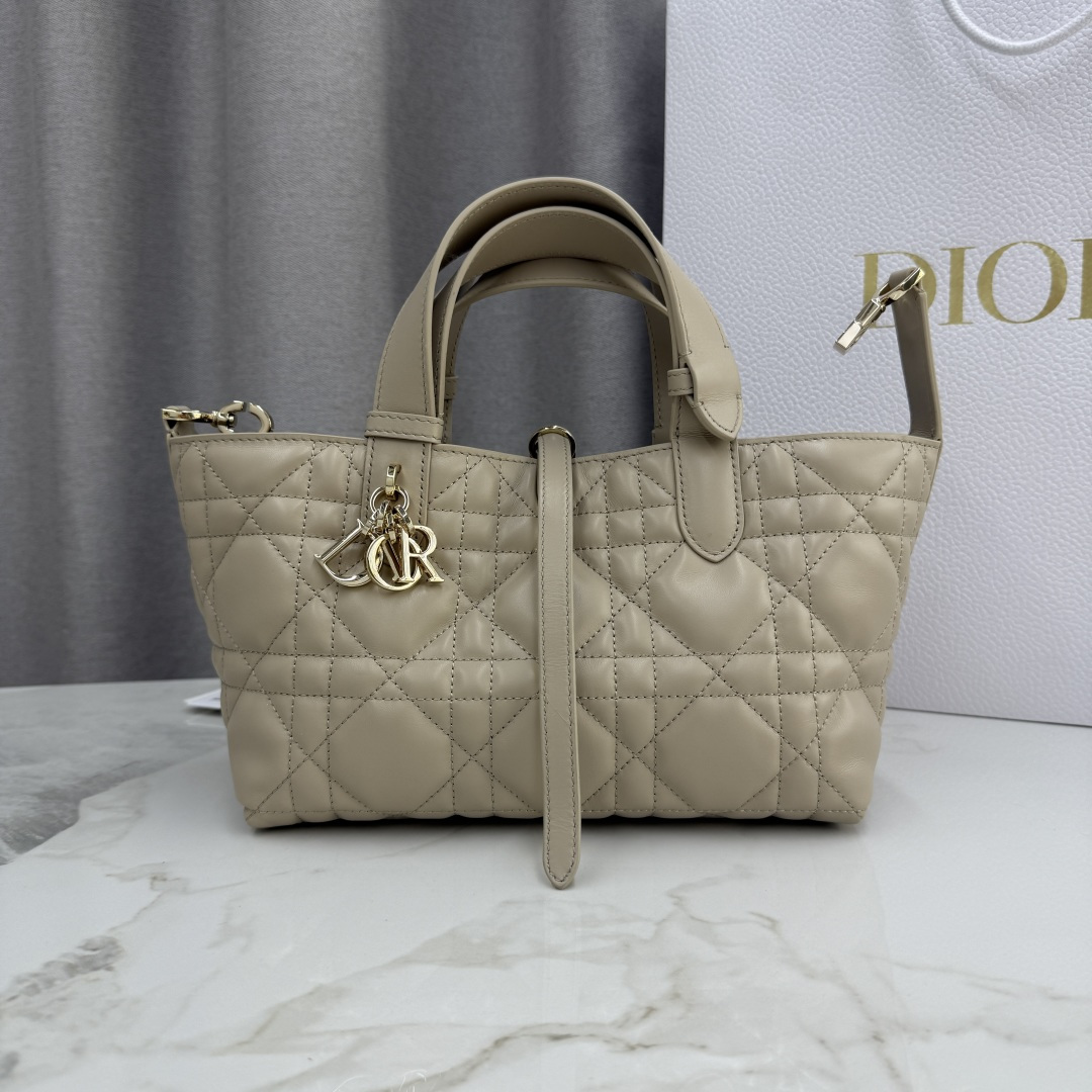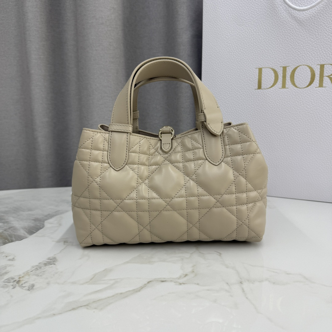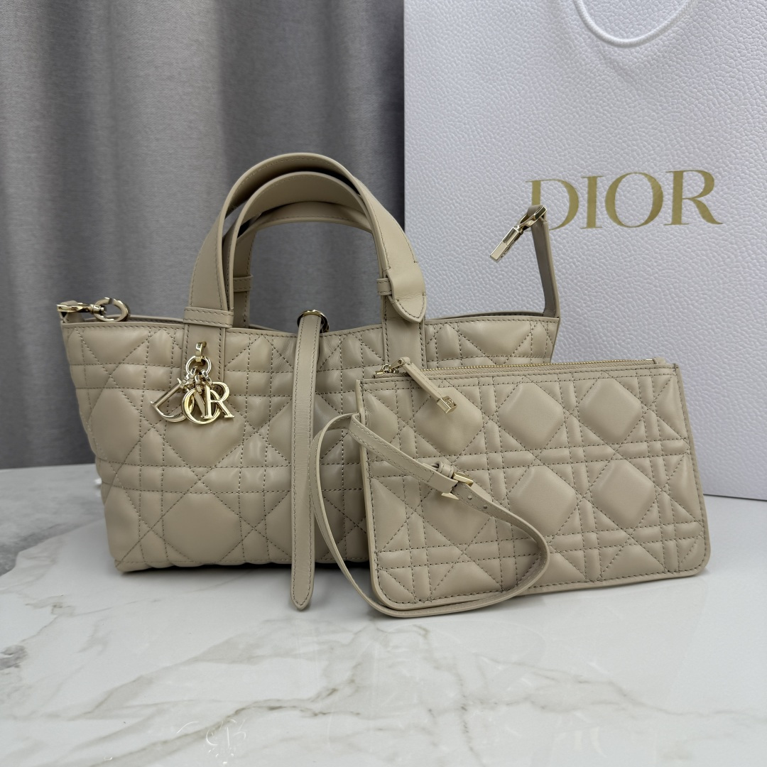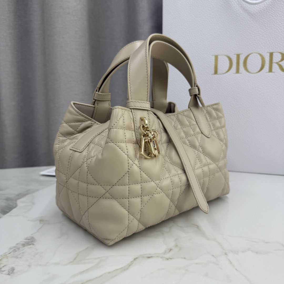 This Dior Toujours handbag made a stunning appearance in the Spring-Summer 2023 collection runway show, featuring a uniquely stylish, casual, and practical design. Meticulously crafted from rouge riz calfskin, it is adorned with oversized cannage stitching. The spacious interior compartment, along with a small pouch, allows for neat organization of various daily essentials. It features a leather tie closure for securely storing items, as well as a CD Lock with the letter 'D' knob closure. The sides are adjustable, enhancing its elegance. This small model includes leather handles with adjustable details, making it suitable for hand carry or shoulder wear.