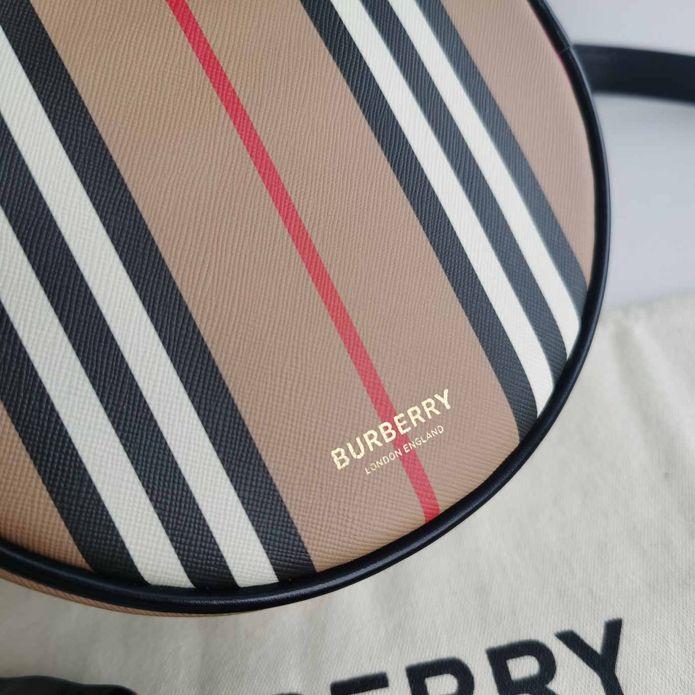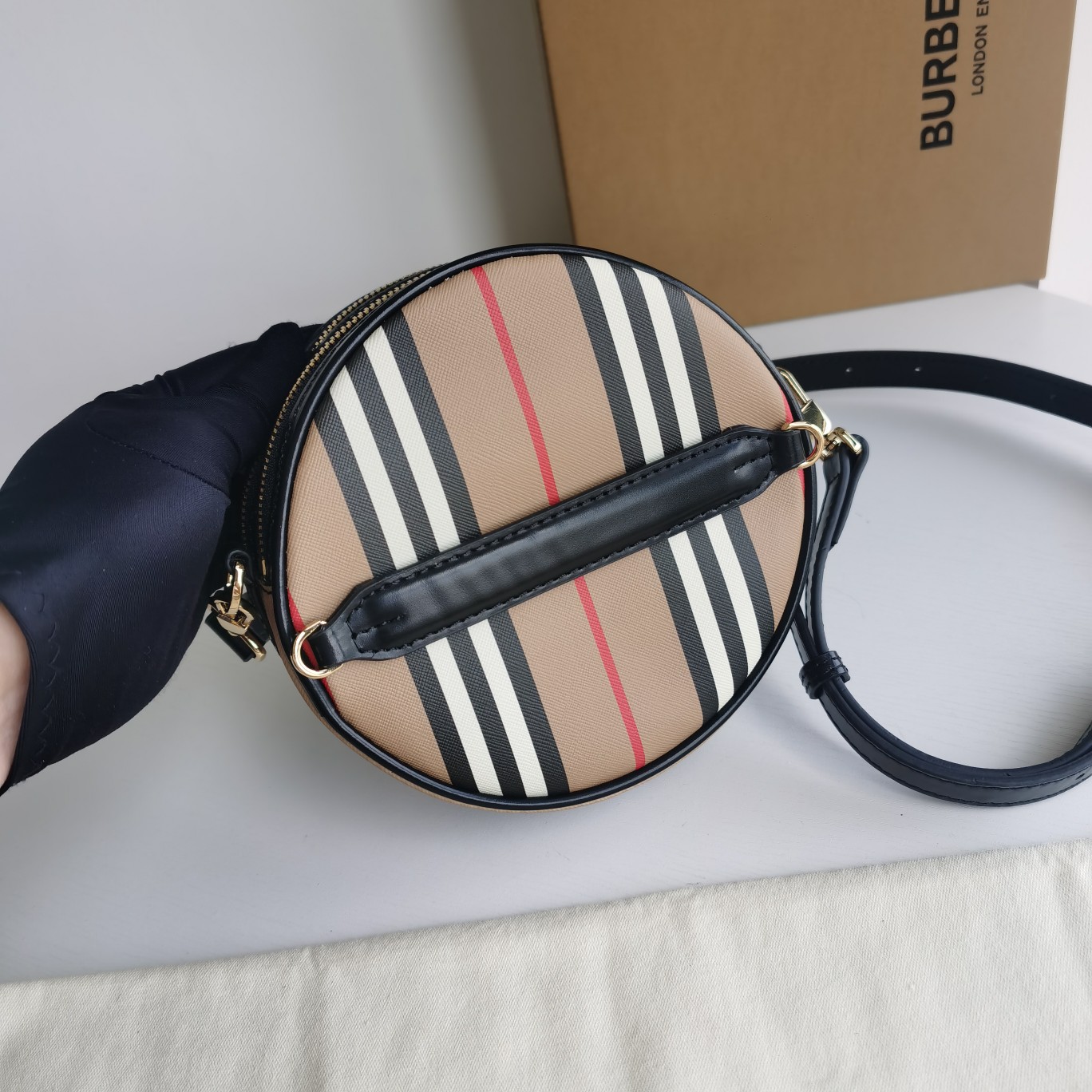 The original Burberry exquisite circular "Louise - Louise bag" is made from the brand's iconic striped eco-friendly canvas. This eco-friendly canvas material primarily utilizes renewable resources for production, requiring less water and generating less carbon dioxide compared to traditional coated canvas. The bag is named after Queen Victoria's daughter, Louise, who was also an artist and an advocate for gender equality. The bag can be worn cross-body, or the strap can be removed to create a clutch style. 17 x 7 x 17cm