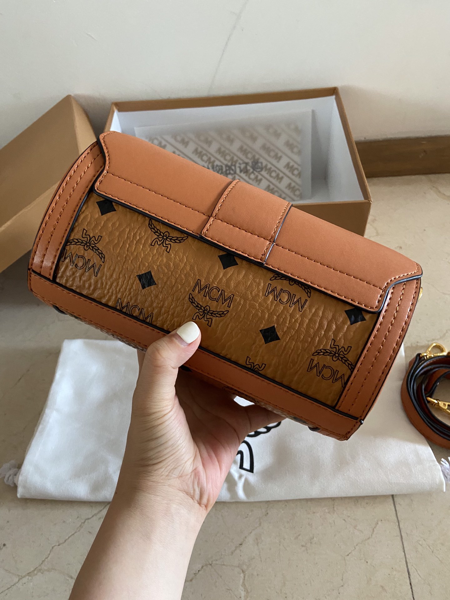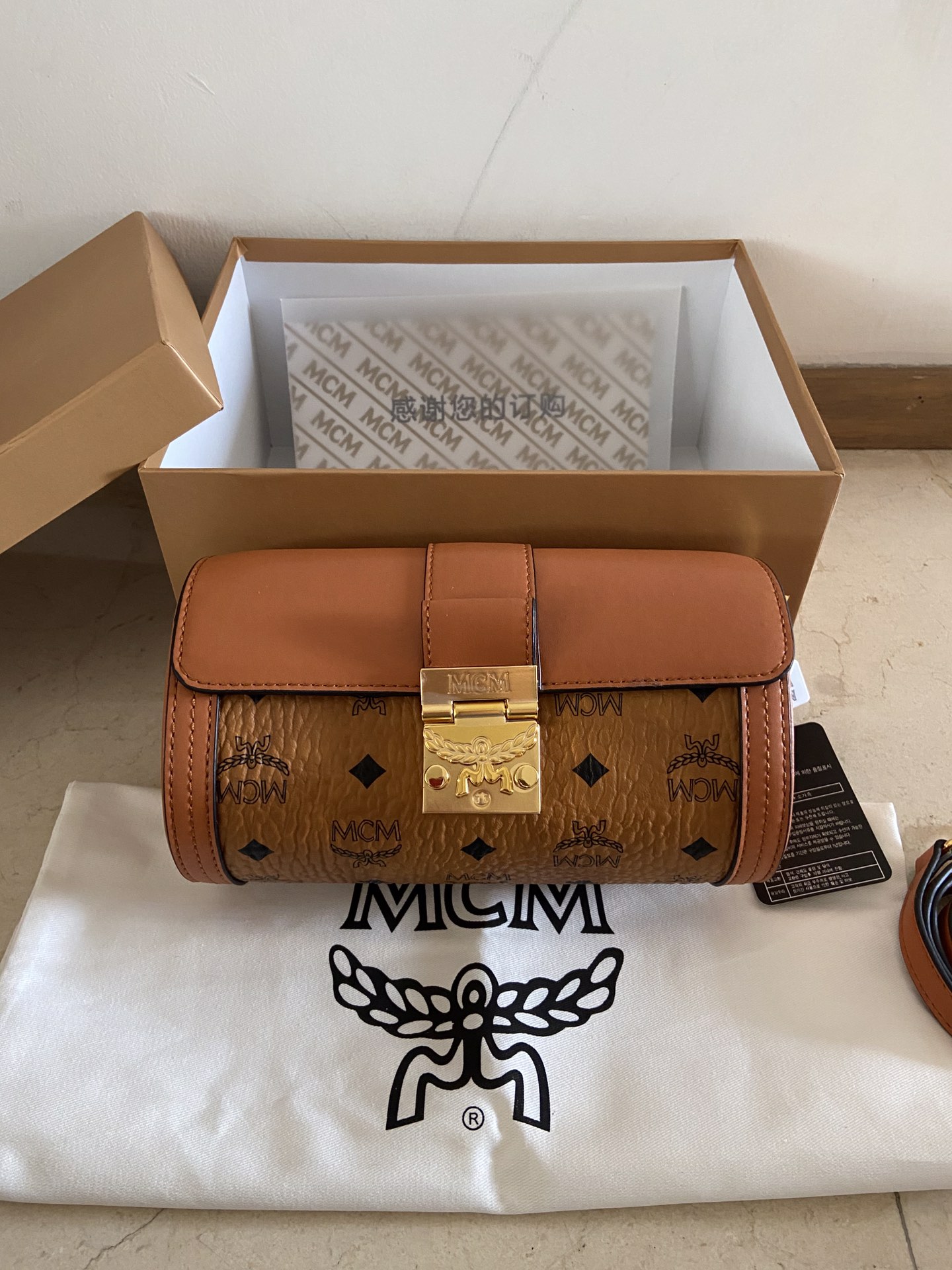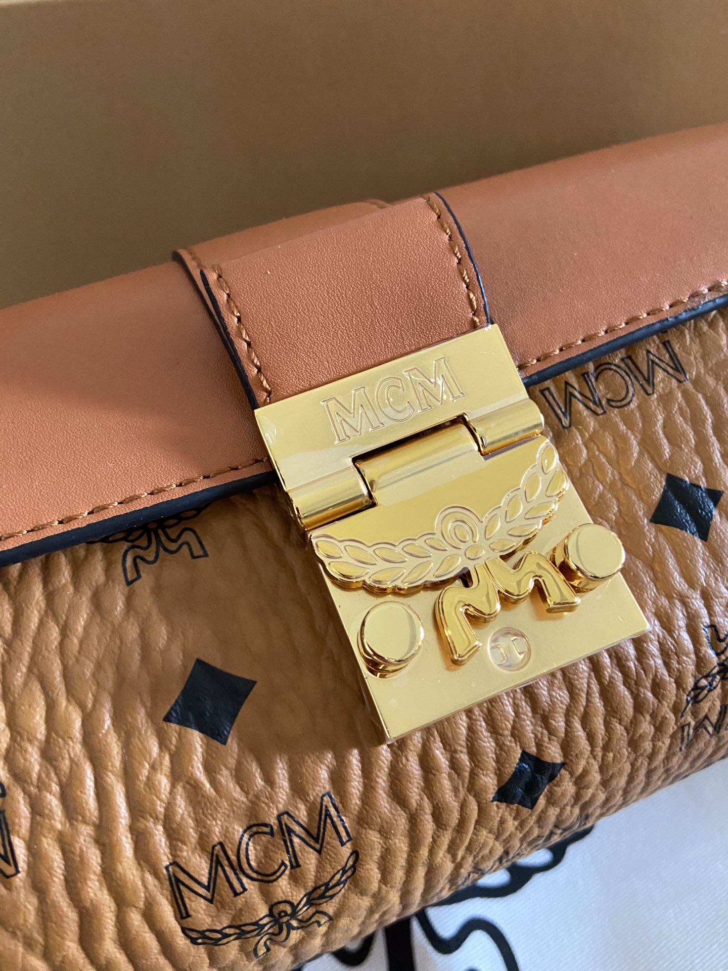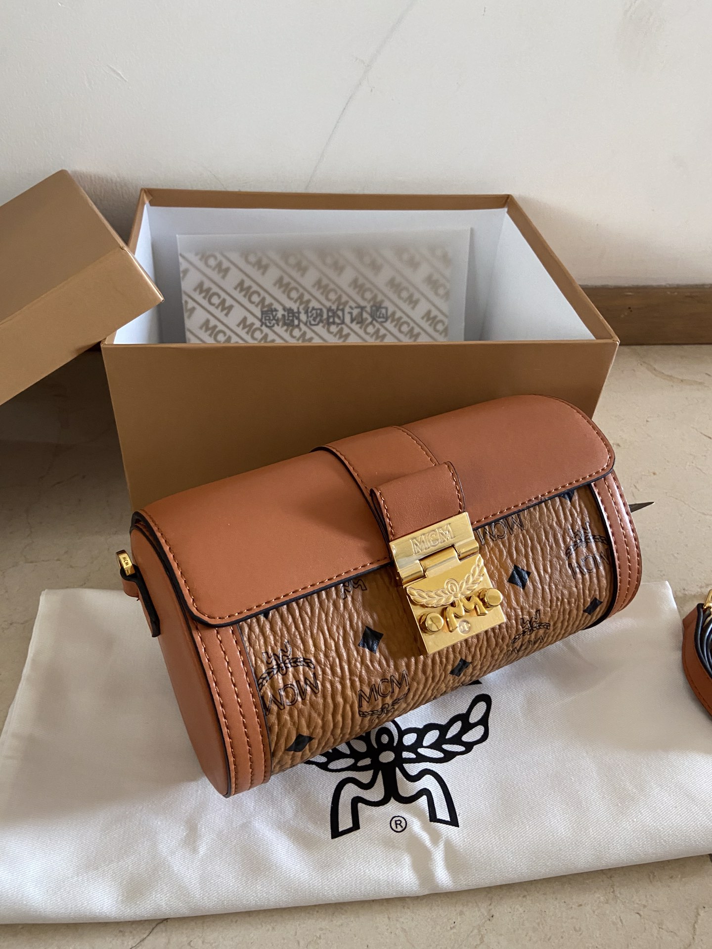 MCM new Small Tracy Visetos crossbody bag, this small crossbody bag appears very lightweight on the wearer. The French Vachetta leather pairs perfectly with the traditional imagery on Visetos. The bag features a metallic tone gilded laurel leaf buckle closure design, ensuring the safety of belongings. The ultra-fiber suede lining inside fully utilizes the dimensions of the tubular design, providing ample space. Dimensions 11-21-10,