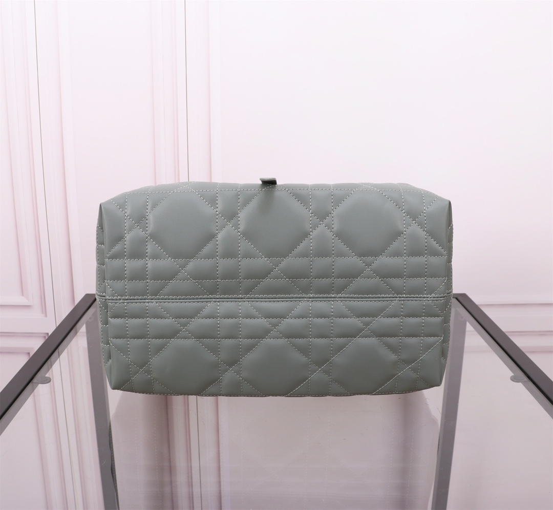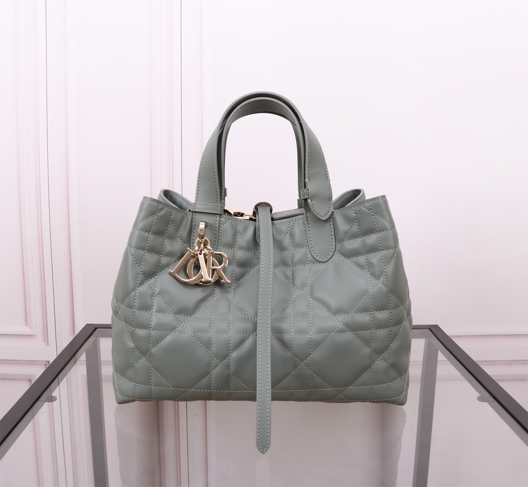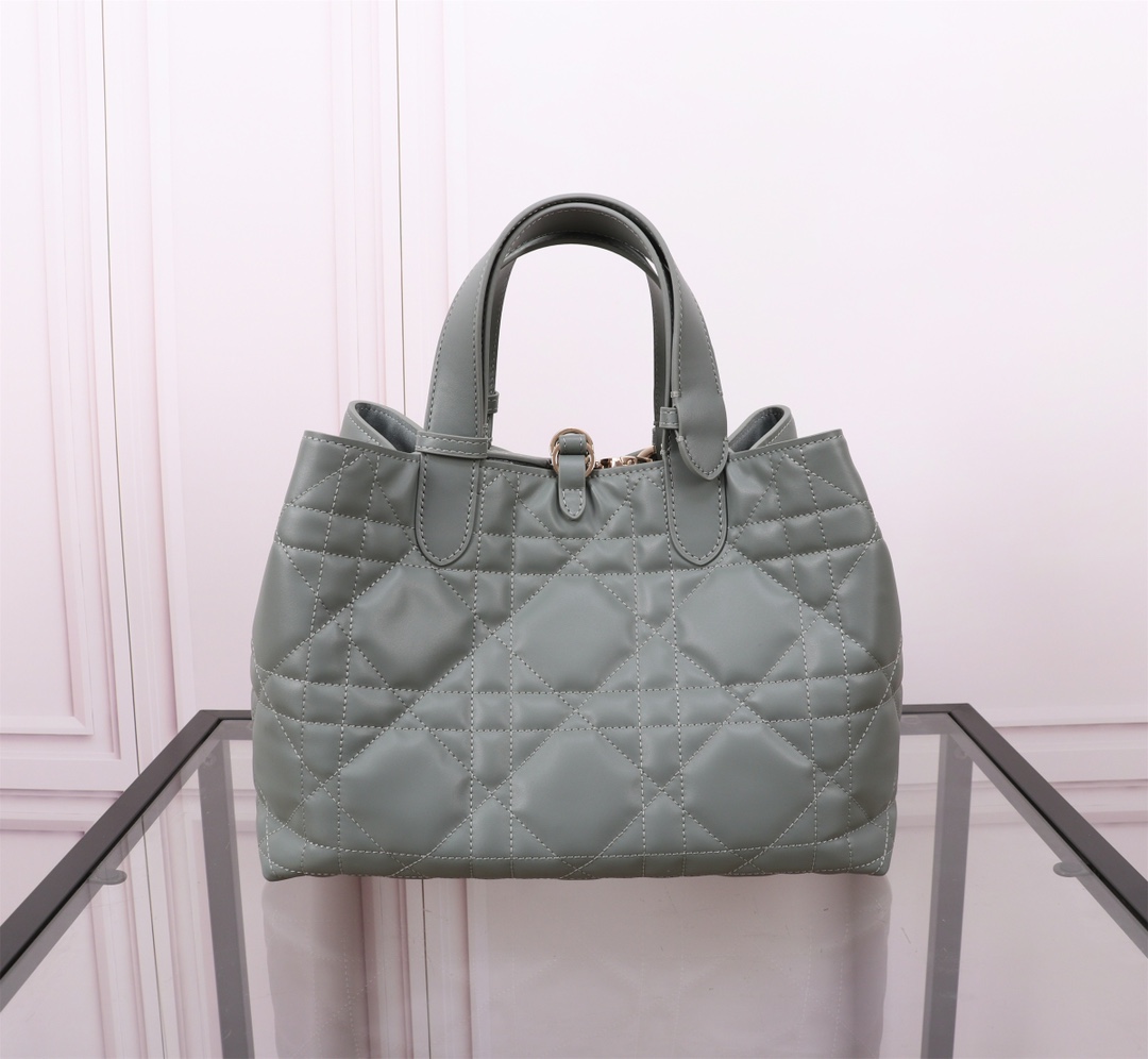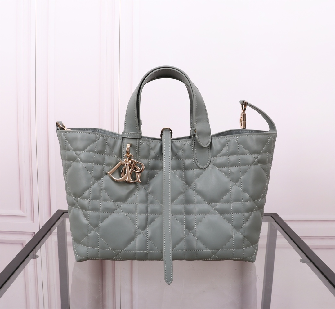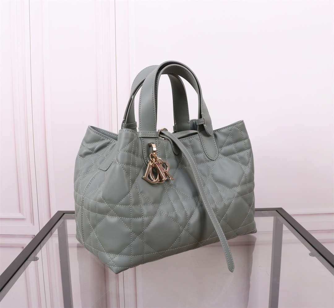 This Dior Toujours bag made a stunning appearance in the Spring-Summer 2023 collection runway show, featuring a uniquely stylish and practical design. Meticulously crafted from gray calfskin, it is adorned with oversized cannage stitching. The spacious interior compartment, along with a small pouch, allows for neat organization of various daily essentials. It features a leather tie closure for securely storing items, as well as a CD Lock with the letter 'D' knob closure, adjustable on both sides to enhance its elegance. The medium style comes with leather handles that have adjustable details, making it suitable for hand carry or shoulder wear.
