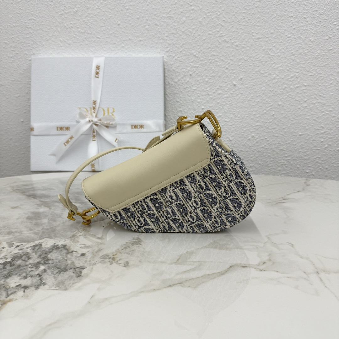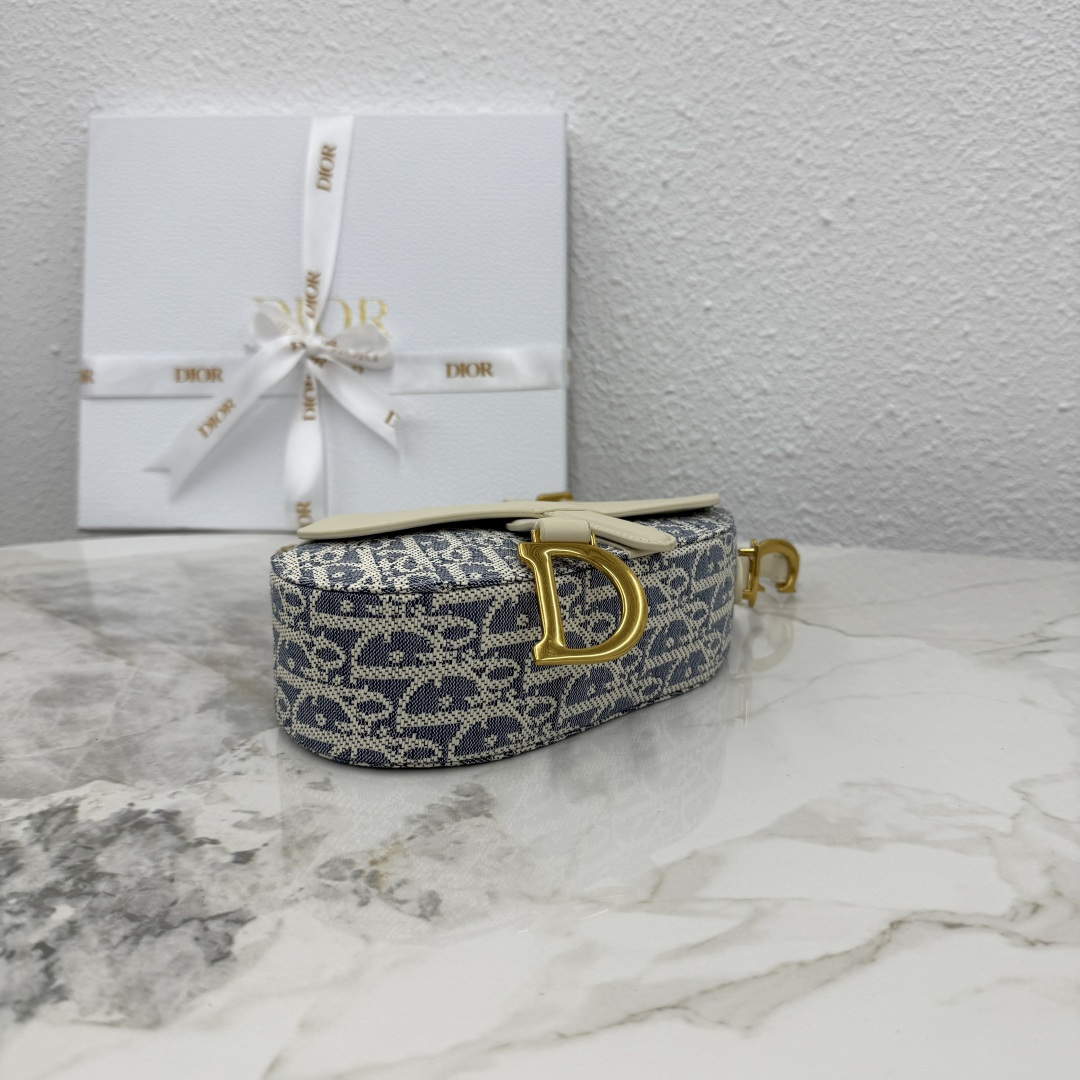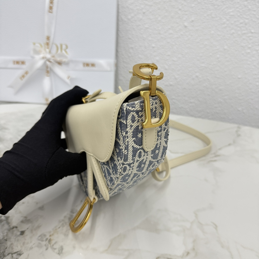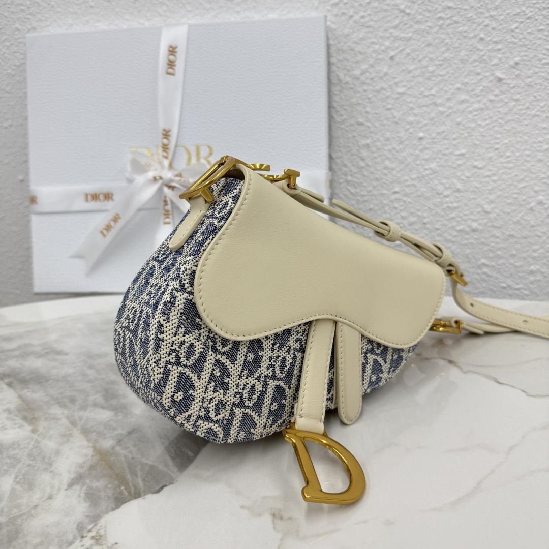This Soft Saddle bag reinterprets the classic Dior design, creating a soft version. It elegantly combines light biscuit-colored smooth calfskin with blue checkered fabric. The lightweight cotton denim is embroidered with durable raffia thread, highlighting the classic Oblique print. Featuring a saddle flap, it is elevated with a strap adorned with a stirrup D-shaped charm and a magnetic pull-tab. The compartment easily stores various daily essentials. The mini style, paired with a thin strap featuring numbered notches, pays homage to the saddle where the adjustable stirrup length maintains a comfortable balance for the rider. It can be carried on the shoulder or cross-body.