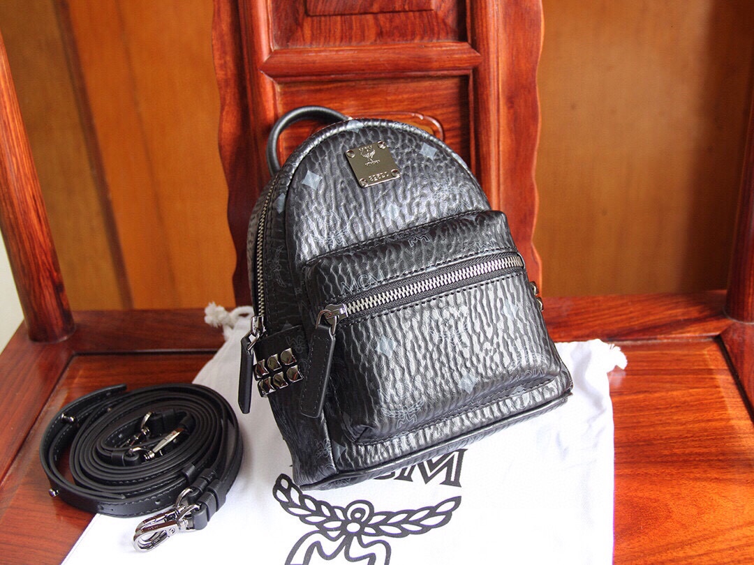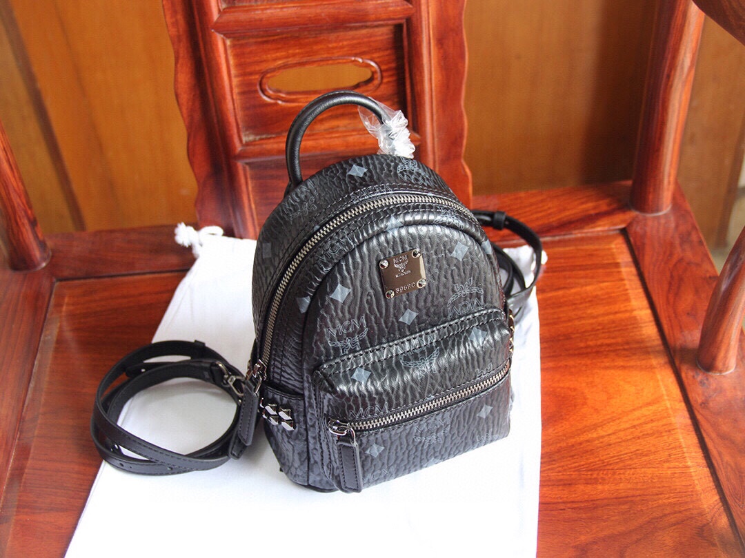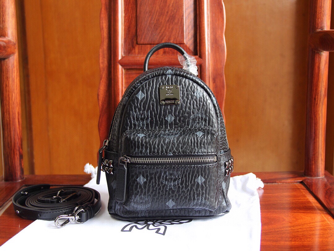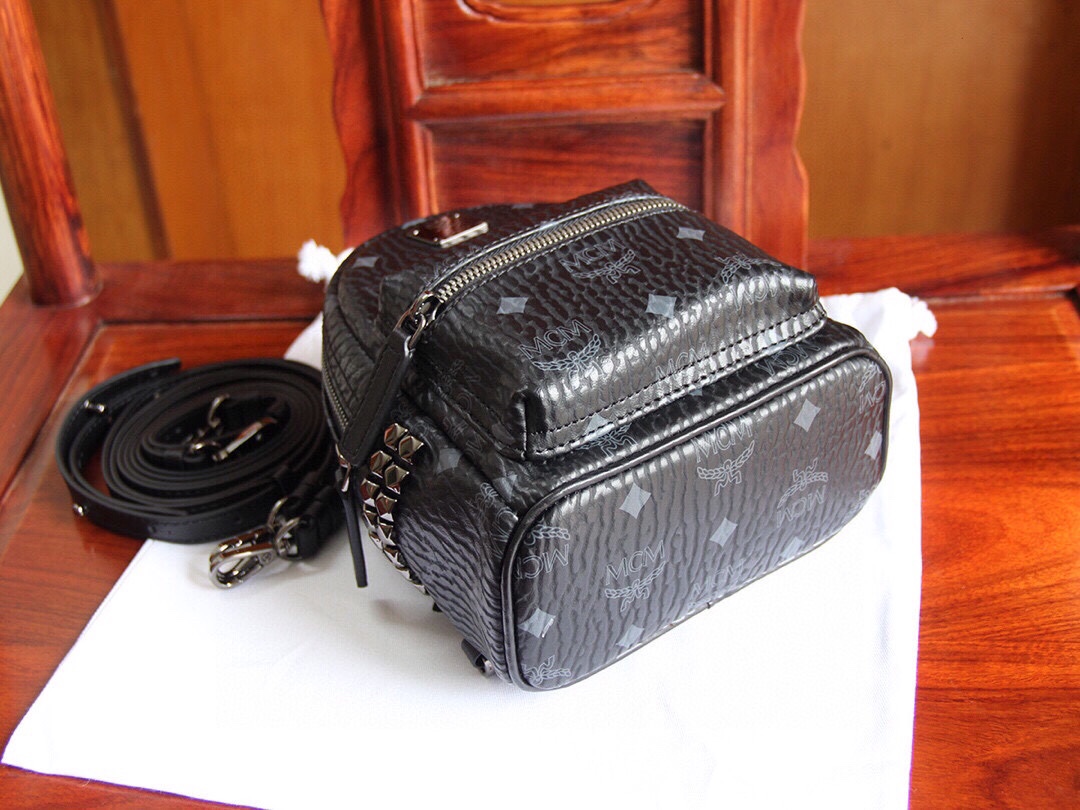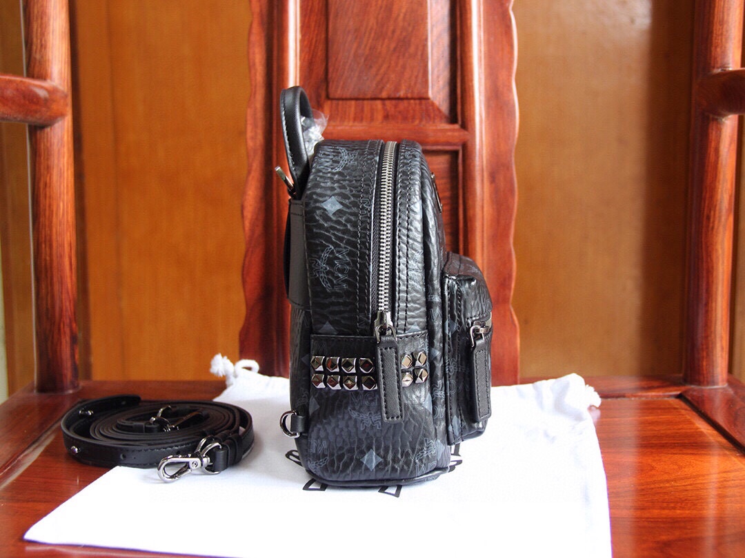 Genuine MCM STARK series side stud ultra mini, classic缩小版, comes with 4 straps (two long and two short). By adjusting the straps, it can easily switch between a crossbody bag, backpack, wristlet, or handbag, offering versatile styles and full compatibility. Made from MCM exclusive leather, combined with high-quality cowhide, and selected premium hardware. Dimensions: 17*21*9cm.