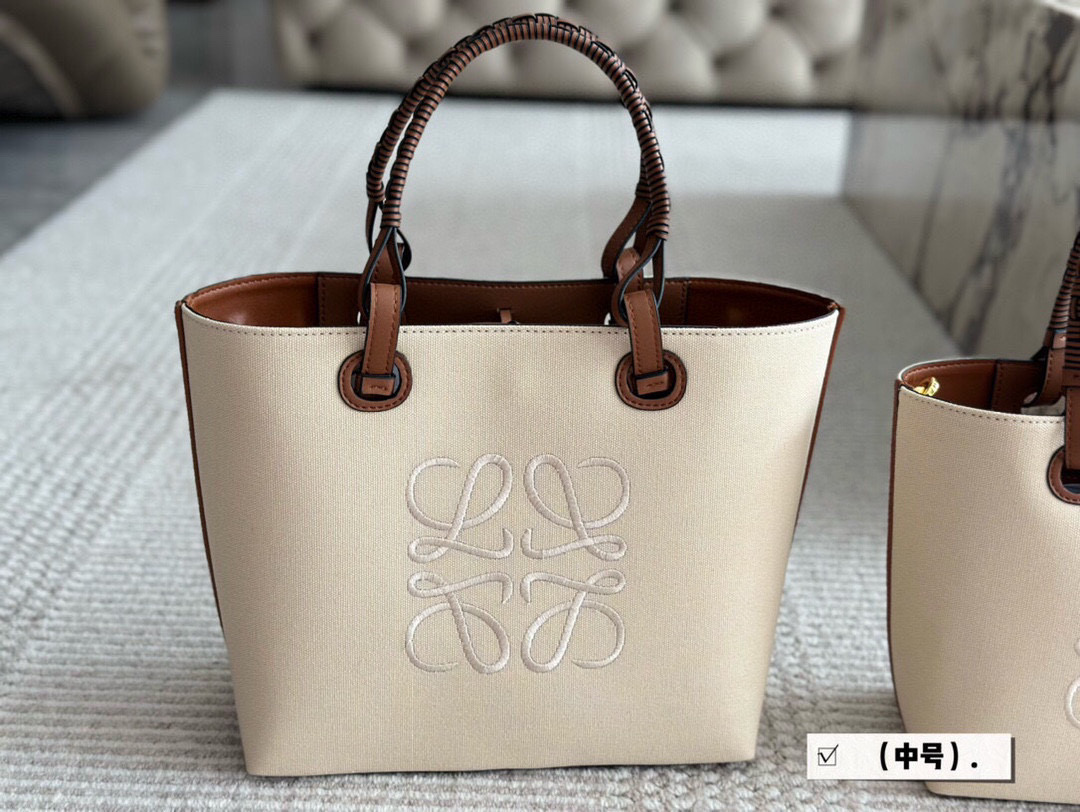 Loewe canvas tote bag, 23*22cm (small) and 27*24cm (medium). Durable brown leather and beige canvas. Spacious and practical for daily use.