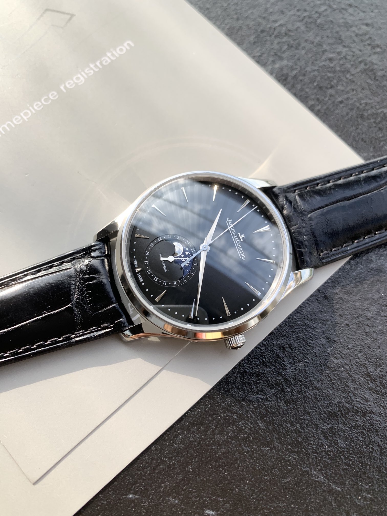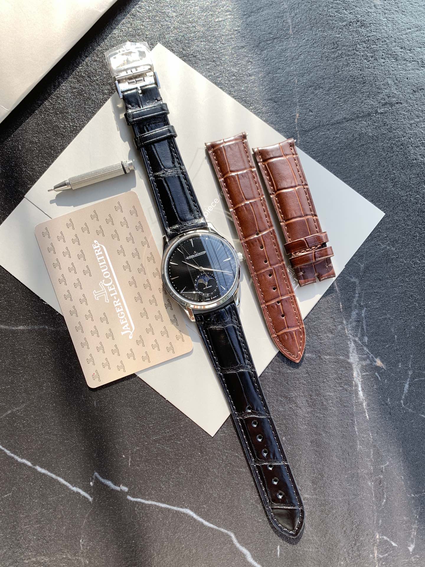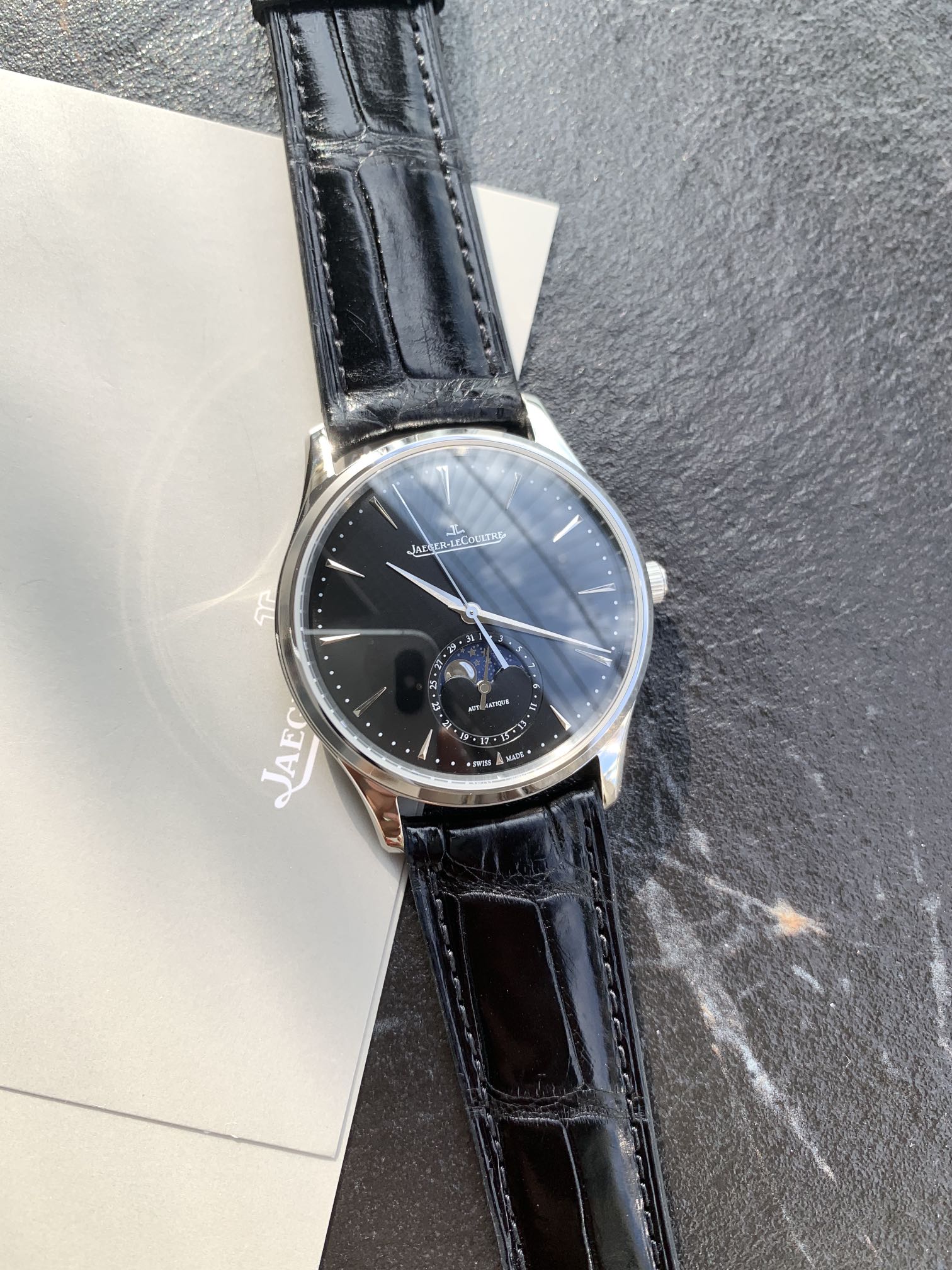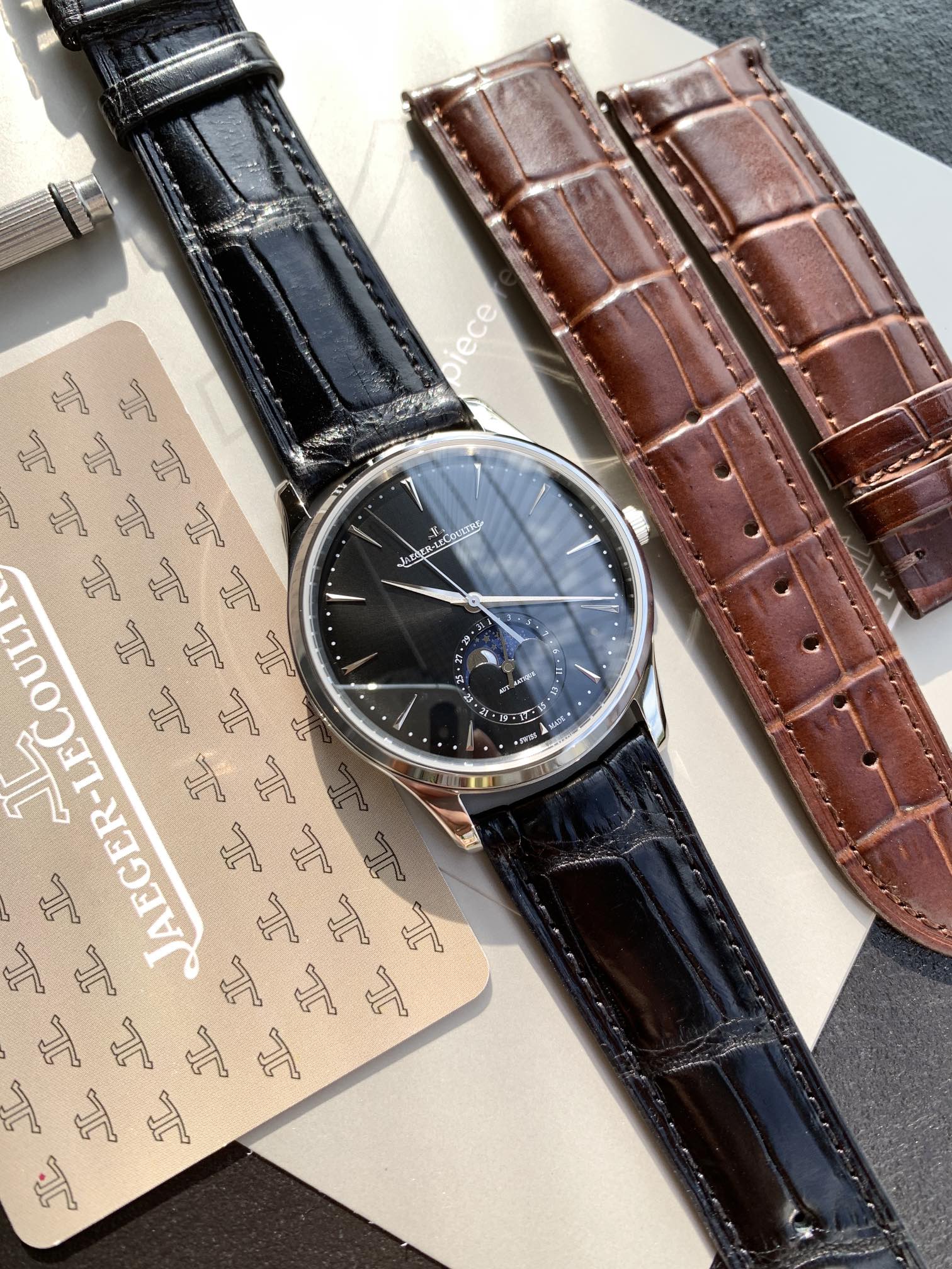Batch Jaeger-LeCoultre Master Moon Phase series, the most cost-effective men's watch Jaeger-LeCoultre Master has arrived! 2021 new edition lets you observe the changes of the moon phase disk. (Case diameter 39mm, thickness 9.9mm) Synchronized with the original. The sub-dial at six o'clock features dual displays for the Gregorian and lunar calendars (moon phase), with the moon phase completing one cycle per month, and functions identical to the genuine product. [Moon Phase Disk] 3D metal moon phase [Movement] Original replica Cal.925/1 integrated movement, with functions 100% synchronized with the original in-house movement, staying true to the初心, each movement undergoes a series of strict tests and screenings before leaving the factory! The appearance also closely follows the original version. Observing the watch dial from the side reveals a slight curvature. To achieve this effect, multiple adjustments to the mold were made, ensuring the charm and feel can rival the original. Jaeger-LeCoultre Ultra-Thin Master, fulfilling all your beautiful sentiments,极致简约, achieving classic status, clean and elegant, the首选 for business!