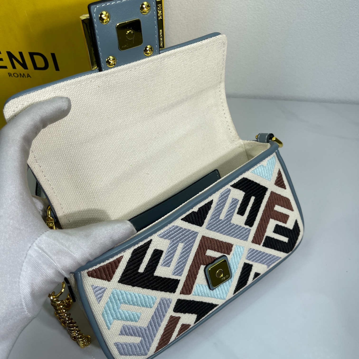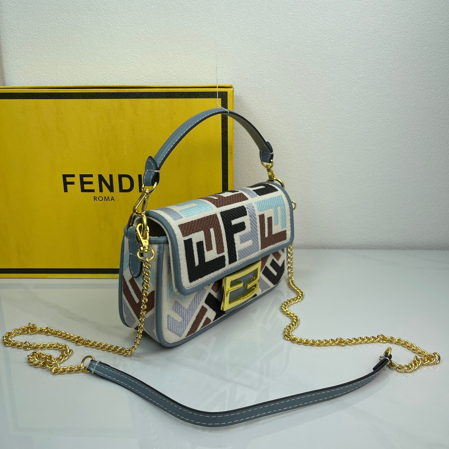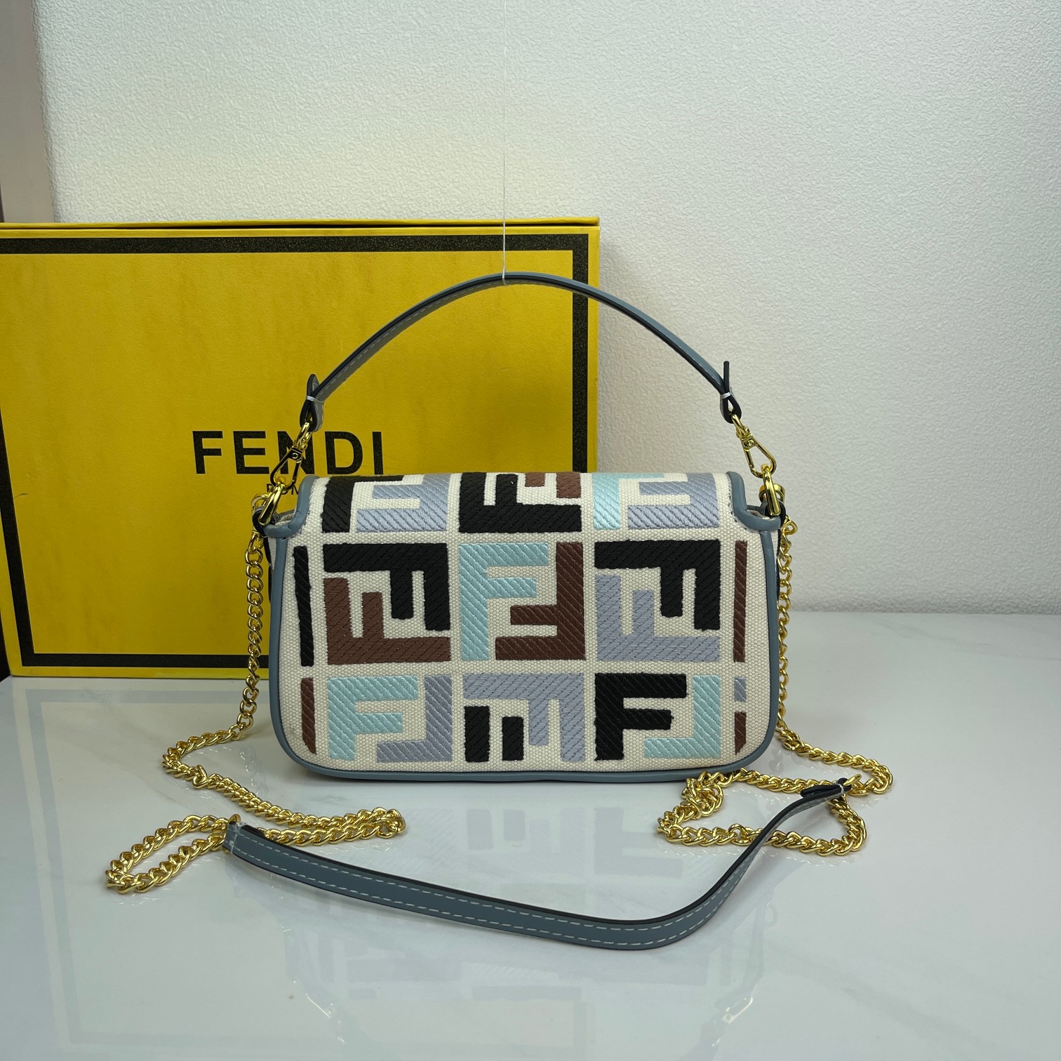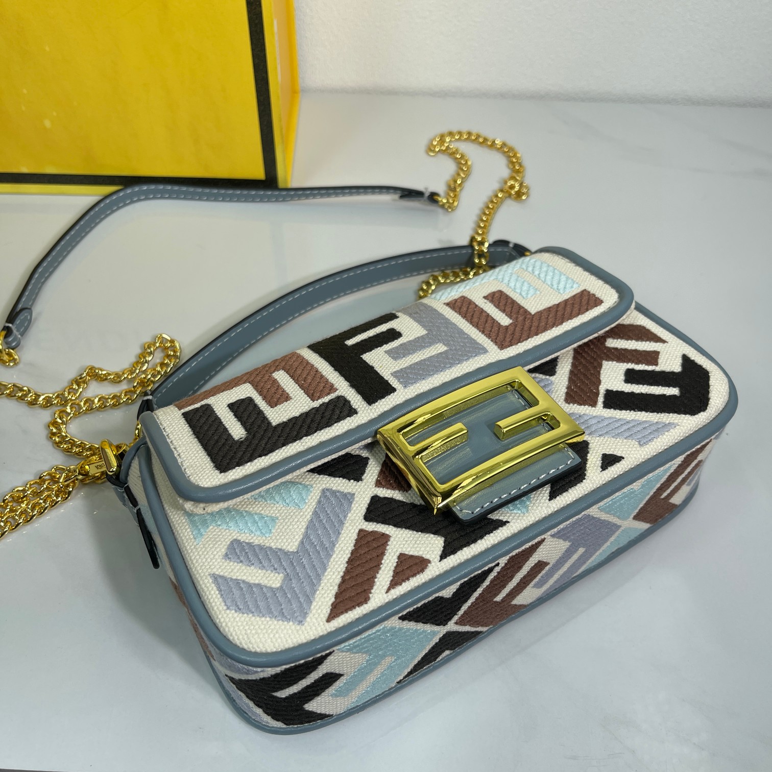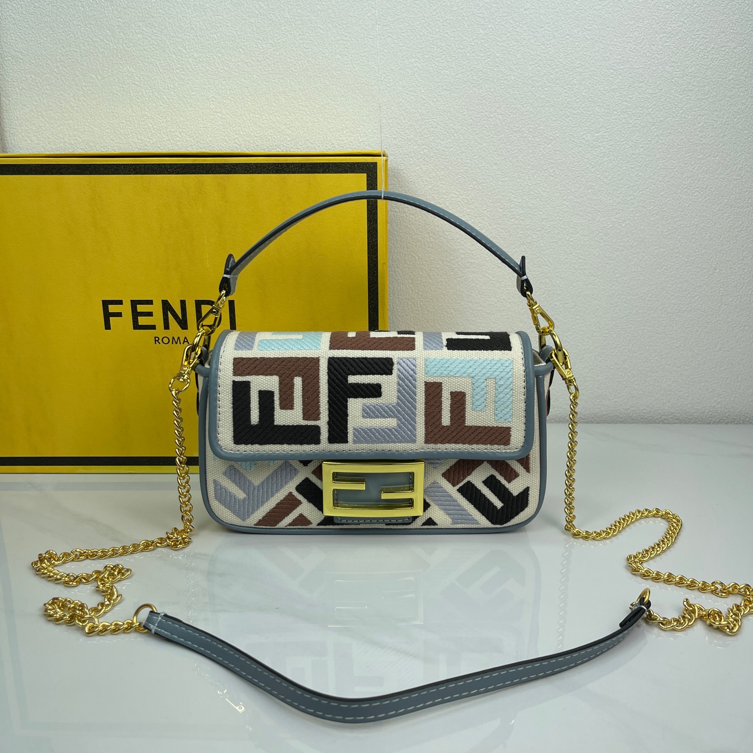 Factory Direct Sales New Color FENDI Small Baguette Popular Classic Baguette The material is made of canvas with advanced craftsmanship, the entire bag features double FF three-dimensional embroidery with an unbeatable texture, paired with exquisite piping and small color contrasts for a more fashionable and stylish look. The wide strap design and flap are highly practical, with small details visible everywhere, really love it~~ size 19×10×4cm style number 2029