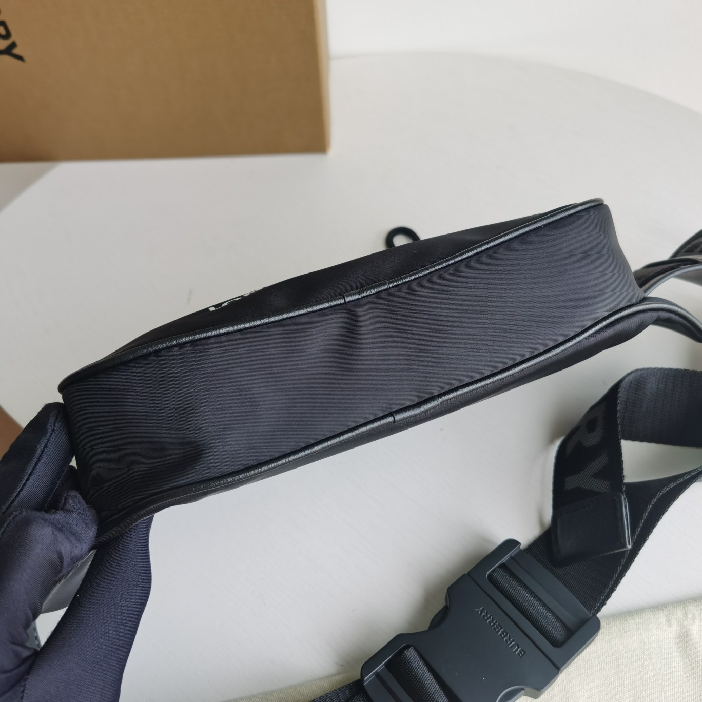Original Burberry waist bag draws inspiration from 1990s street style, crafted from ECONYL® material adorned with logos. ECONYL® is a sustainable nylon fabric made from recycled fishing nets, textile waste, and industrial plastic. Features luxurious leather details, zippered pockets for easy storage of personal items; can be worn crossbody with the strap or attached at the waist. Product Details 24 x 5 x 15cm Outer layer: 90% polyamide (ECONYL®), 10% polyurethane Trim: 100% leather Lining: 100% polyamide Adjustable clip-style waist belt 1 external zippered pocket Zippered closure Shiny metal fittings Product 80146031