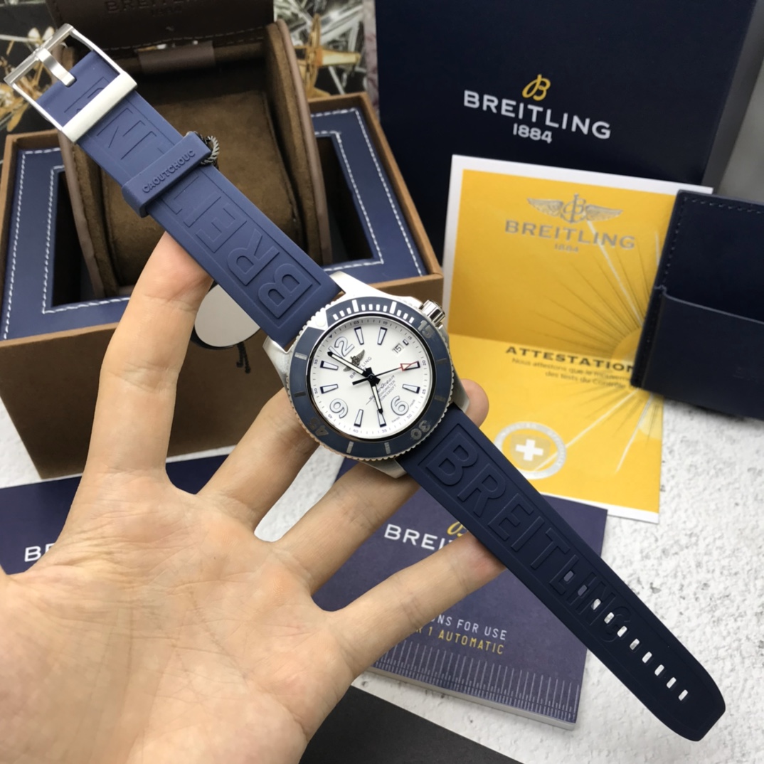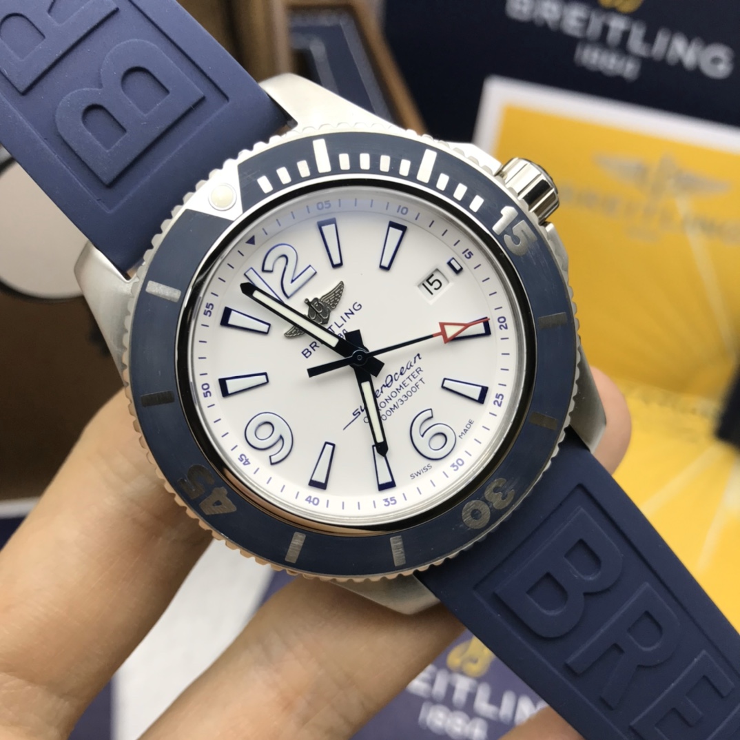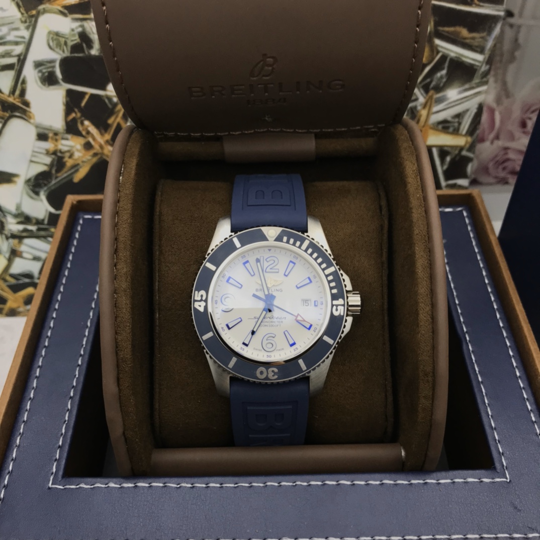 Latest arrival Original Breitling genuine factory authentic Breitling Superocean automatic mechanical watch, fresh, colorful, and sporty, specially designed for men who pursue卓越 performance and modern style. A sense of power, functionality, and cool contemporary style outline the classic image of the Breitling ocean. It features a sturdy 44mm stainless steel case, a ratcheted unidirectional bezel, and is equipped with an original Swiss ETA2824 automatic mechanical movement. The curved sapphire crystal is anti-reflective on both sides. Channel warehousing, price and style are absolutely stunning,专柜售万+, comes with full original packaging for shipment.