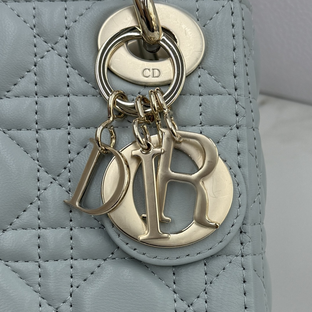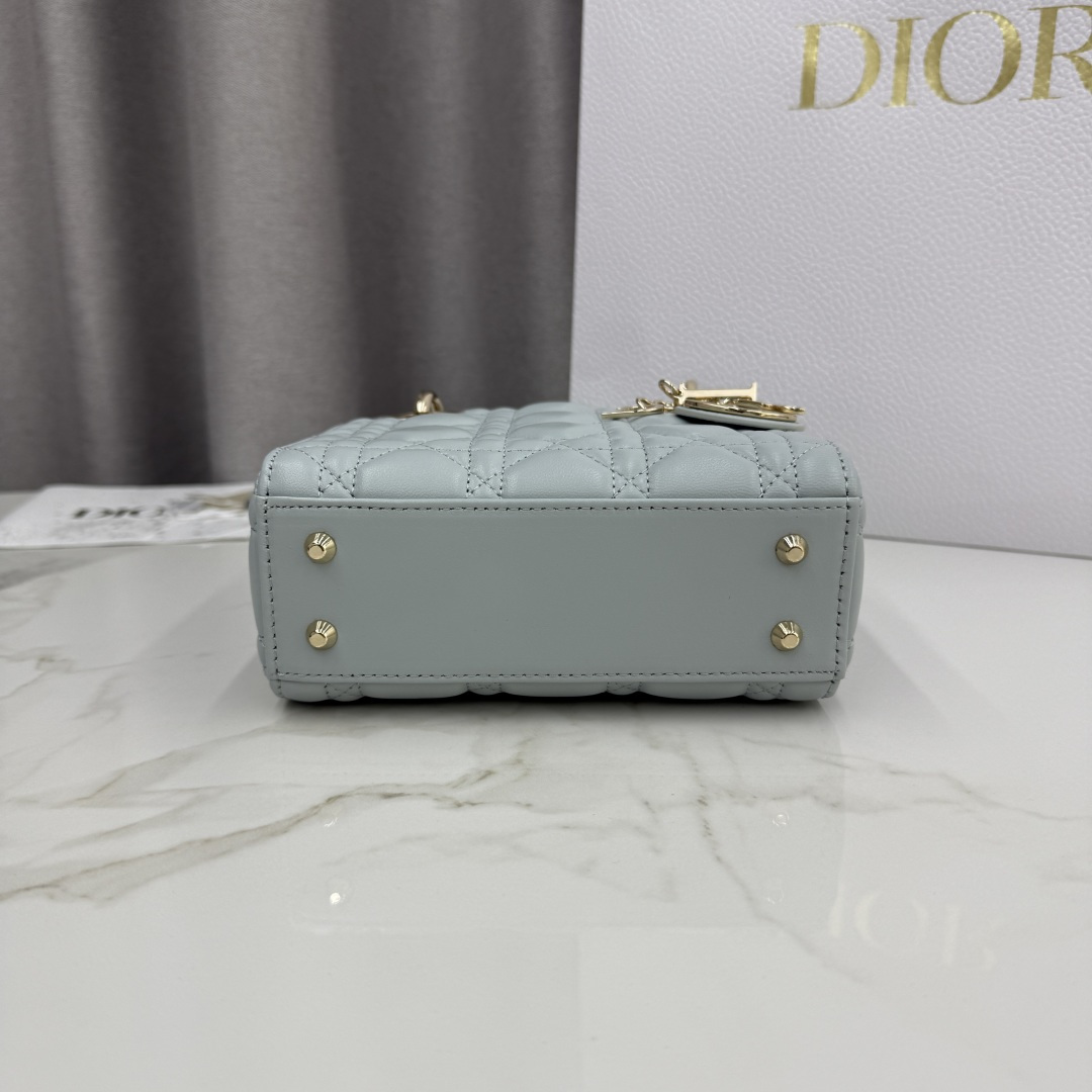 This Lady Dior handbag embodies Dior's profound insight into elegance and beauty. Meticulously crafted from lake blue lambskin, it features classic and eye-catching quilted texture with cannage stitching, presenting a timeless and elegant design. Adorned with a light gold-finished metal D.I.O.R. charm, it adds a touch of dynamism to the exquisite silhouette. The mini style comes with a detachable chain shoulder strap, allowing it to be carried by hand or cross-body, making it an ideal companion for evening wear.