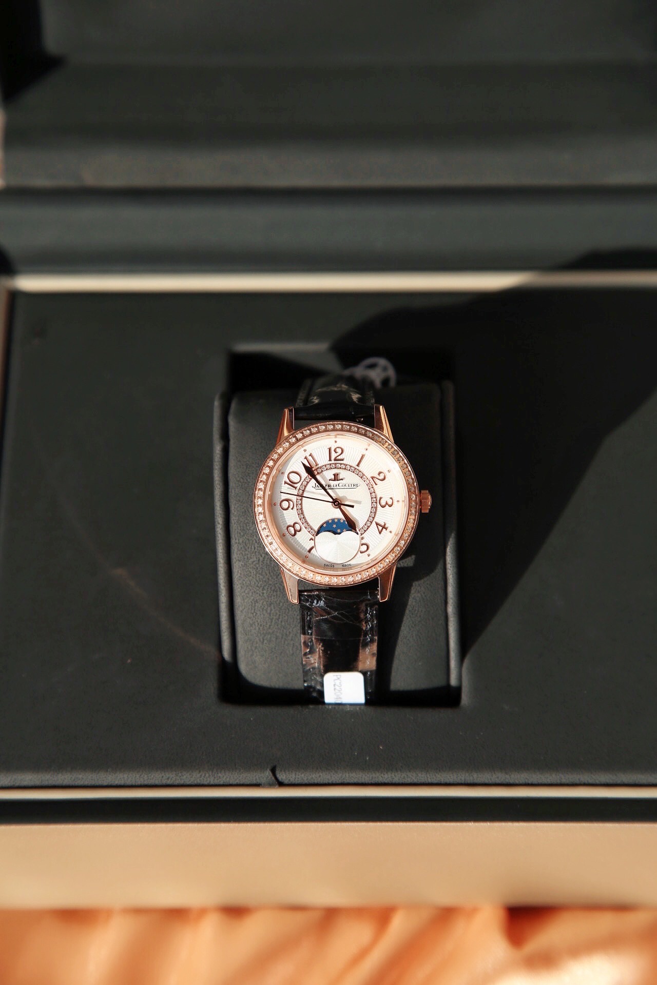 ————Jaeger-LeCoultre Rendez-Vous Collection watch romantically debuts. Model: 3572430. The soft, radiant gradient dial presents differently from various angles! The electric hands shine brilliantly in the sunlight! Surrounded by a circle of exquisite diamonds. The delicate electric hands sweep past the ornate hour markers and the day/night display window, creating a dream where starlight and sunlight reflect each other. Carving time into sparkling diamonds; turning life into a rendez-vous heading towards dreams.