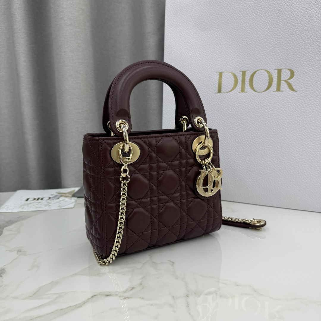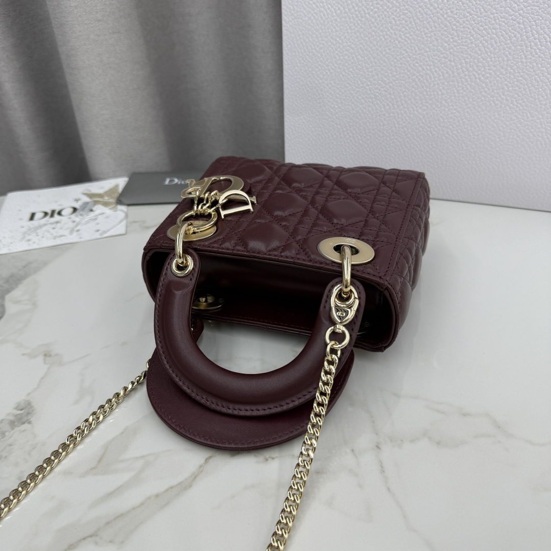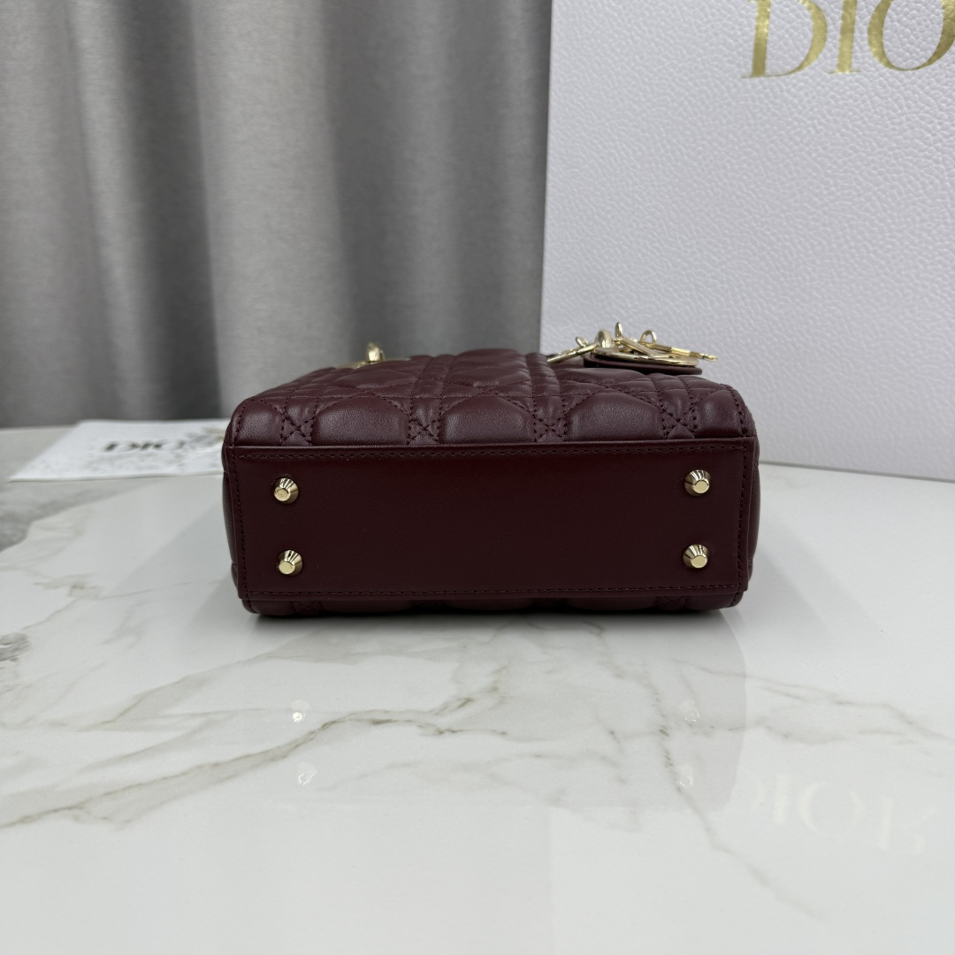 This Lady Dior handbag embodies Dior's profound insight into elegance and beauty. Meticulously crafted from burgundy lambskin, it features classic and eye-catching quilted texture with cannage stitching, presenting a timeless and elegant design. Adorned with a light gold-finish metal D.I.O.R. charm, it adds a touch of dynamism to the exquisite silhouette. The mini style, equipped with a detachable chain strap, can be carried by hand or across the body, making it an ideal companion for evening wear.
