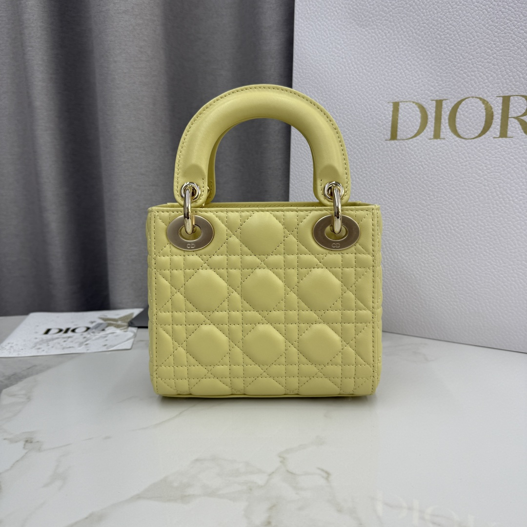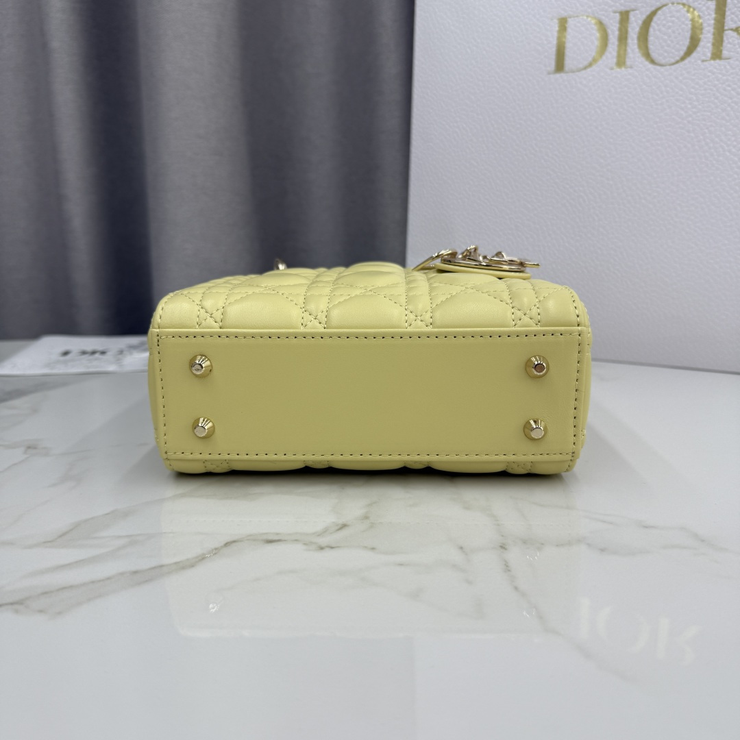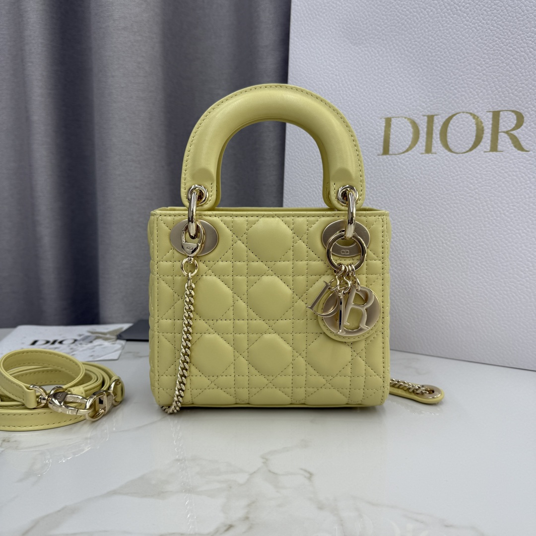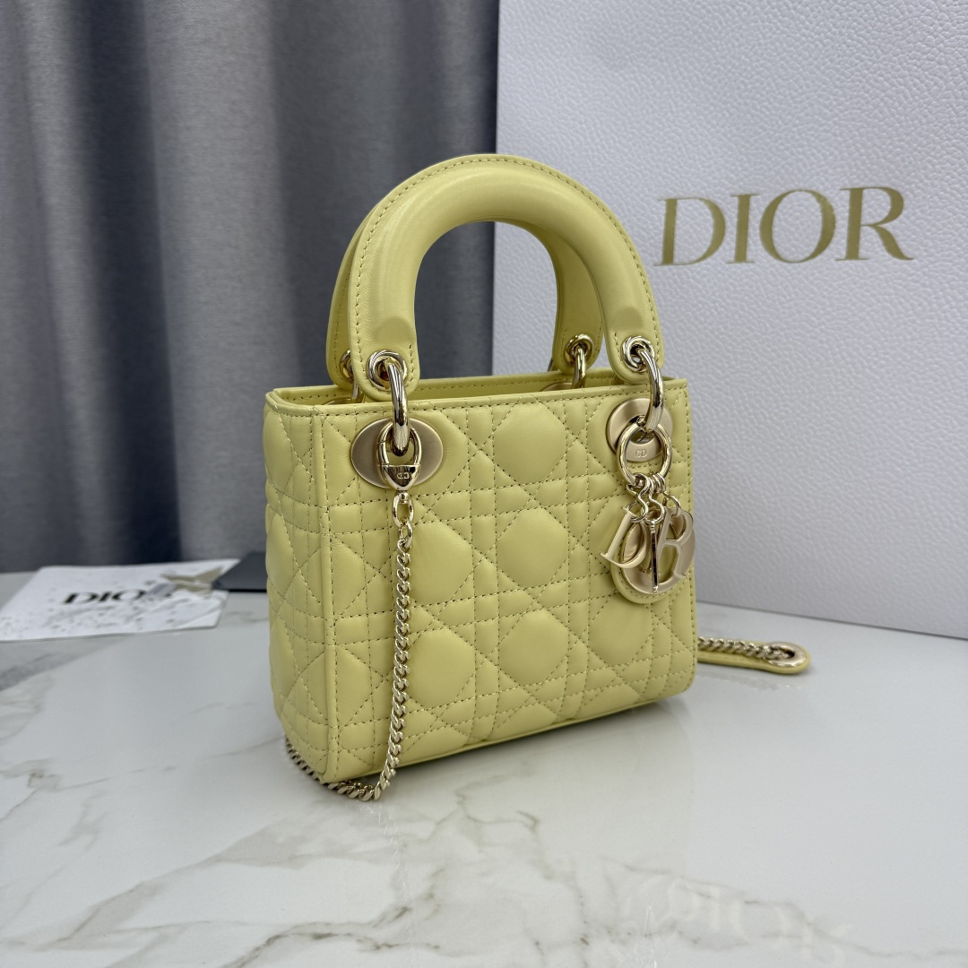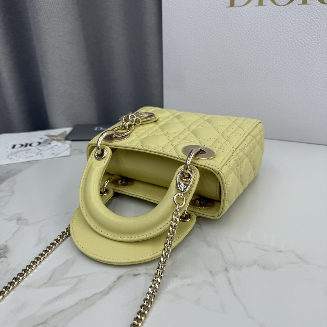 This Lady Dior bag embodies Dior's profound insight into elegance and beauty. Meticulously crafted from yellow lambskin, it features the iconic and eye-catching quilted texture with cannage stitching, presenting a timeless and elegant design. Adorned with a light gold-finished metal D.I.O.R. charm, it adds a touch of dynamism to the exquisite silhouette. The mini style comes with a detachable chain strap, allowing it to be carried by hand or worn cross-body, making it an ideal companion for evening wear.