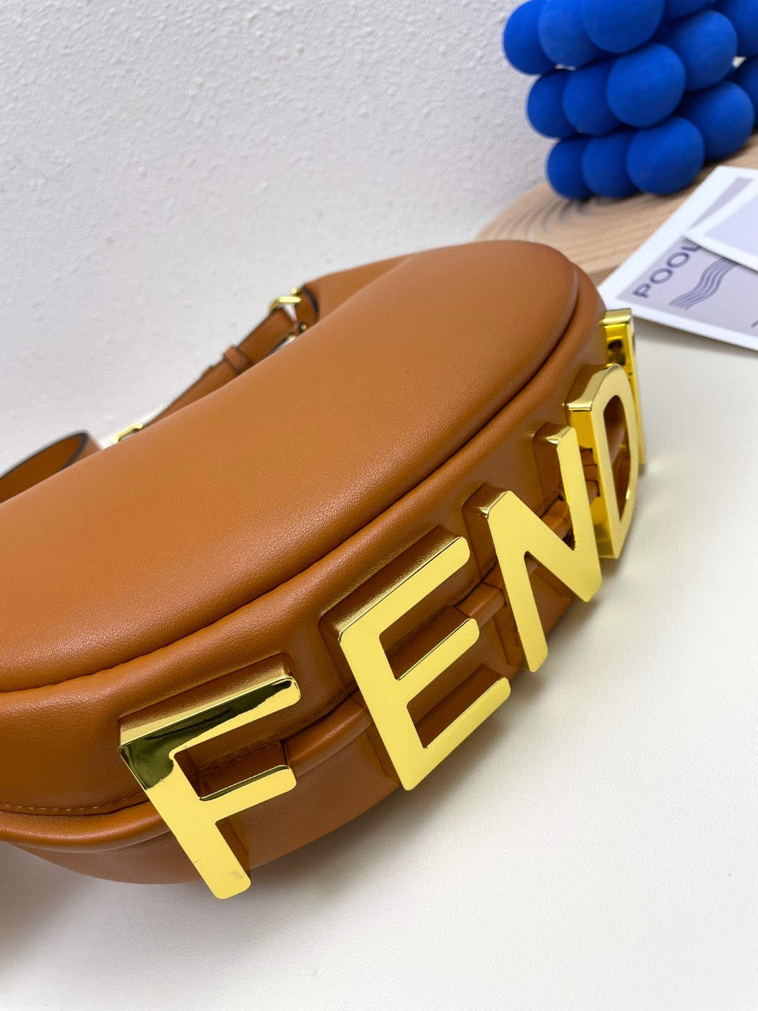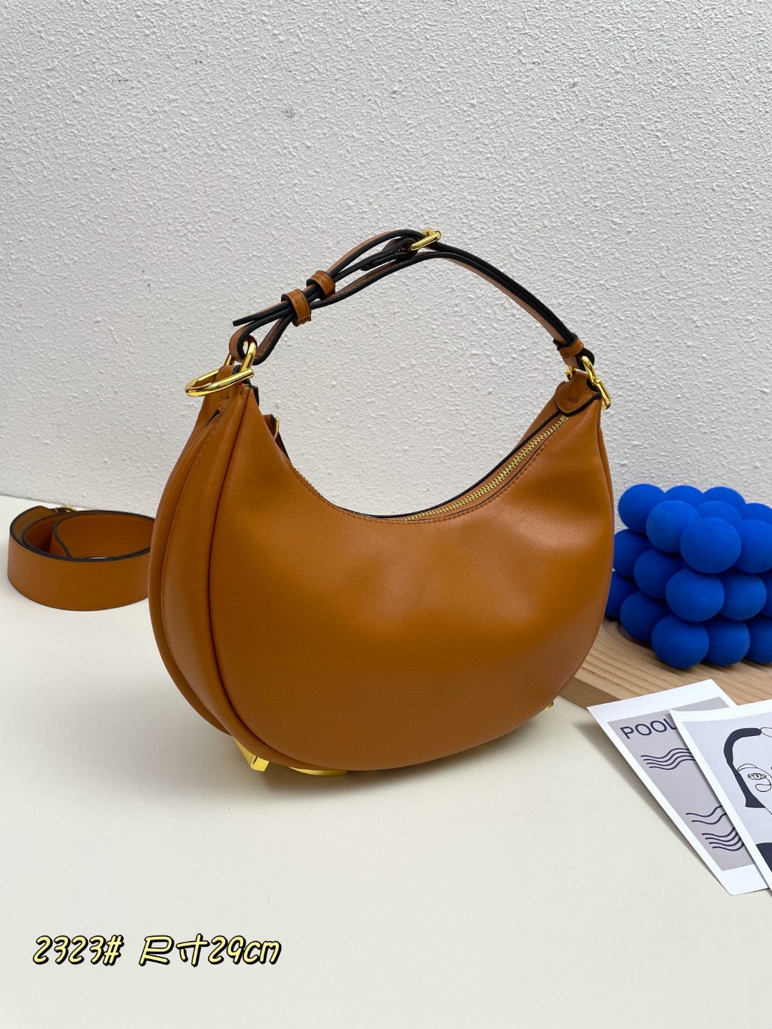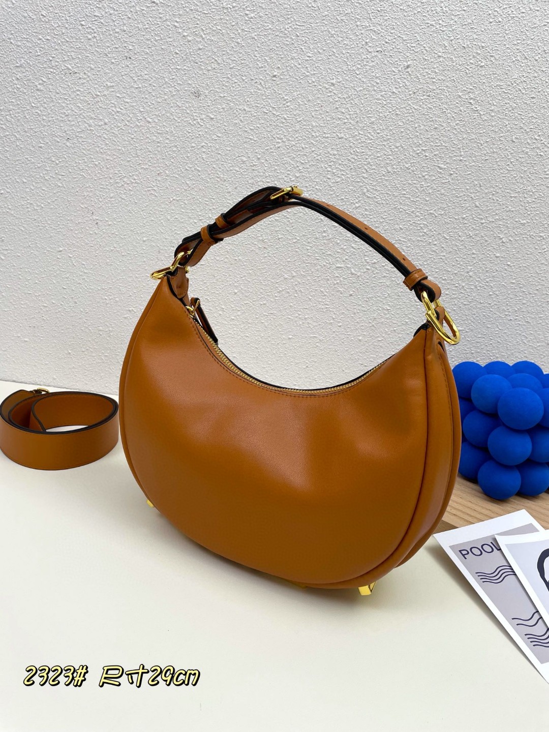 Factory direct sales clearance price Original order FEND1 praphy underarm bag featuring a crescent moon design, with the classic large metal logo: FEND1 letters decorating the bottom of the bag. The bag's contour fits the body's lines perfectly, offering a full sense of fashion when worn under the arm. The new season icon showcases a bold, standout silhouette with distinct layers and elegant, unique charm. Made of soft calfskin, it feels incredibly good to the touch. Simple style with ample capacity! It's simply a walking grass-planting machine! Comes with an adjustable and detachable wrist strap and a full leather wide shoulder strap, can be worn under the arm or as a single shoulder crossbody bag!