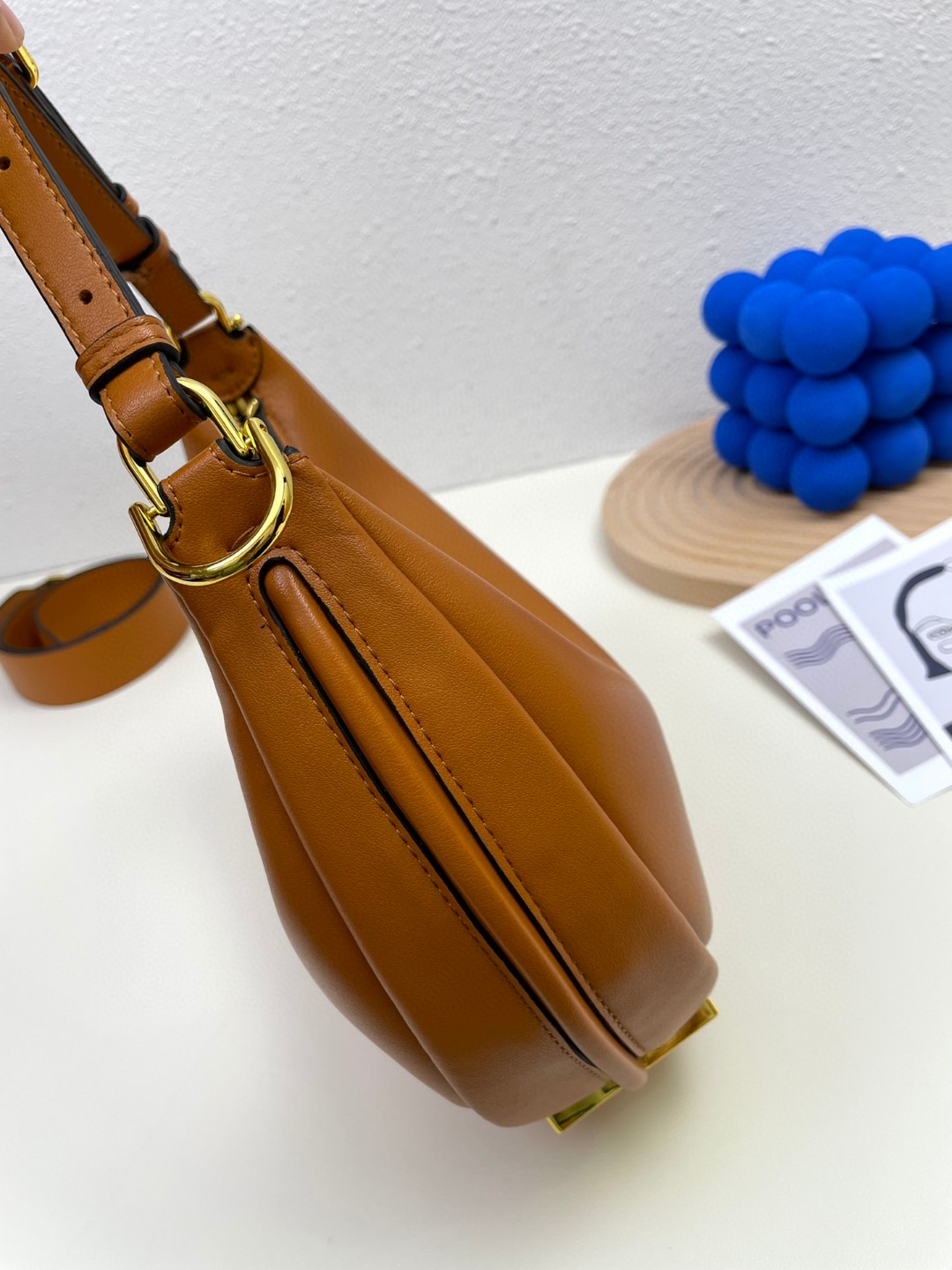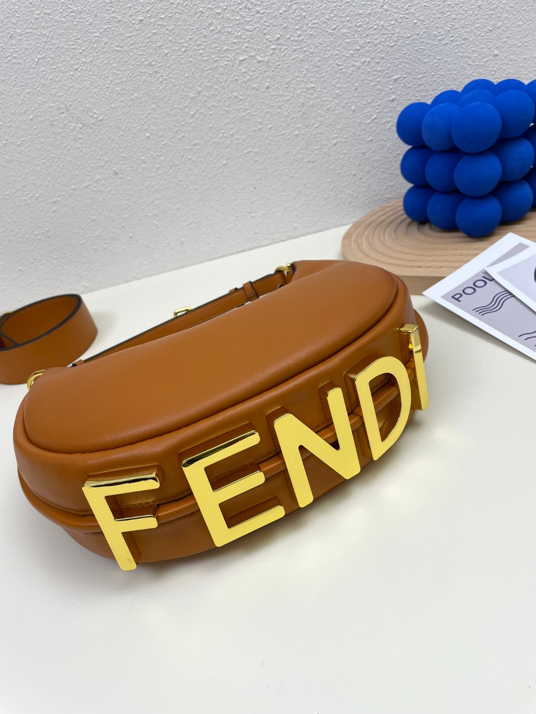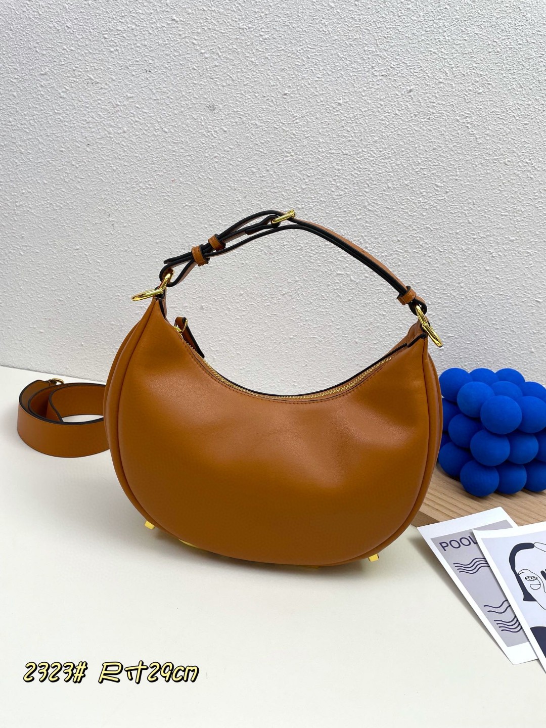 Factory direct sales clearance price Original order FEND1 praphy underarm bag featuring a crescent moon design, with the classic large metal logo: FEND1 letters decorating the bottom of the bag. The bag's contour fits the body's lines perfectly, offering a full sense of fashion when worn under the arm. The new season icon showcases a bold, standout silhouette with distinct layers and elegant, unique charm. Made of soft calfskin, it feels incredibly good to the touch. Simple style with ample capacity! It's simply a walking grass-planting machine! Comes with an adjustable and detachable wrist strap and a full leather wide shoulder strap, can be worn under the arm or as a single shoulder crossbody bag!