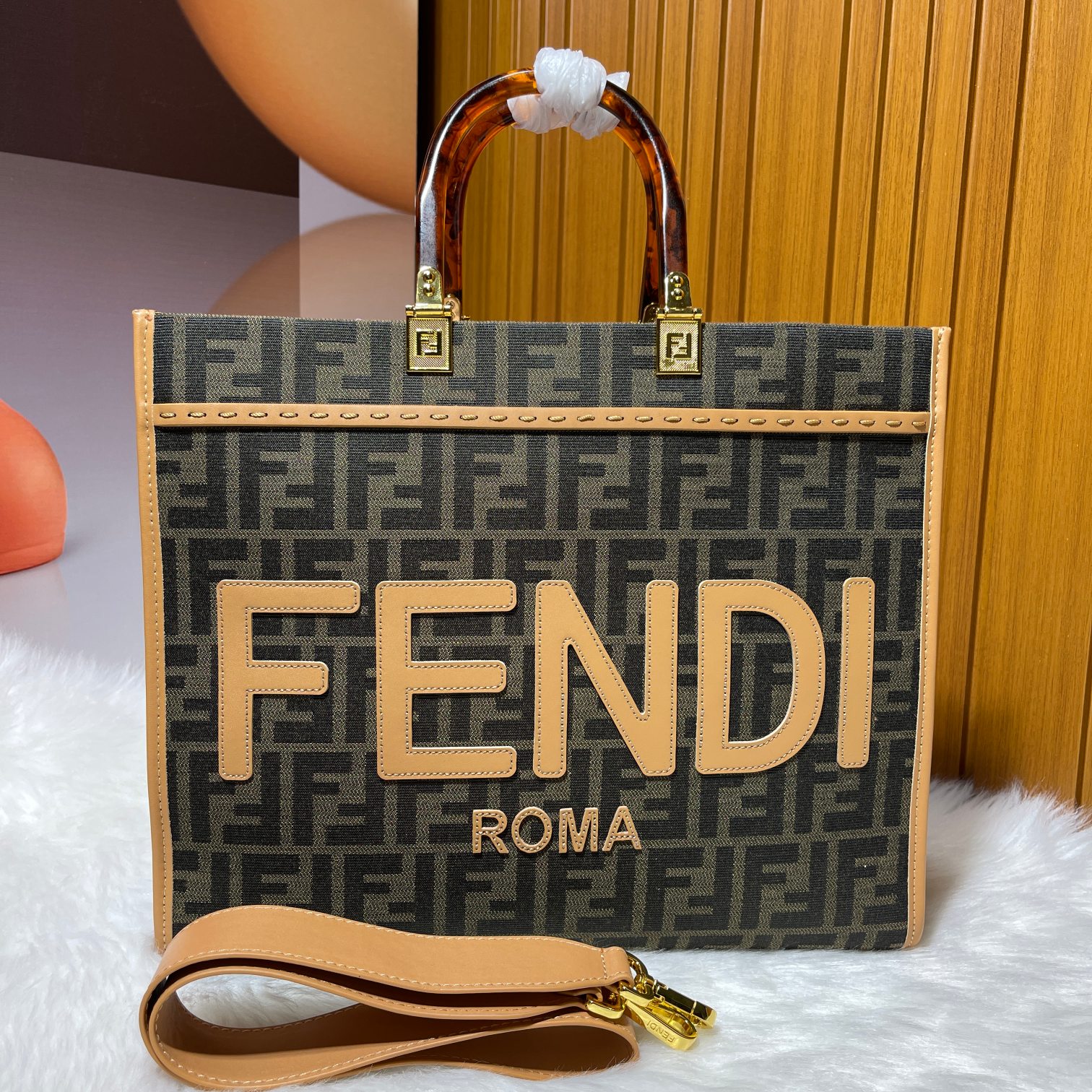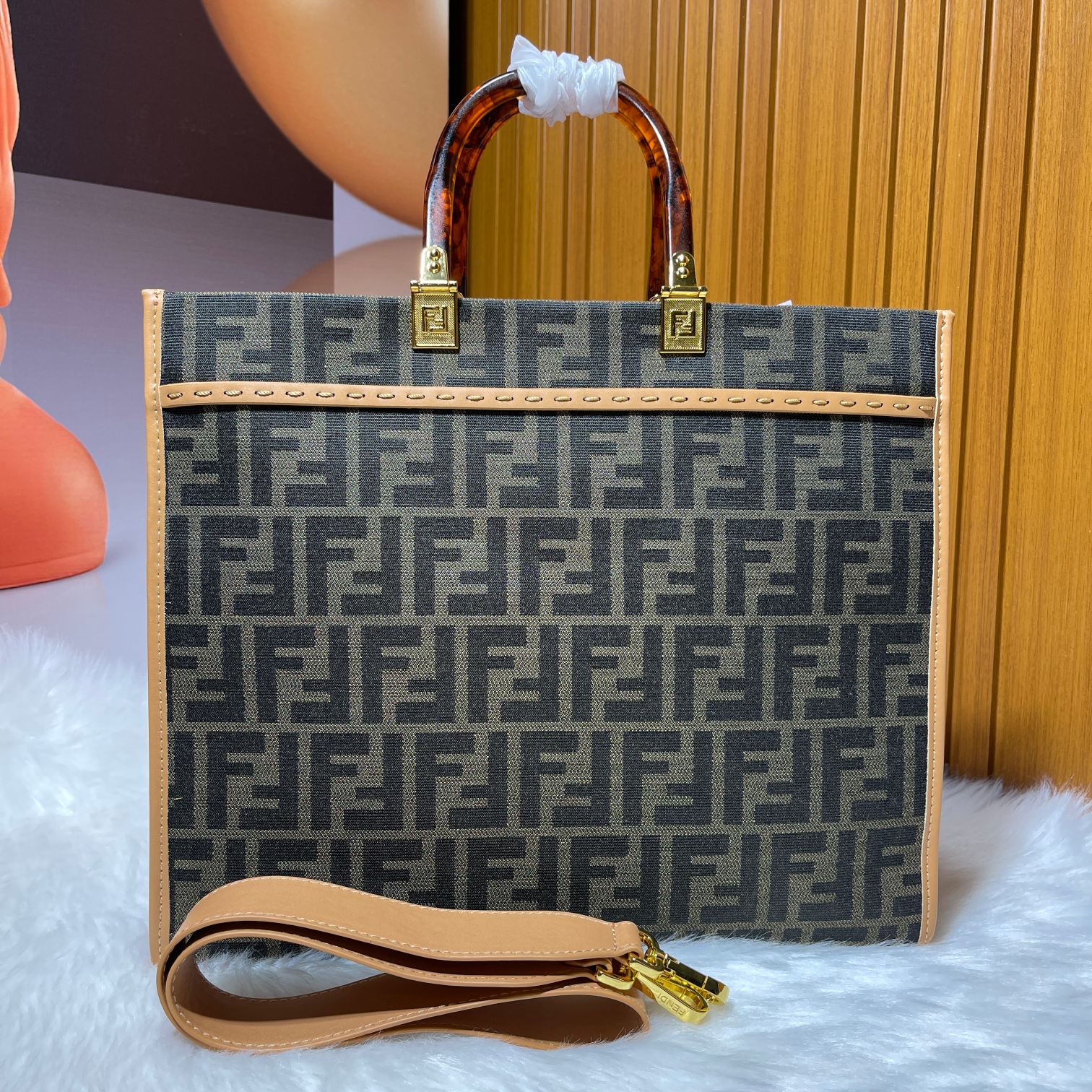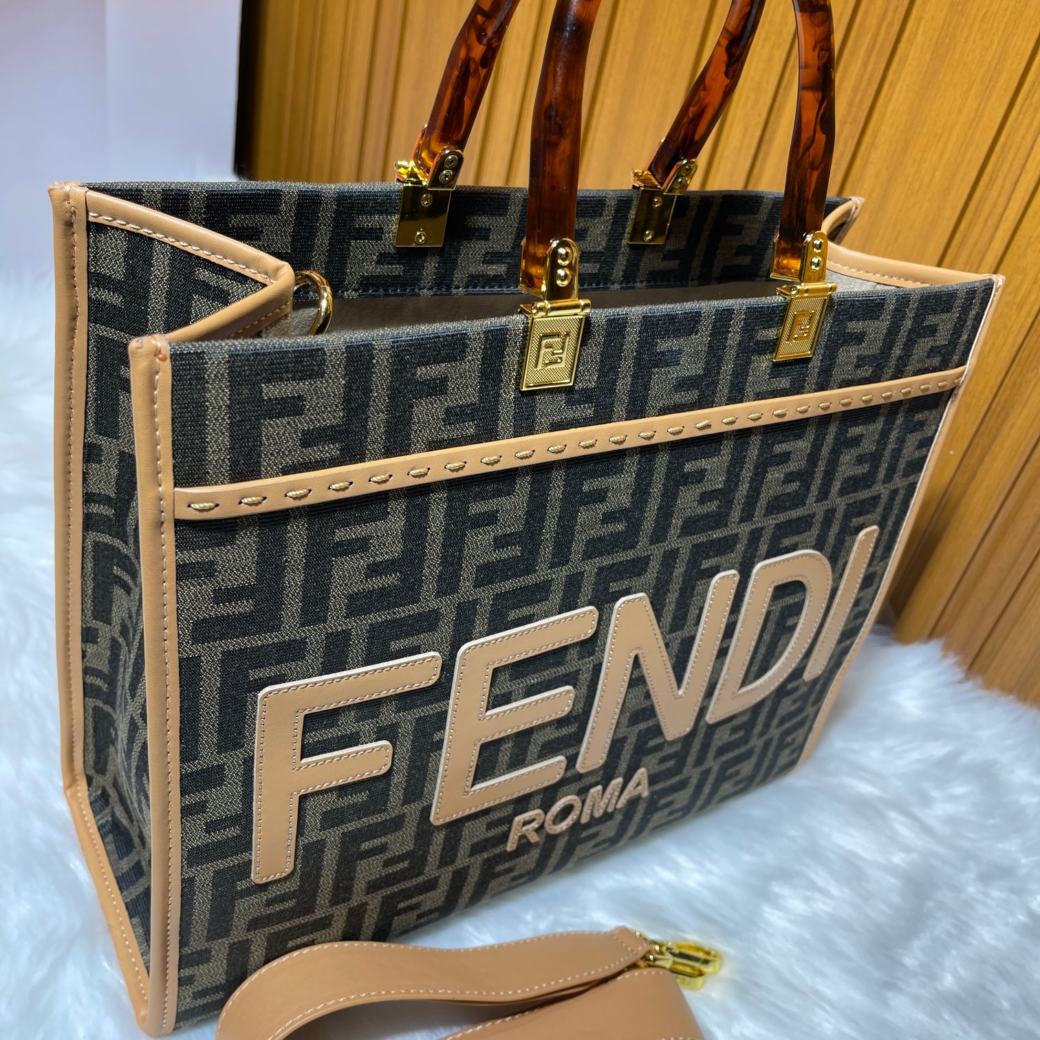 Factory direct sales Tote bag series limited edition uses iconic double F monogram fabric, lucite organic glass double handles, the front lettering on the bag is made of cowhide material, the FENDI logo is the biggest highlight of the entire bag, comes with a full leather long shoulder strap, can be worn as a single shoulder or crossbody, carrying it alone has a strong presence and doesn't hurt the hand, overall retro feeling is super strong, very suitable for fashion lovers who like the retro style, highly recommended!