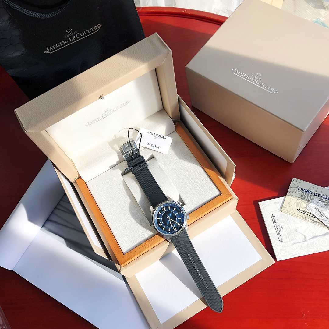 The natural rubber strap is thin, long, and soft enough to wrap comfortably around the wrist, paired with an original Jaeger LeCoultre buckle. Comes with full set of packaging!