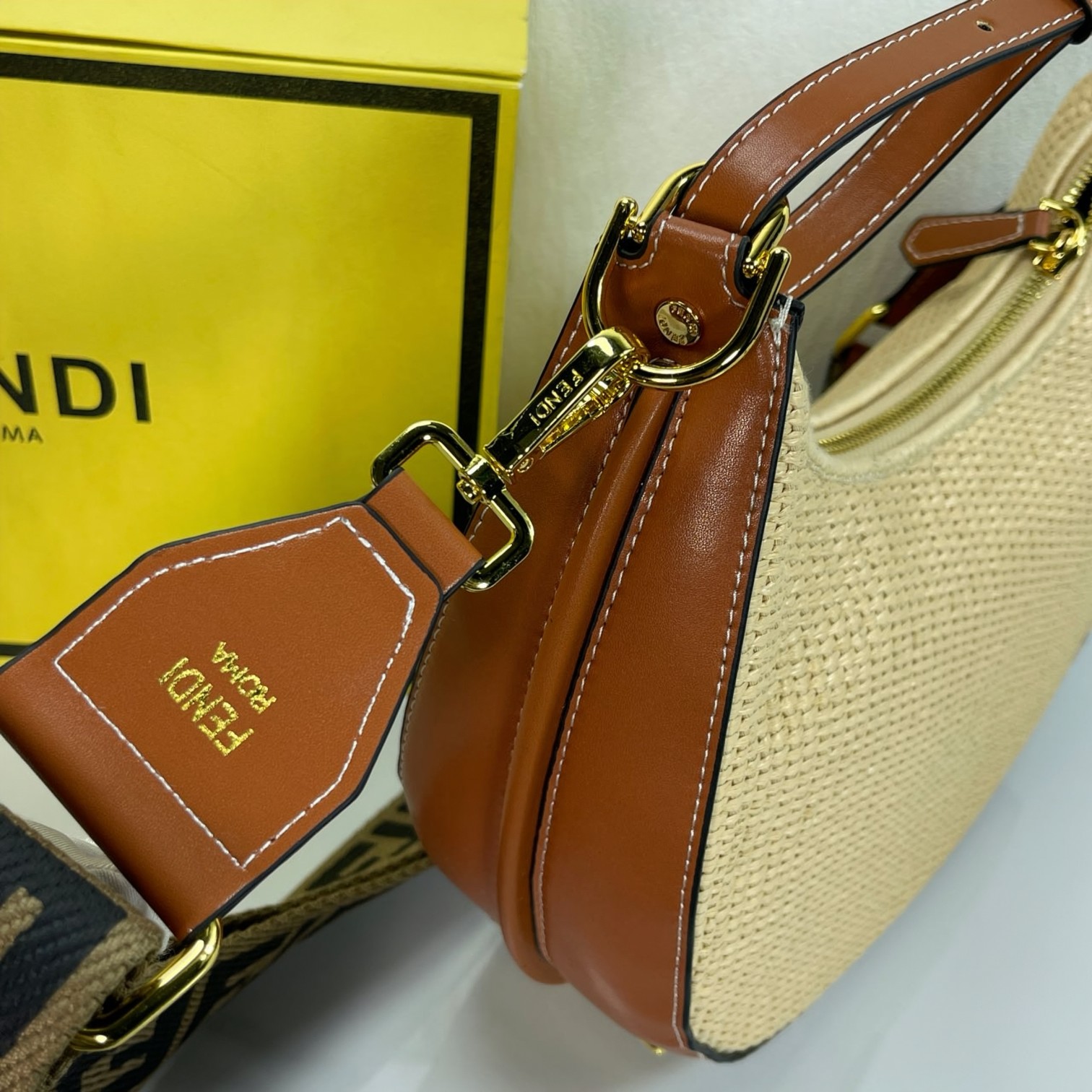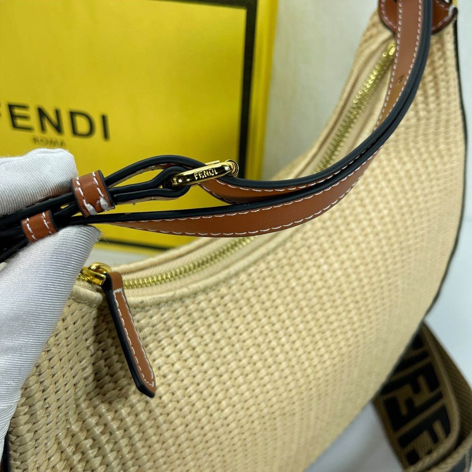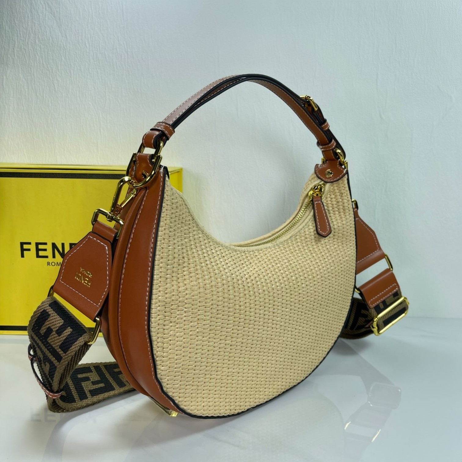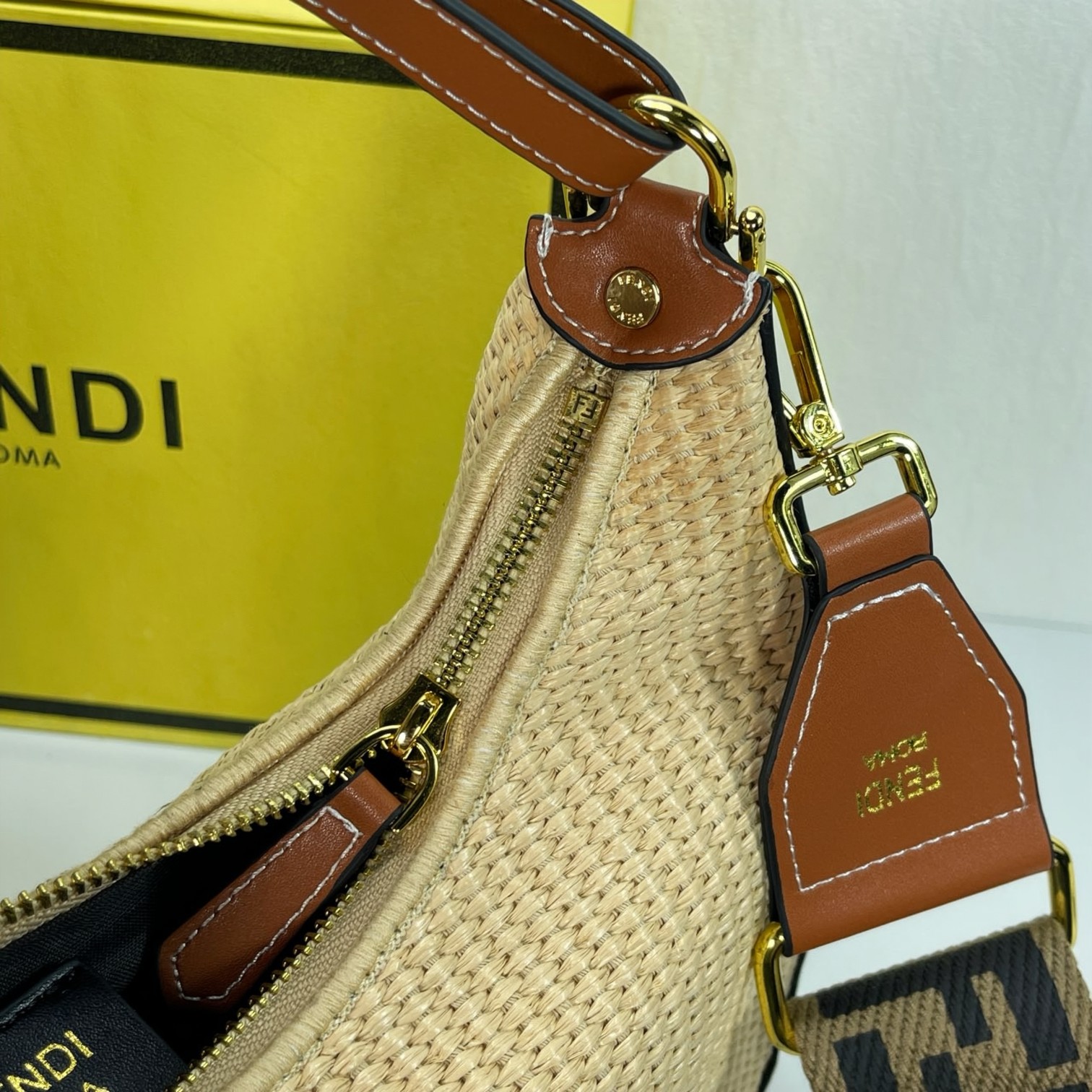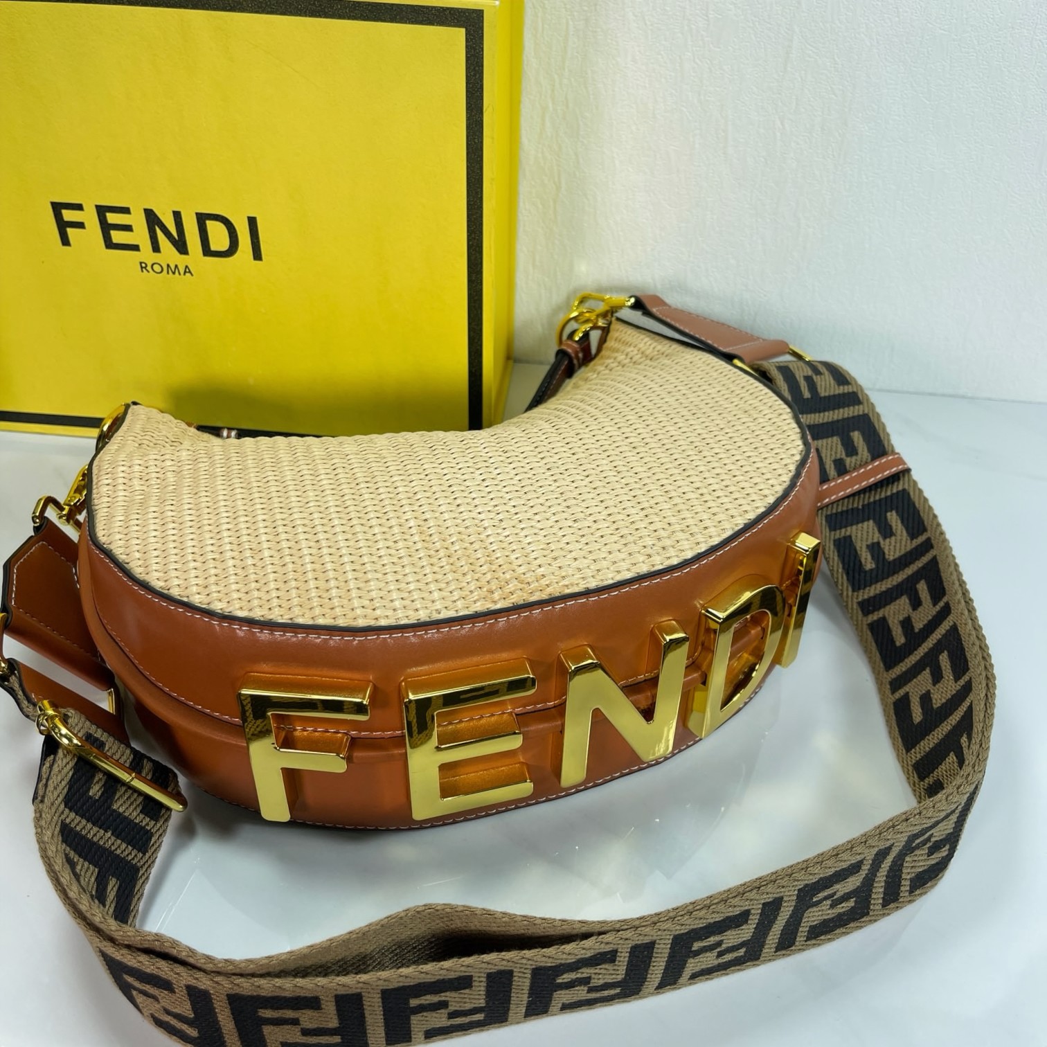 🛒 Factory direct sales large crescent woven bag, raffia material, visible retro gold metal FENDI lettering when carried under the arm, zipper closure. Dimensions 29CM-24CM-10CM, model 6388