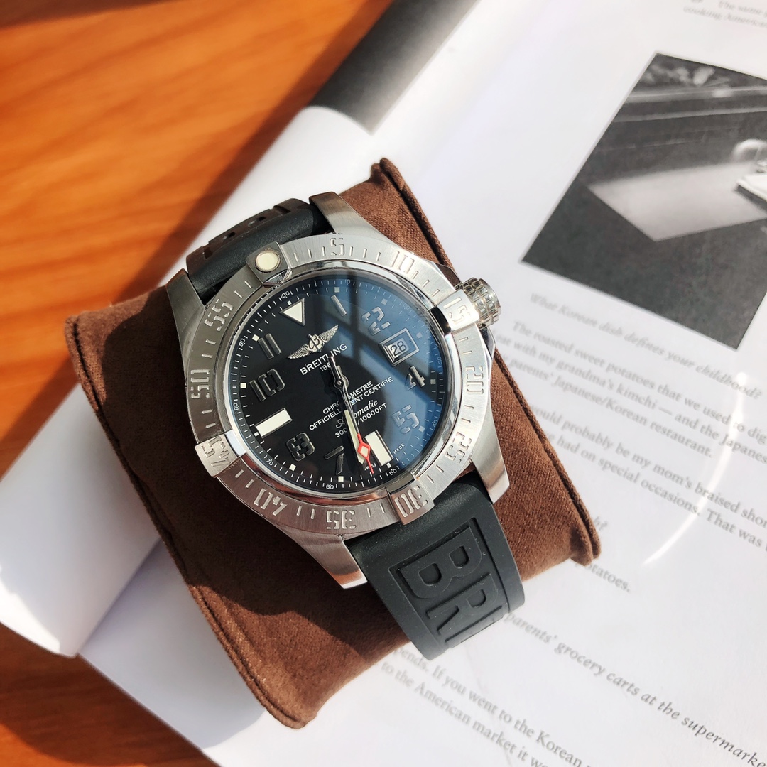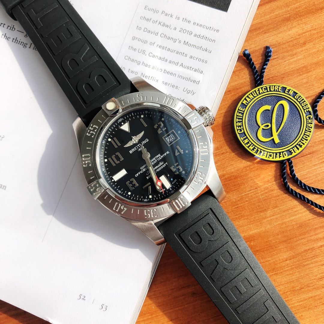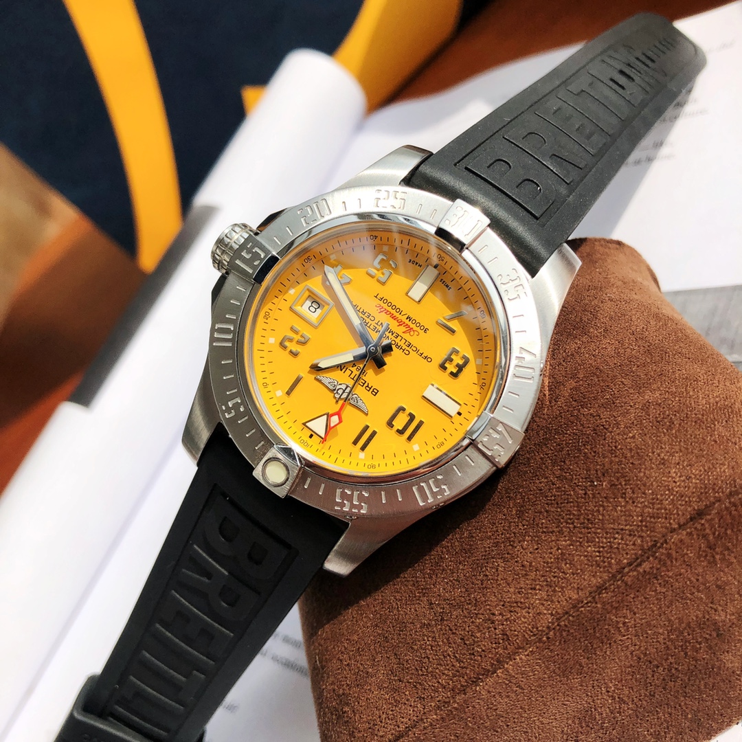 The Breitling Avenger series! The watch features a robust stainless steel case with a diameter of 45 mm and a water resistance of up to 3000 meters. It is equipped with an automatic winding movement certified by the Swiss Official Chronometer Testing Institute (COSC), perfectly showcasing the youthful, dynamic, and invincible spirit of the Challenger series. The satin-brushed bezel is adorned with four iconic bezel indicators, ensuring optimal operability while effectively protecting the double-sided anti-reflective sapphire crystal. Available with either a steel bracelet or leather strap, both feature large luminous hands and hour markers.