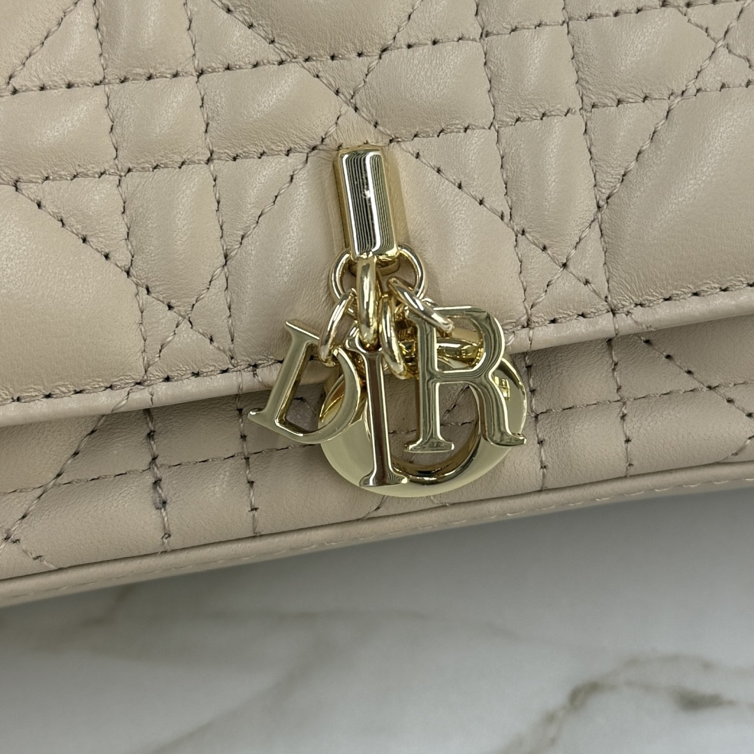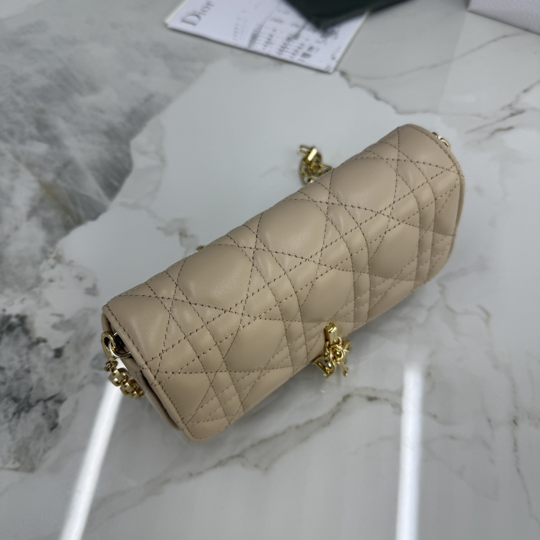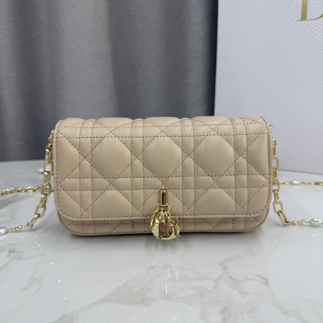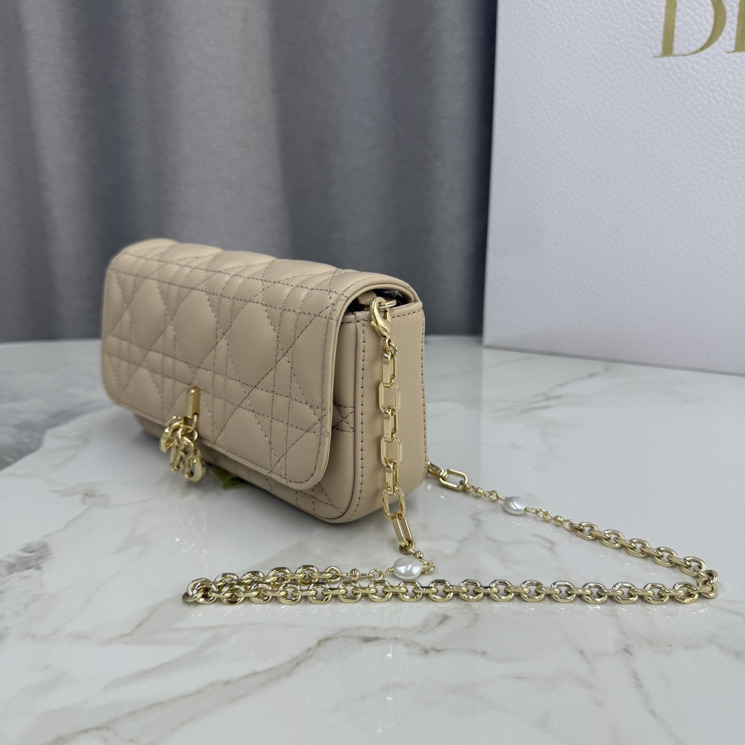 My Dior - Dior Talk phone case is elegant and unique in style. It is meticulously crafted from caramel beige calfskin, adorned with a cannage pattern, and features a light gold-finished metal D.I.O.R. charm. The elegant design includes a removable chain decorated with resin beads, allowing it to be carried by hand, over the shoulder, or across the body.