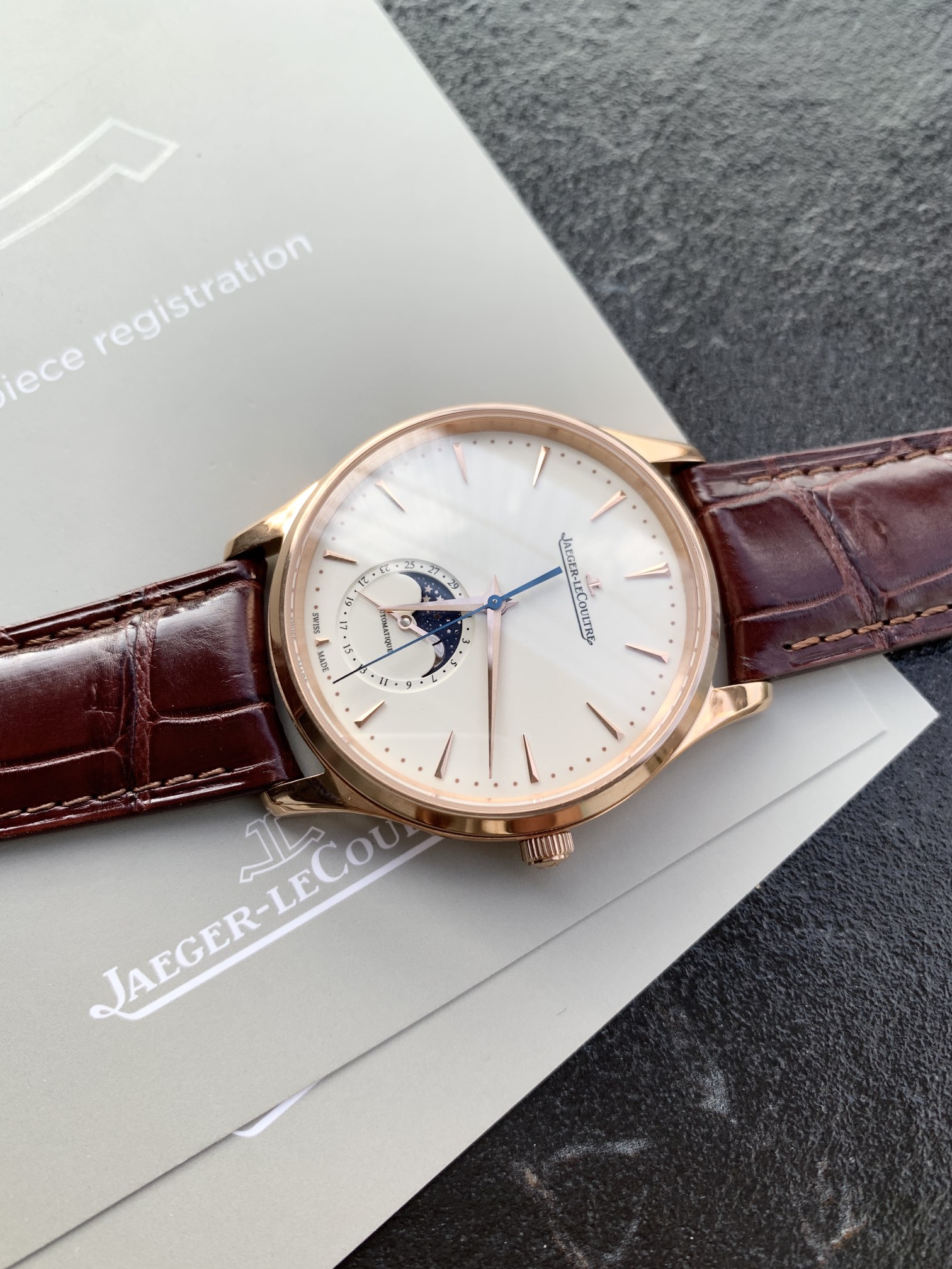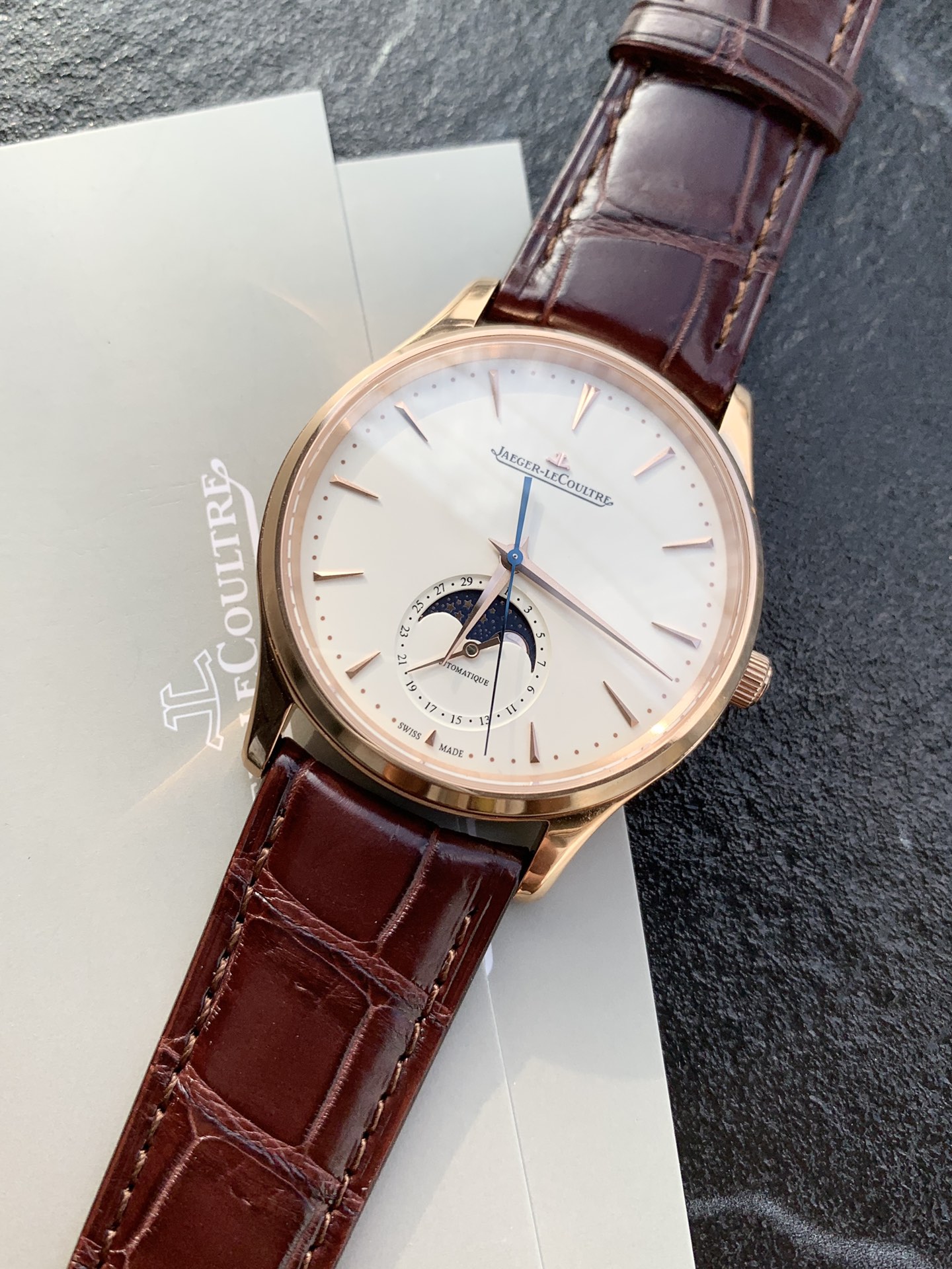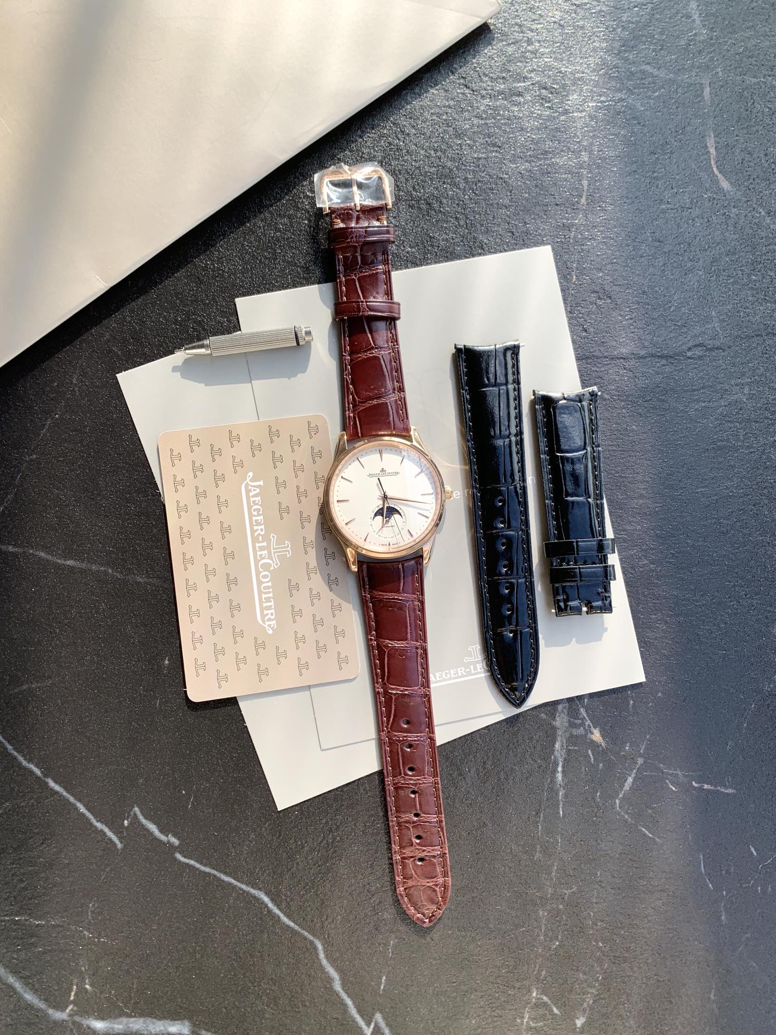 Jaeger-LeCoultre Master Moon Phase Series, the most cost-effective men's watch, the Jaeger-LeCoultre Master, has arrived! 2021 new edition. Observe the changes in the moon phase disk. (Case diameter 39mm, thickness 9.9mm) Synchronized with the original. The sub-dial at six o'clock features a dual display of the Gregorian and lunar calendars (moon phase). The moon phase completes one full cycle per month, with functions identical to the genuine product. [Moon Phase Disk] 3D metal moon phase. [Movement] Original replica Cal.925/1 integrated movement, with functions 100% synchronized with the original in-house movement. Staying true to the original intention, each movement undergoes a series of strict tests and screenings before leaving the factory! The appearance also faithfully follows the original. Observing the watch dial from the side reveals a slight curvature. Achieving this effect required time-consuming and labor-intensive adjustments to the mold multiple times, ensuring the charm and feel can rival the original. The Jaeger-LeCoultre Ultra-Thin Master fulfills all your nostalgic sentiments, offering ultimate simplicity, achieving classic status, clean and elegant, making it the top choice for business!