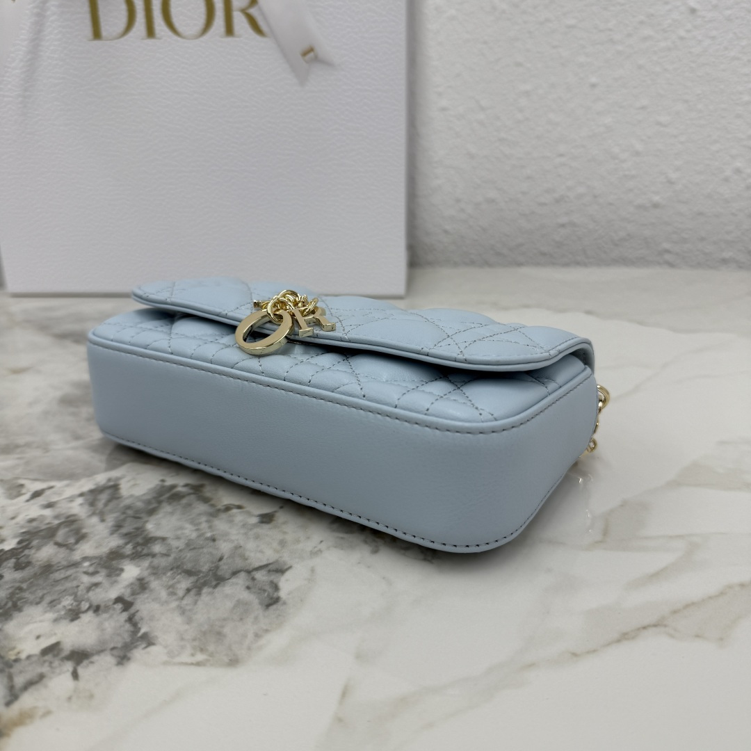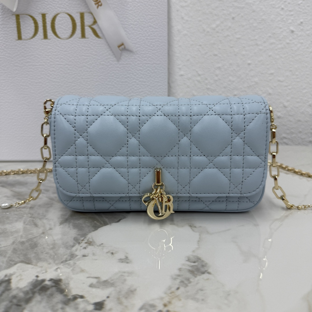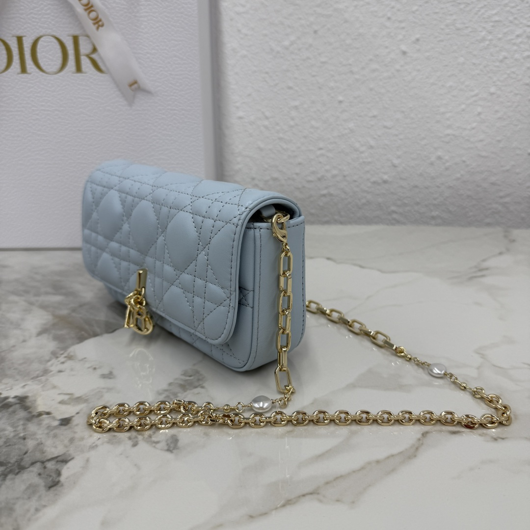 My Dior - Dior Talk phone pouch is elegant and exquisitely crafted. Made from carefully selected lambskin in space blue, it features a cannage pattern and a light gold-finish metal D.I.O.R. charm. The elegant design includes a removable chain adorned with resin beads, allowing it to be carried by hand, on the shoulder, or across the body.