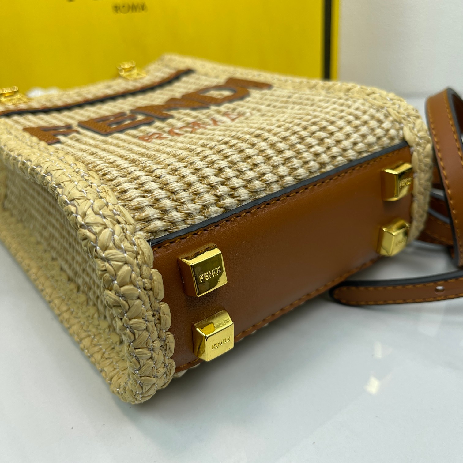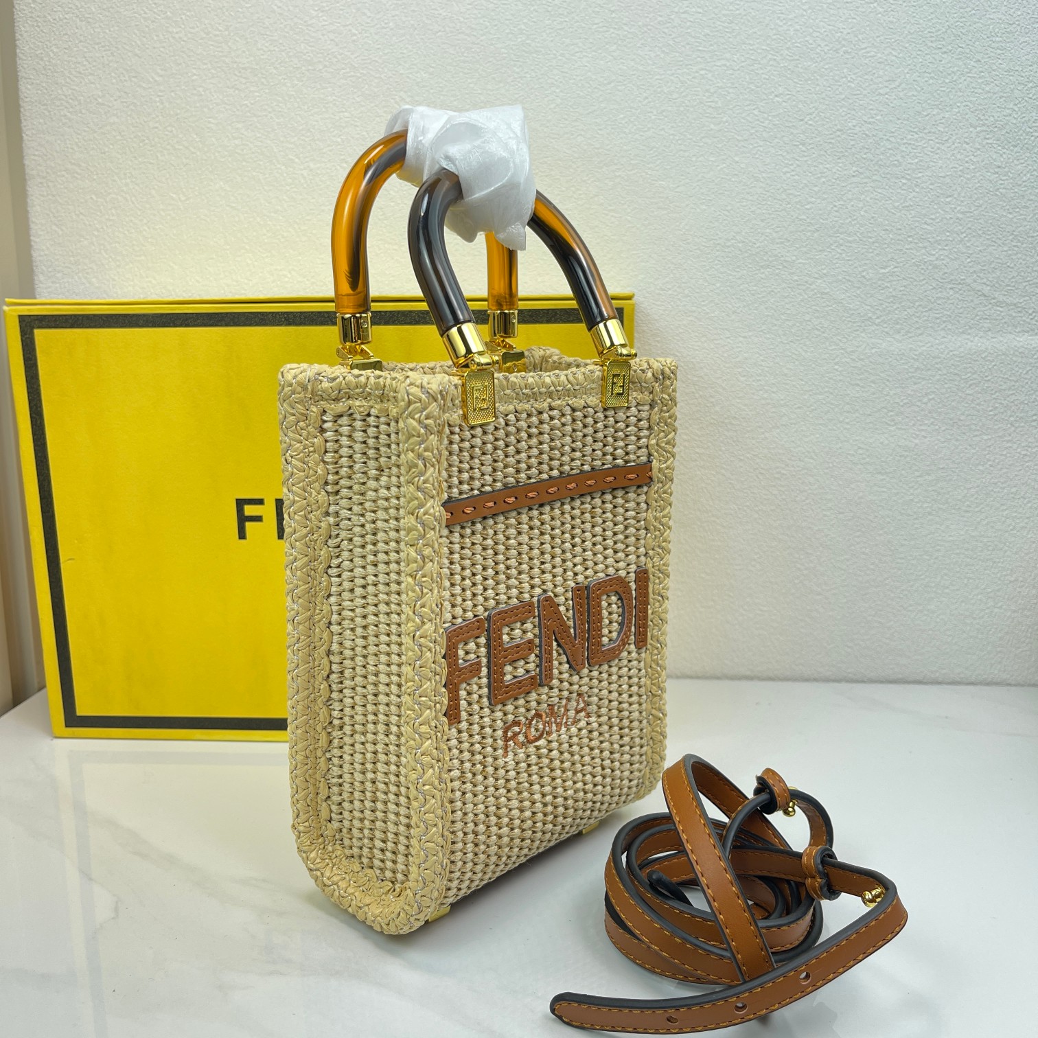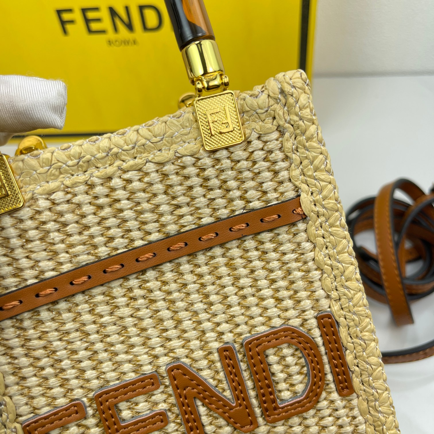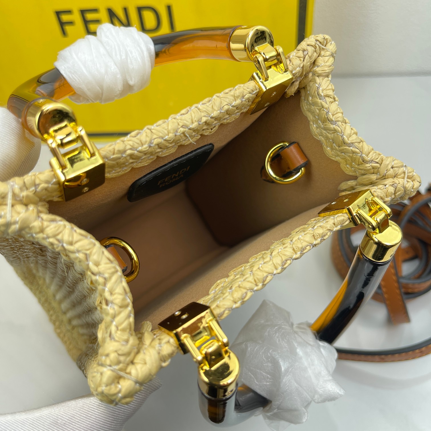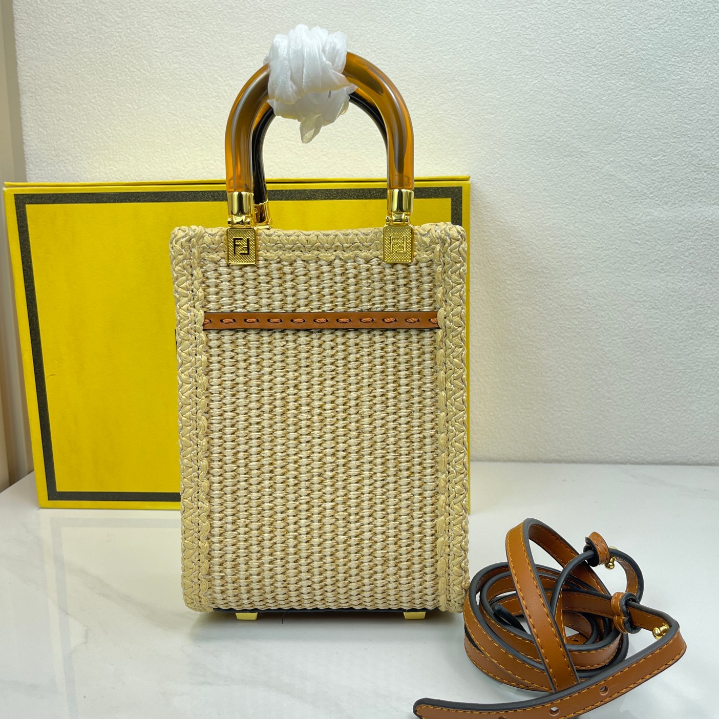 Factory Direct Sale ✽ FEND1 Sunshine Mini Handbag, Natural color woven straw material, presenting a moss stitching effect, adorned with brown leather FENDI ROMA lettering. Hard tortoiseshell effect acrylic handle. Equipped with a lined interior compartment, embellished with brown leather trim and gold-finished metal hardware. Comes with two leather handles and an adjustable, detachable thin leather shoulder strap, can be carried by hand or on the shoulder. ⚡️Size: 13*18*6.5cm80036. To place an order, please add WeChat Hi881689 to order + WeChat [Hi881689]