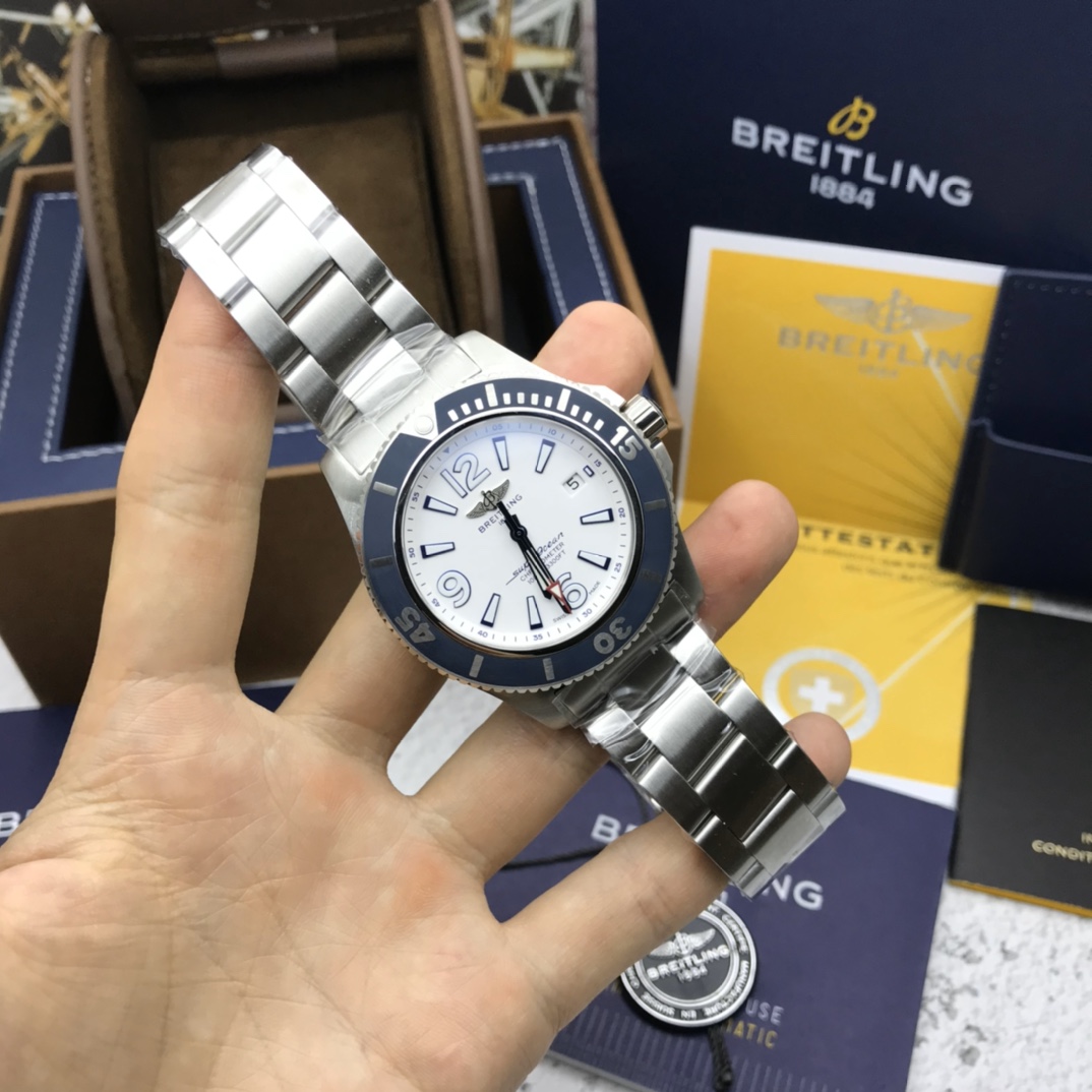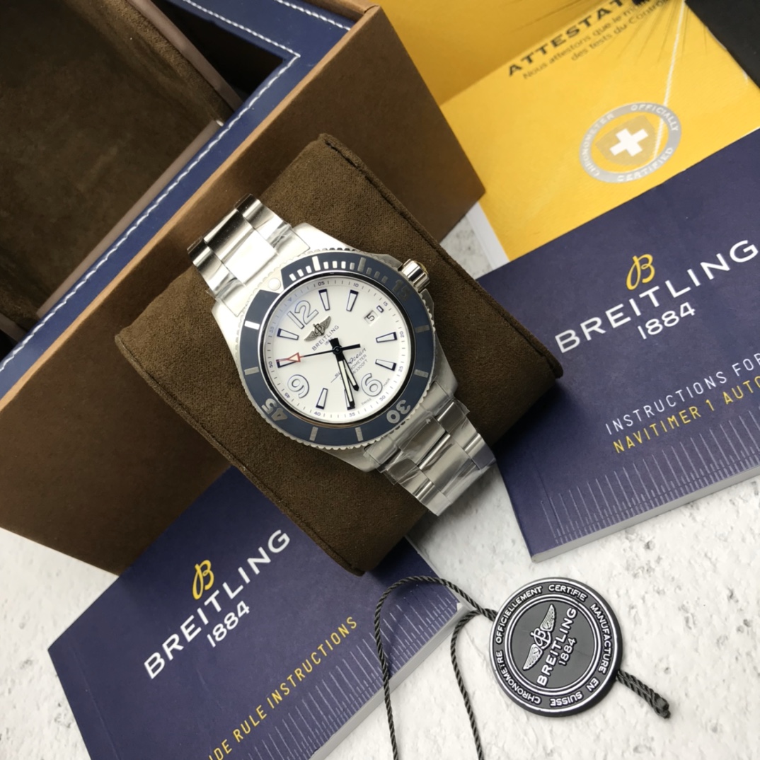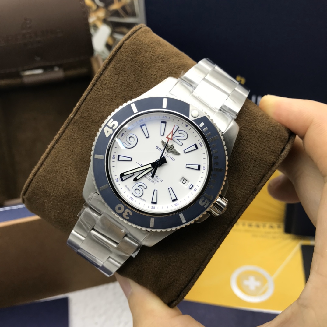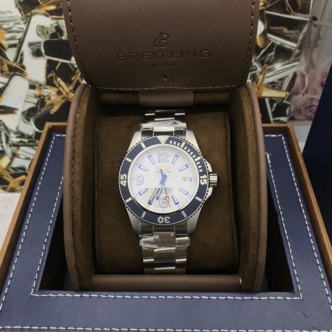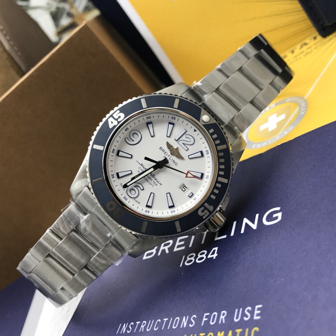 Latest arrival: Original Breitling authentic factory super ocean automatic mechanical watch, fresh, colorful, and sporty, specially designed for men who pursue excellent performance and modern style in watches. A sense of power, functionality, and cool contemporary style outline the classic image of the Breitling ocean. It features a sturdy 44mm steel case, a ratcheted unidirectional bezel, and is equipped with an original Swiss ETA2824 automatic mechanical movement. The curved sapphire crystal is anti-reflective on both sides. Channel stock, absolutely stunning in price and style, retail stores sell for ten thousand plus.