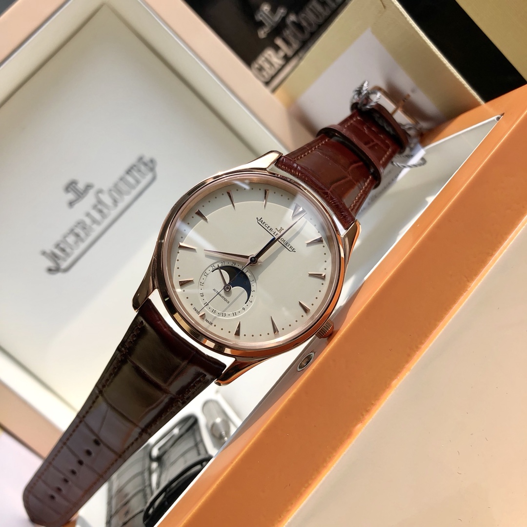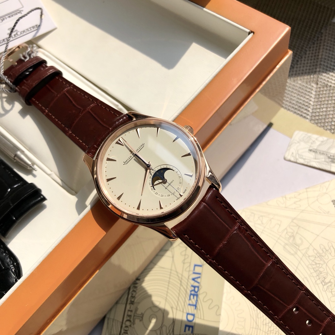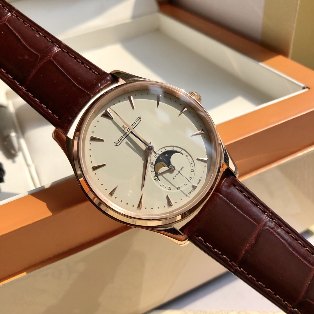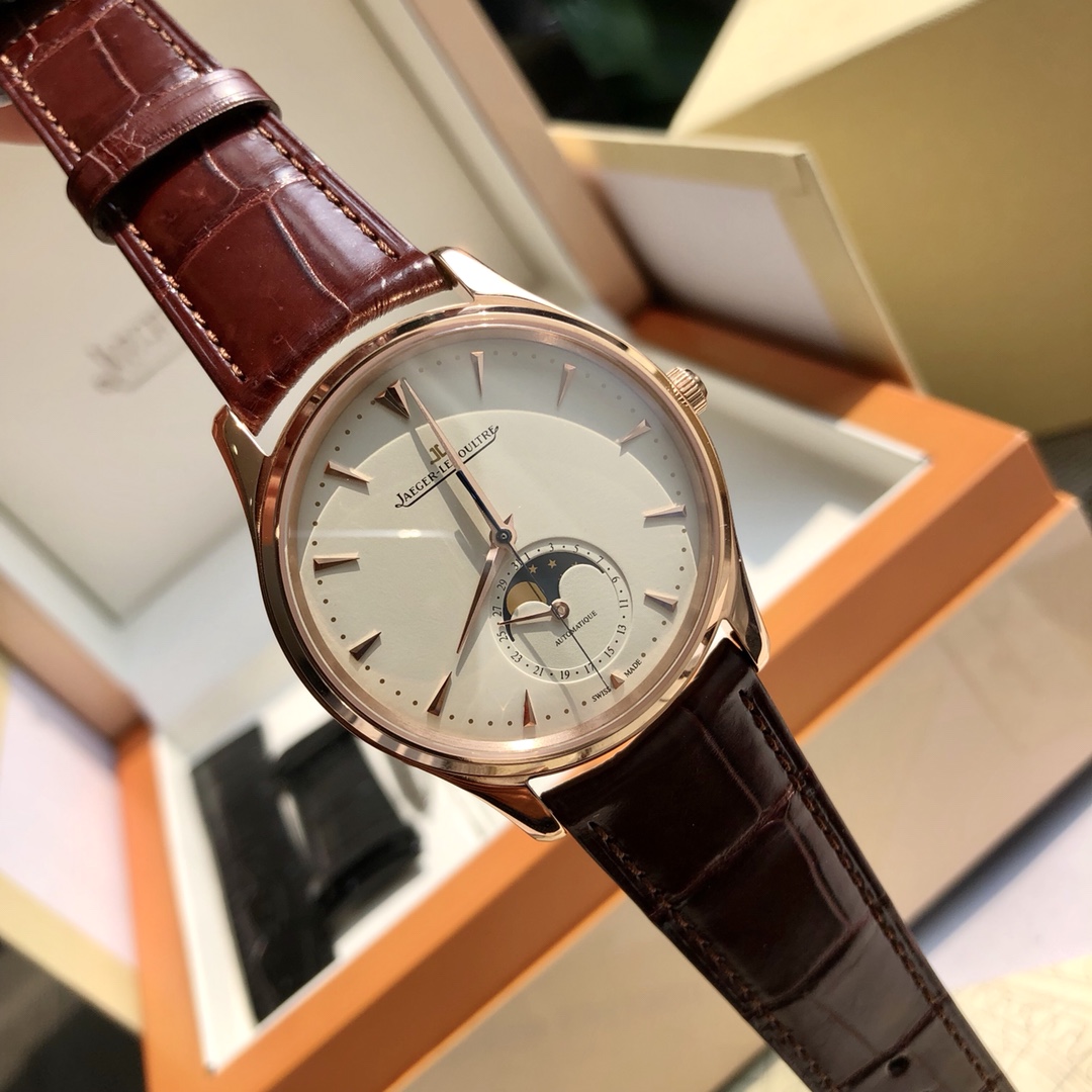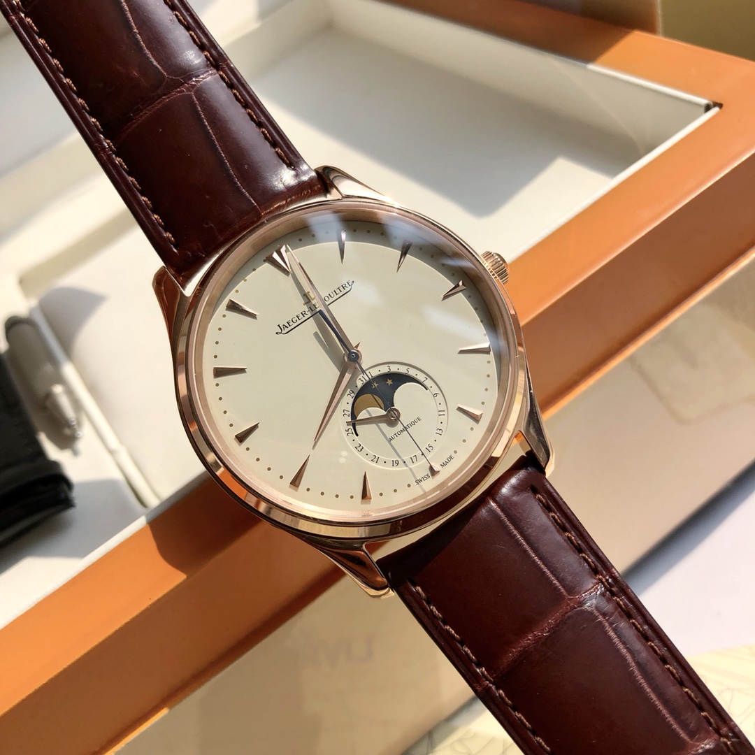 Top version Jaeger-LeCoultre Master Moon Phase series, comes with an alligator strap and includes an additional calfskin strap. The case diameter is 39mm x 9.9mm, identical to the original. The sub-dial at six o'clock features dual displays for the Gregorian and lunar calendars (moon phase). The moon phase completes one cycle per month, with functions identical to the genuine product. It uses a modified 9015 movement to replicate the Jaeger-LeCoultre in-house Cal.925/1 movement, with functions 100% synchronized with the original in-house movement. Stable timekeeping and robust quality. When observing the watch dial from the side, a slight curvature is noticeable. Achieving this effect required multiple adjustments to the mold, ensuring the charm and feel are comparable to the original. The Jaeger-LeCoultre Master Moon Phase fulfills all your beautiful sentiments toward the moon phase.