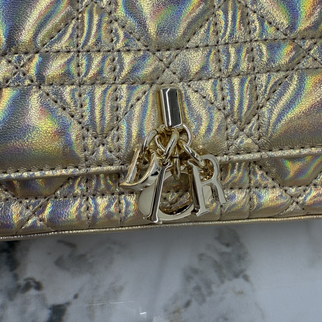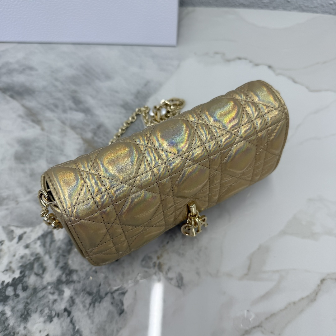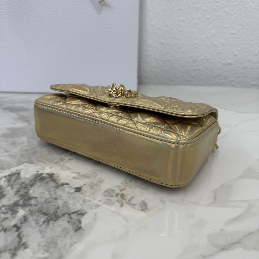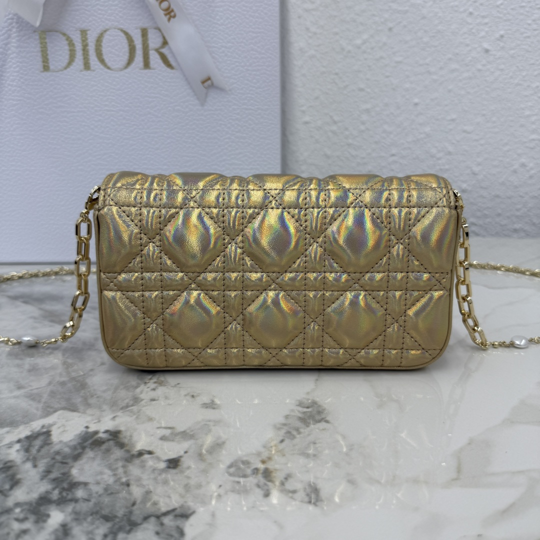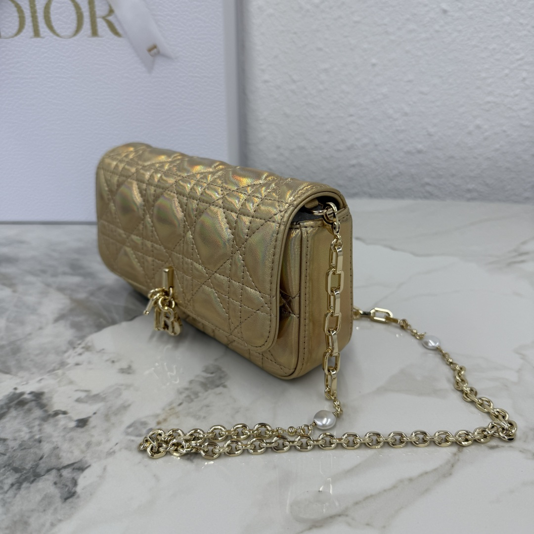My Dior - Dior Talk phone pouch is elegant and unique in style. Meticulously crafted from iridescent golden lambskin, adorned with a cannage pattern, and paired with a light gold-finished metal D.I.O.R. charm. The elegant design features a removable chain decorated with resin beads, allowing it to be carried by hand, on the shoulder, or across the body.