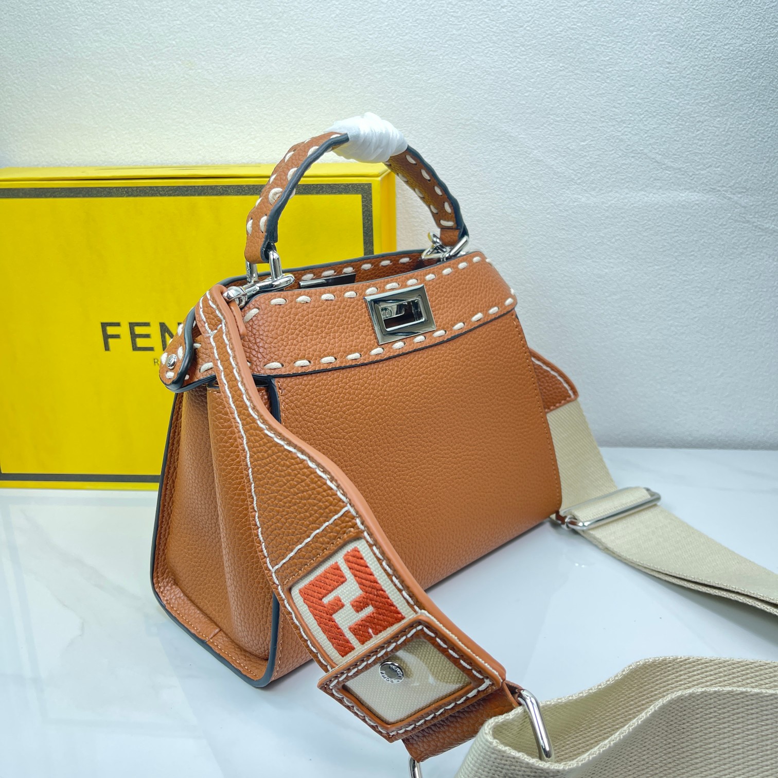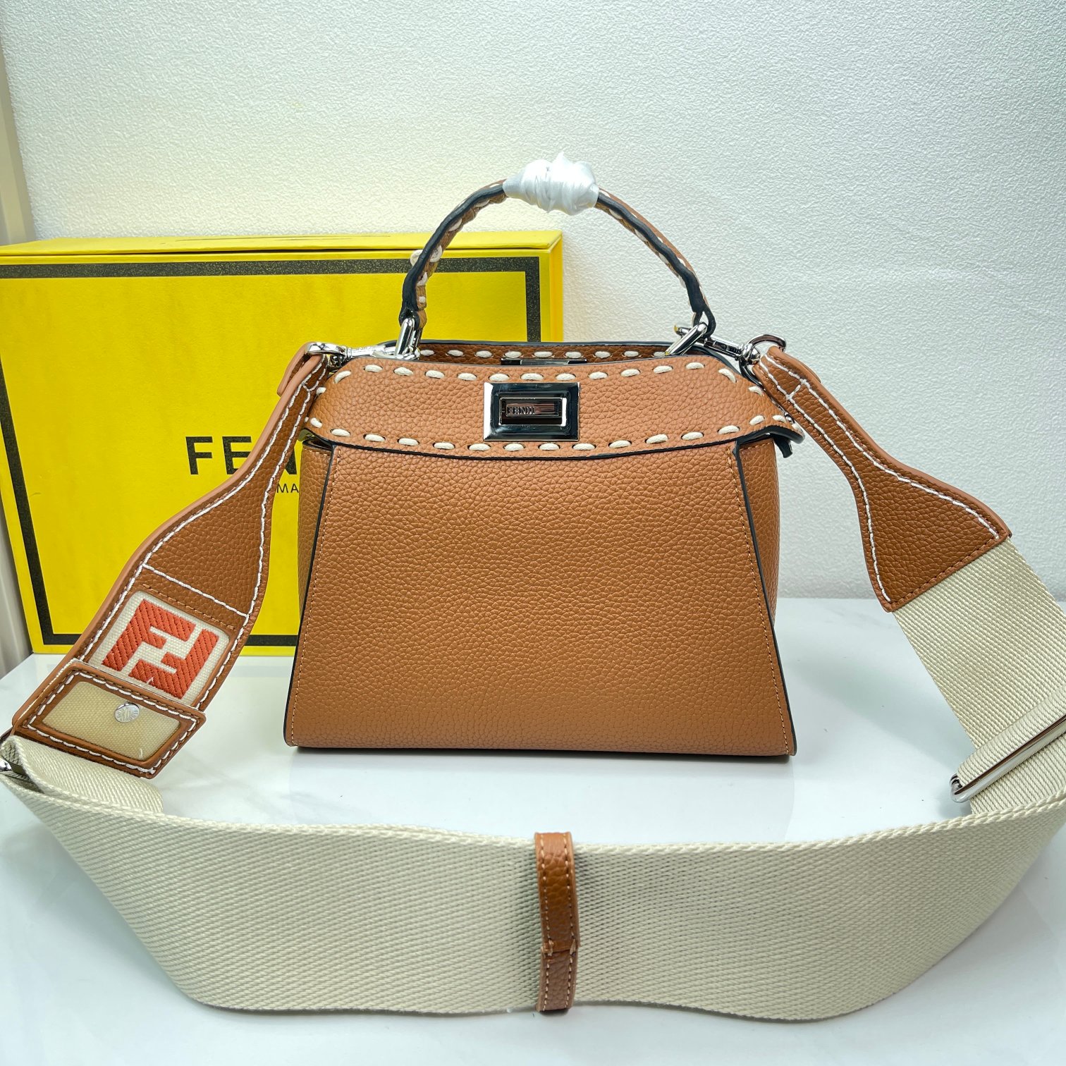 Factory Direct Sales Fendi Iconic Peekaboo Handbag, Full-Grain Leather Material, Hand-Stitched, Sides Adorned with Classic Twist Locks. Tonal Full-Grain Leather Lining, Two Compartments Separated by a Rigid Divider, Featuring an Internal Zippered Pocket and Silver Metal Hardware. The Handbag Comes with a Handle and an Adjustable, Detachable Shoulder Strap, Can Be Carried by Hand, on the Shoulder, or Cross-Body. Dimensions: 23×18×11cm