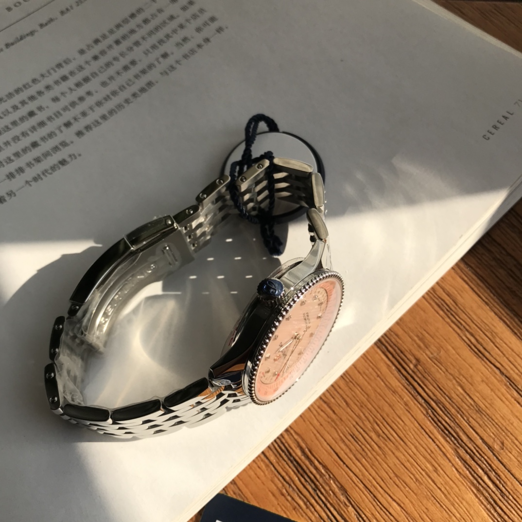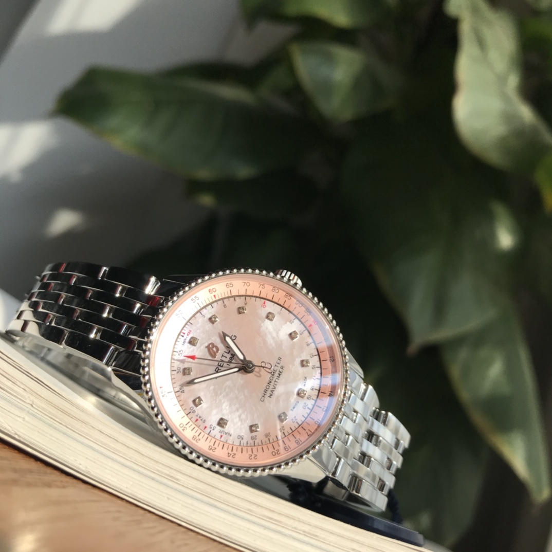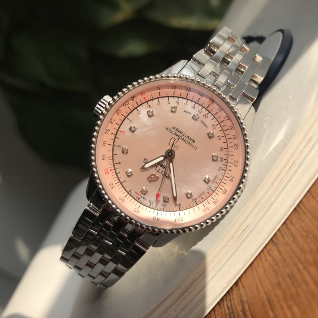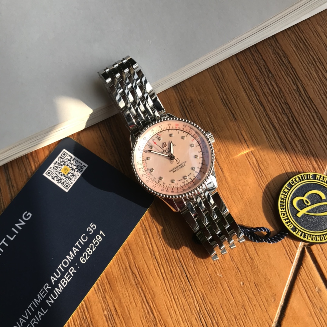 New arrivals are in~ absolutely stunning! The dial features 💎 12 real diamonds paired with an exquisite colored mother-of-pearl dial!! Original Breitling Navitimer automatic watch, designed for women with elegance and sophistication, carefully blending classic historical charm with precise modern watch design. The watch features a 35 mm case, equipped with a beaded bezel and a series of elegant and refined dial styles, such as silver, blue, copper dials, or a diamond-set white mother-of-pearl dial. The watch is powered by the original Swiss SW200 movement (i.e., the Breitling B17 movement officially certified by Breitling), with official website prices over ten thousand+! You know our quality and pricing!