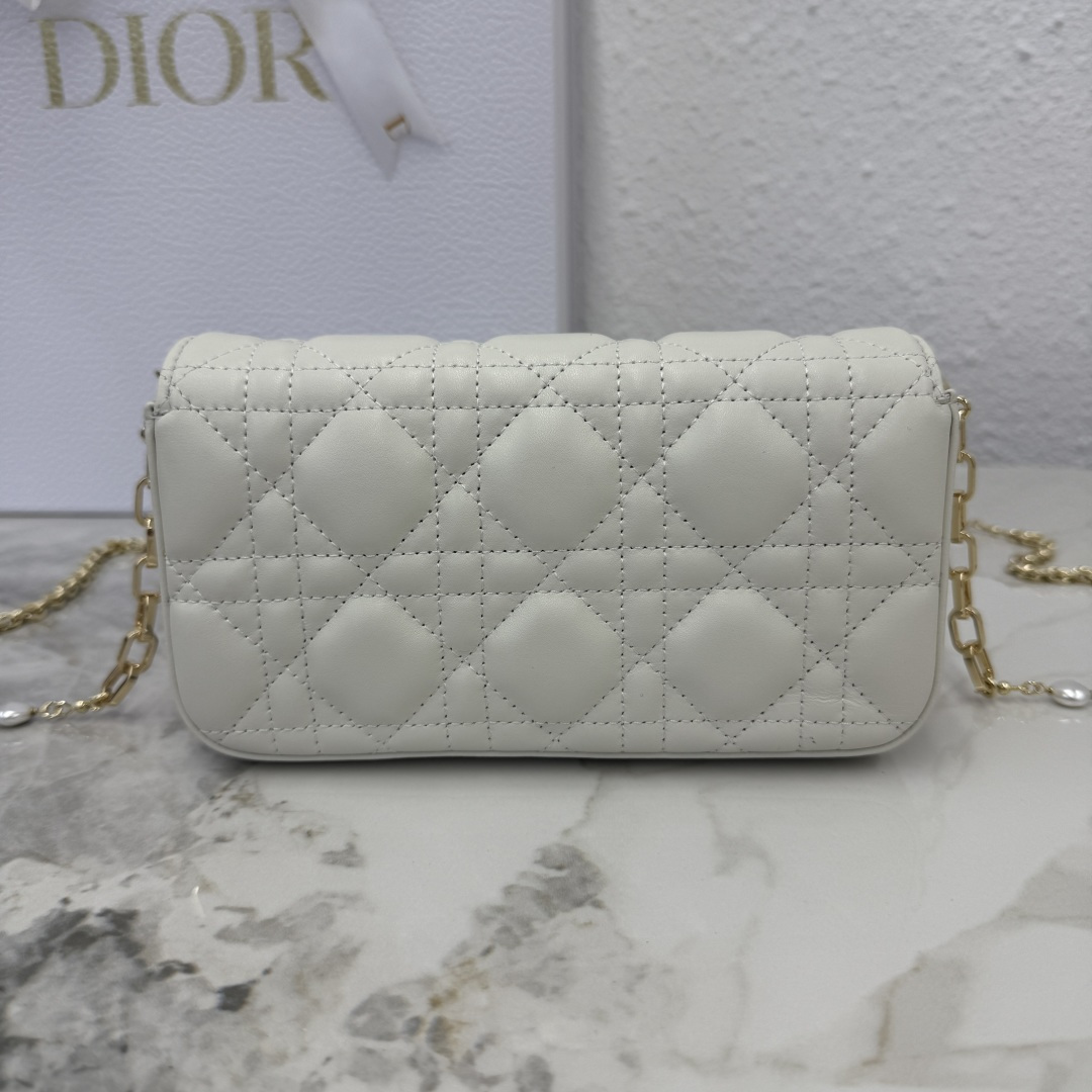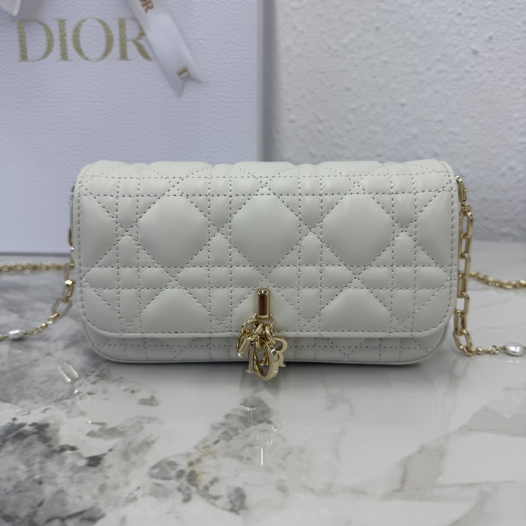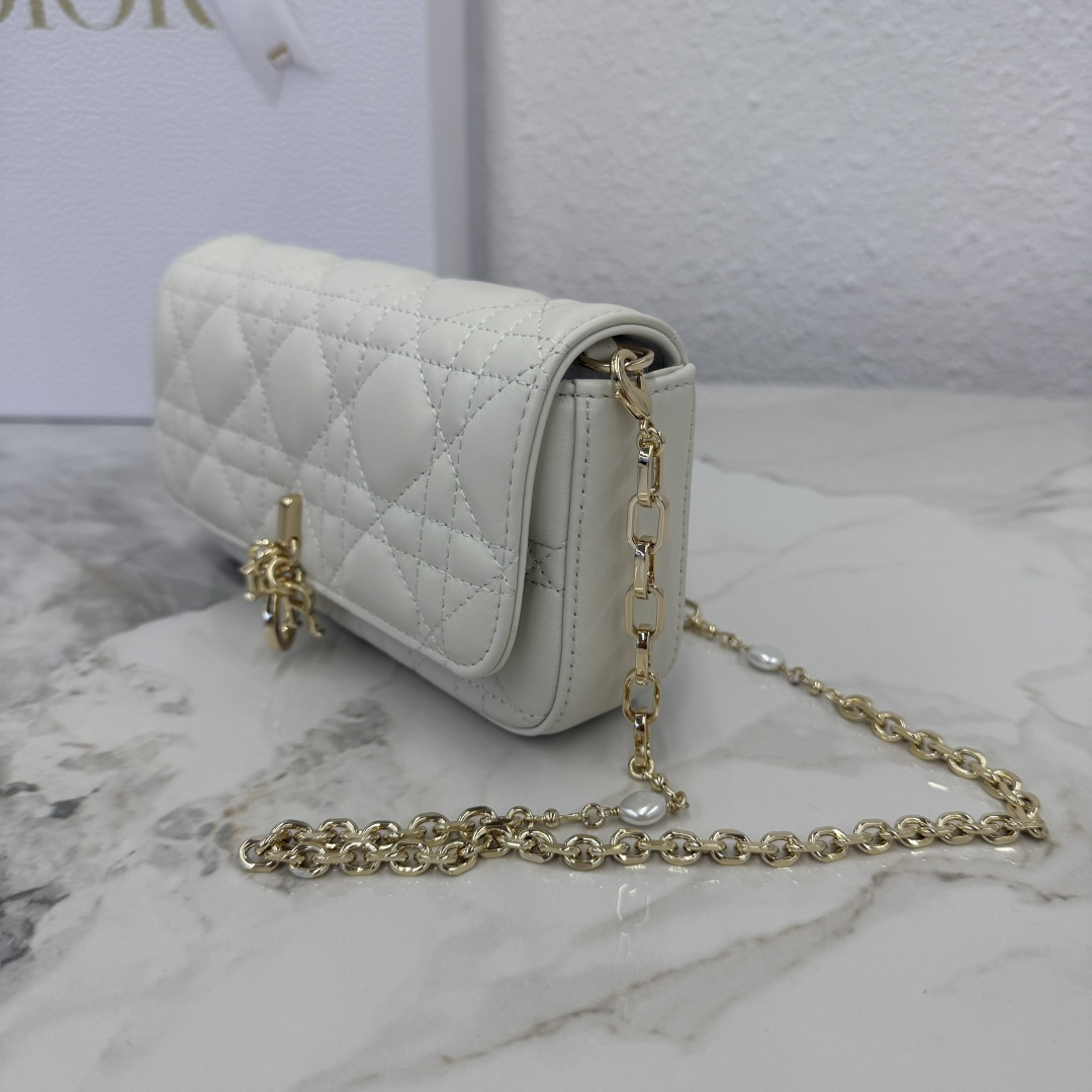 My Dior - Dior Talk phone pouch is elegant and uniquely crafted. Meticulously made from white lambskin, adorned with a cannage pattern and a light gold-finished metal D.I.O.R. charm. The elegant design features a removable chain decorated with resin beads, allowing it to be carried by hand, on the shoulder, or across the body.