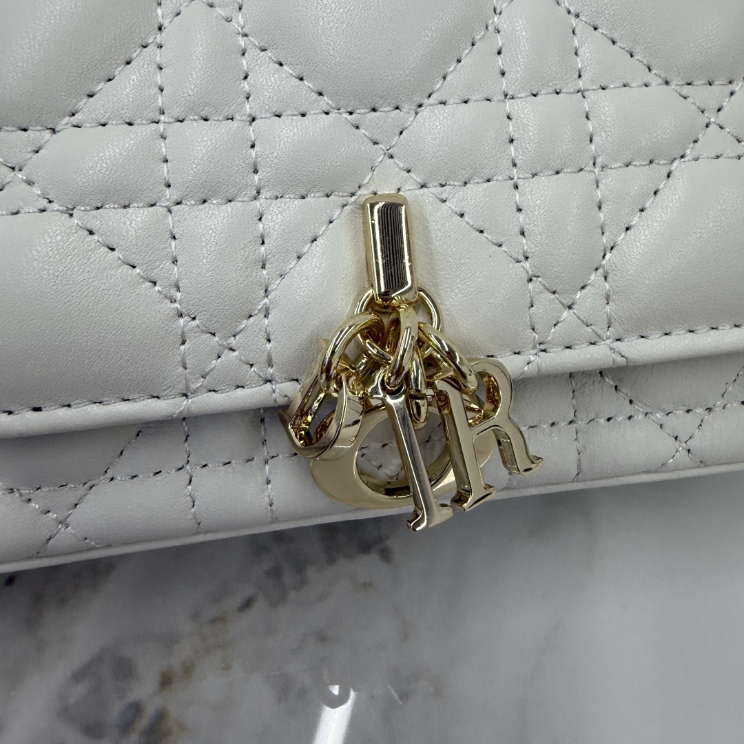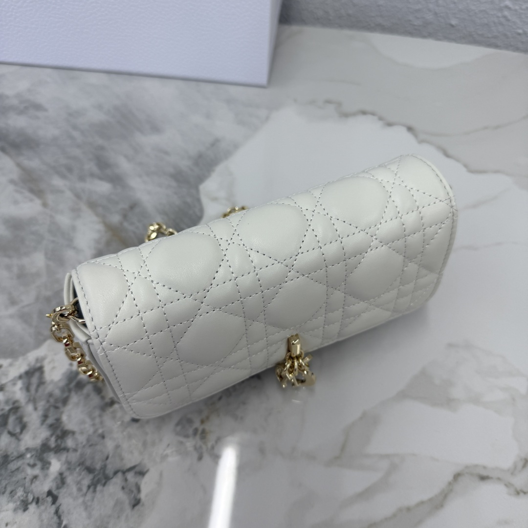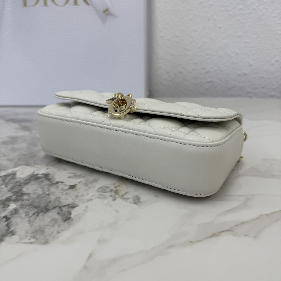 My Dior - Dior Talk phone pouch is elegant and uniquely crafted. Meticulously made from white lambskin, adorned with a cannage pattern and a light gold-finished metal D.I.O.R. charm. The elegant design features a removable chain decorated with resin beads, allowing it to be carried by hand, on the shoulder, or across the body.