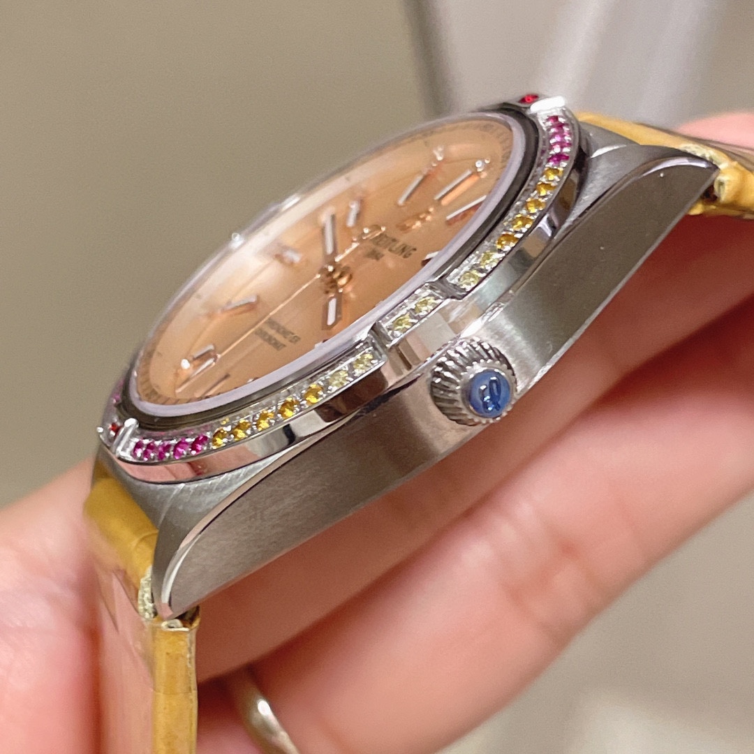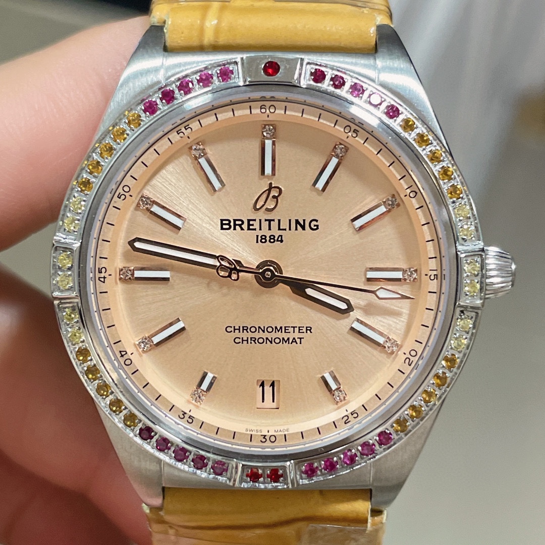 Features striking colors and luminescence, evoking the intoxicating atmosphere of summer, marine life, and lush greenery. This elegant, modern vintage-inspired watch is perfect for women who want to stand out in a crowd. Combining excellent performance and aesthetic appeal, it is stylish and elegant, suitable for various occasions. Multiple metal case options are available, inlaid with colored gemstone diamonds, ranging from cool stainless steel and versatile two-tone gold to luxurious rose gold, all readily available. The watch features hour markers and a colorful dial, equipped with a 2824 mechanical movement. With a size of 36mm, it is the dynamic sister model of Breitling's latest women's mechanical chronograph series.