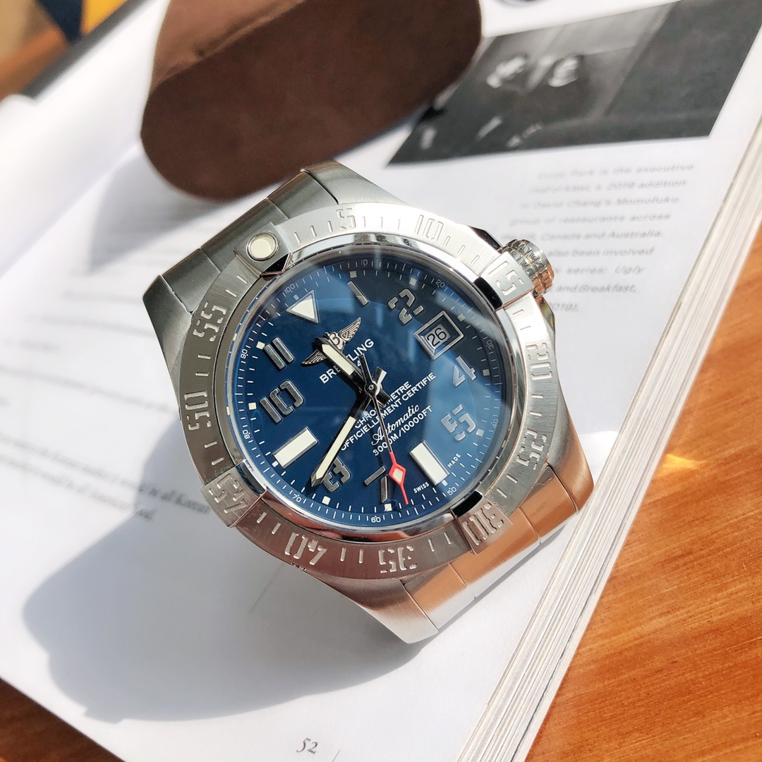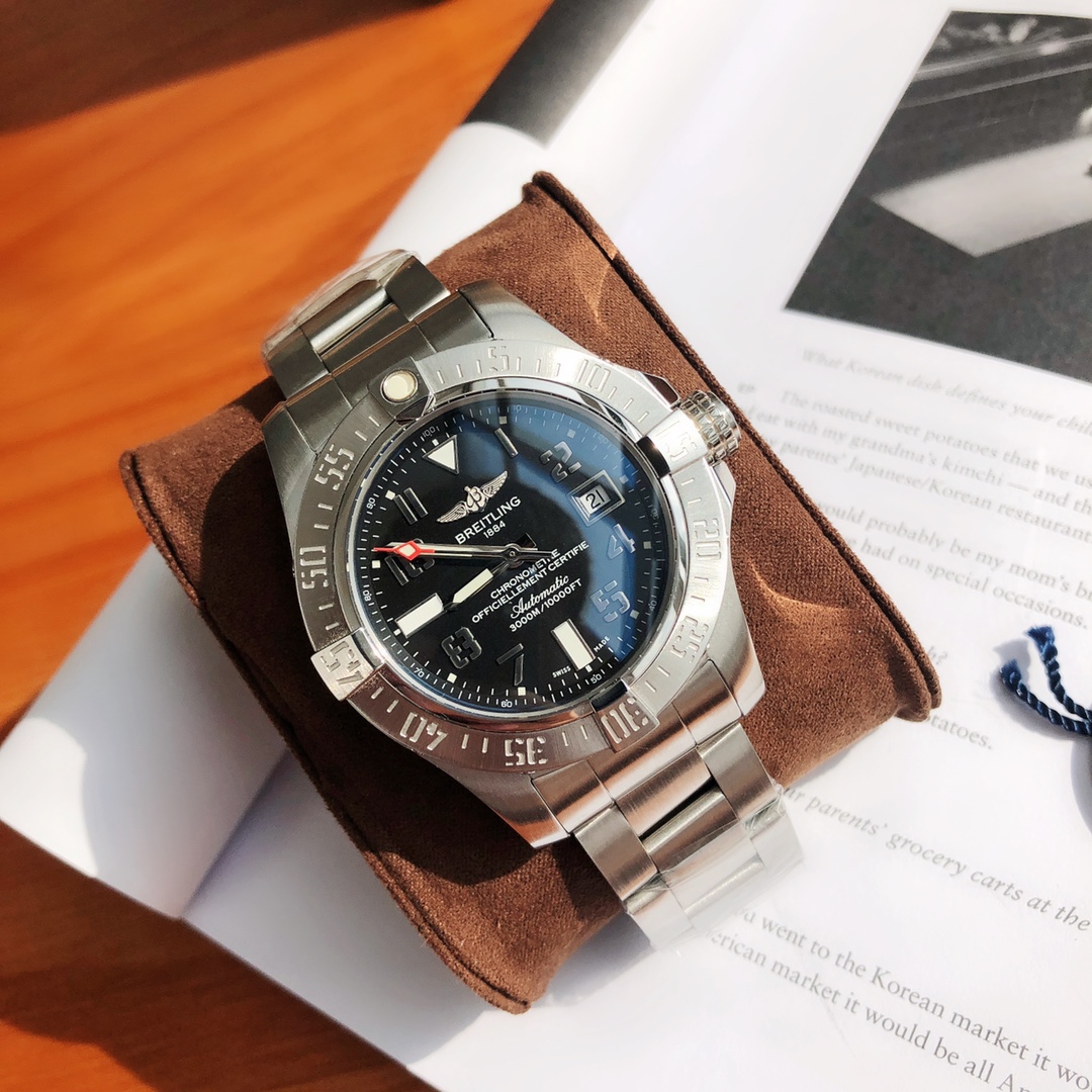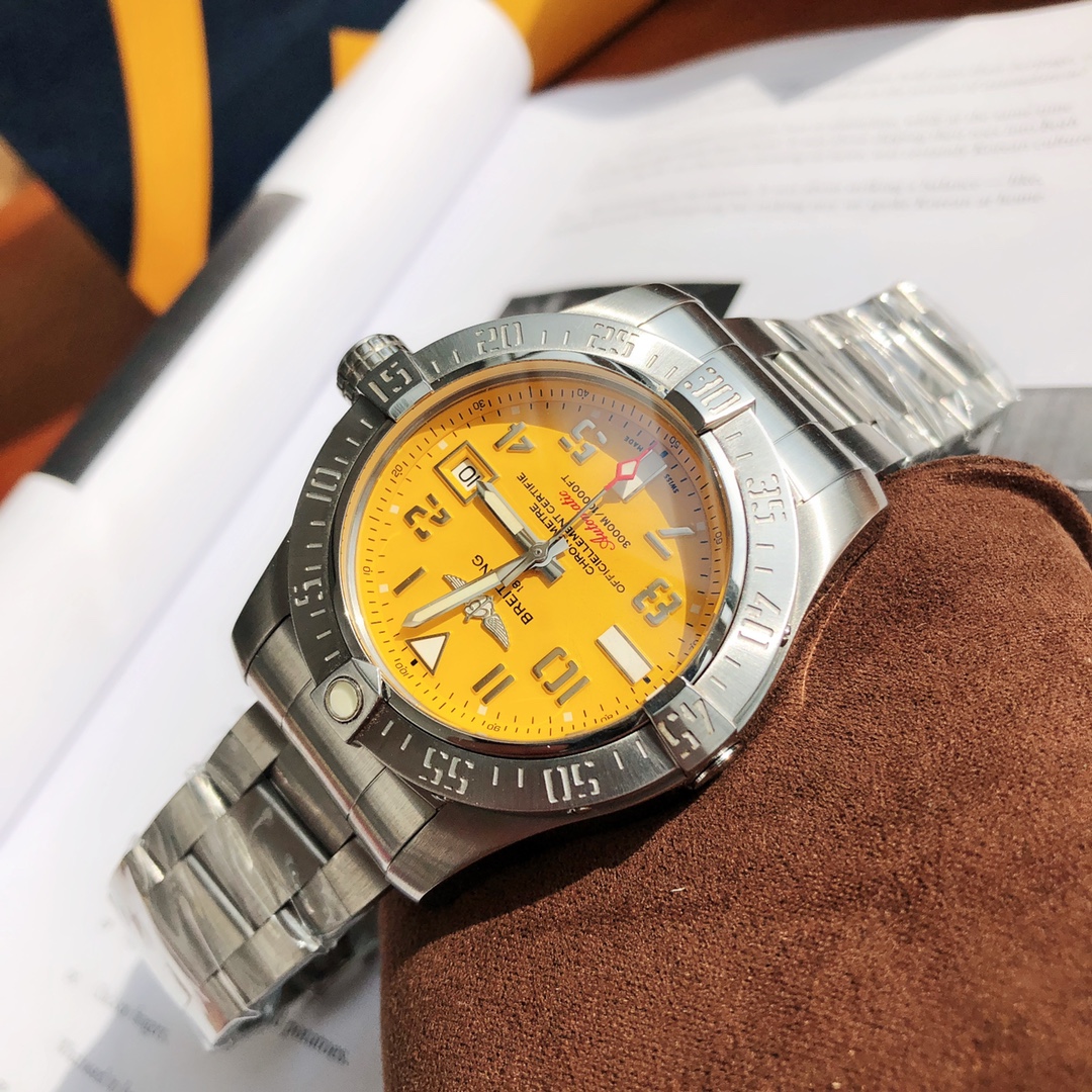 Original Title: The Breitling Avenger series! The watch features a robust stainless steel case with a diameter of 45 mm and a water resistance of up to 3000 meters. It is equipped with an automatic movement certified by the Swiss Official Chronometer Testing Institute (COSC), perfectly showcasing the youthful, dynamic, and invincible spirit of the Challenger series. The four iconic bezel indicators on the satin-brushed bezel not only ensure optimal operability but also effectively protect the double-sided anti-reflective sapphire crystal. Available with steel or leather straps, both adorned with large luminous hands and hour markers.