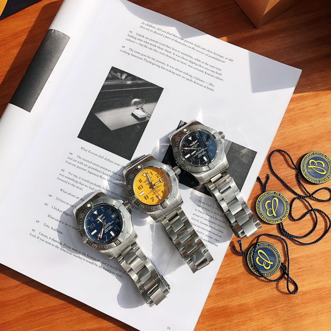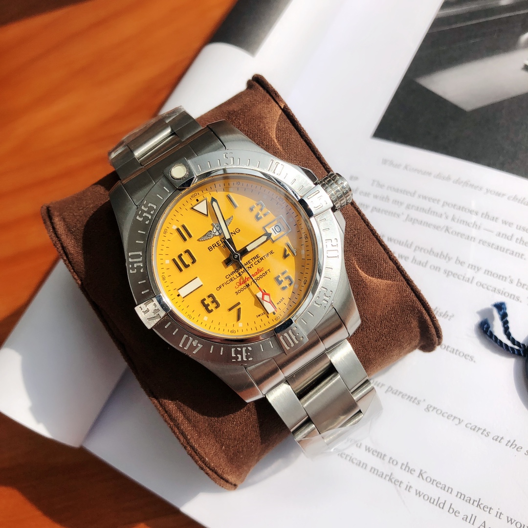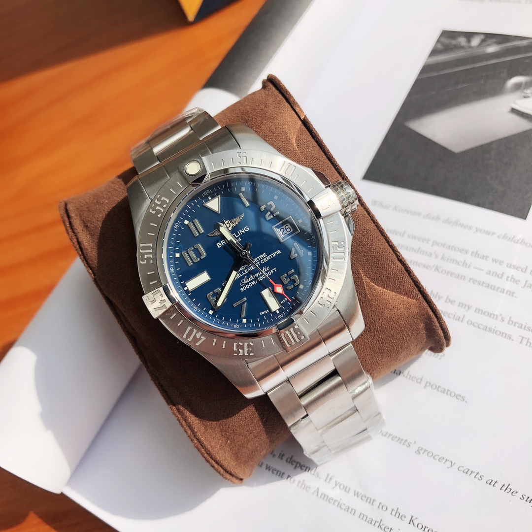 Original Title: The Breitling Avenger series! The watch features a robust stainless steel case with a diameter of 45 mm and a water resistance of up to 3000 meters. It is equipped with an automatic movement certified by the Swiss Official Chronometer Testing Institute (COSC), perfectly showcasing the youthful, dynamic, and invincible spirit of the Challenger series. The four iconic bezel indicators on the satin-brushed bezel not only ensure optimal operability but also effectively protect the double-sided anti-reflective sapphire crystal. Available with steel or leather straps, both adorned with large luminous hands and hour markers.