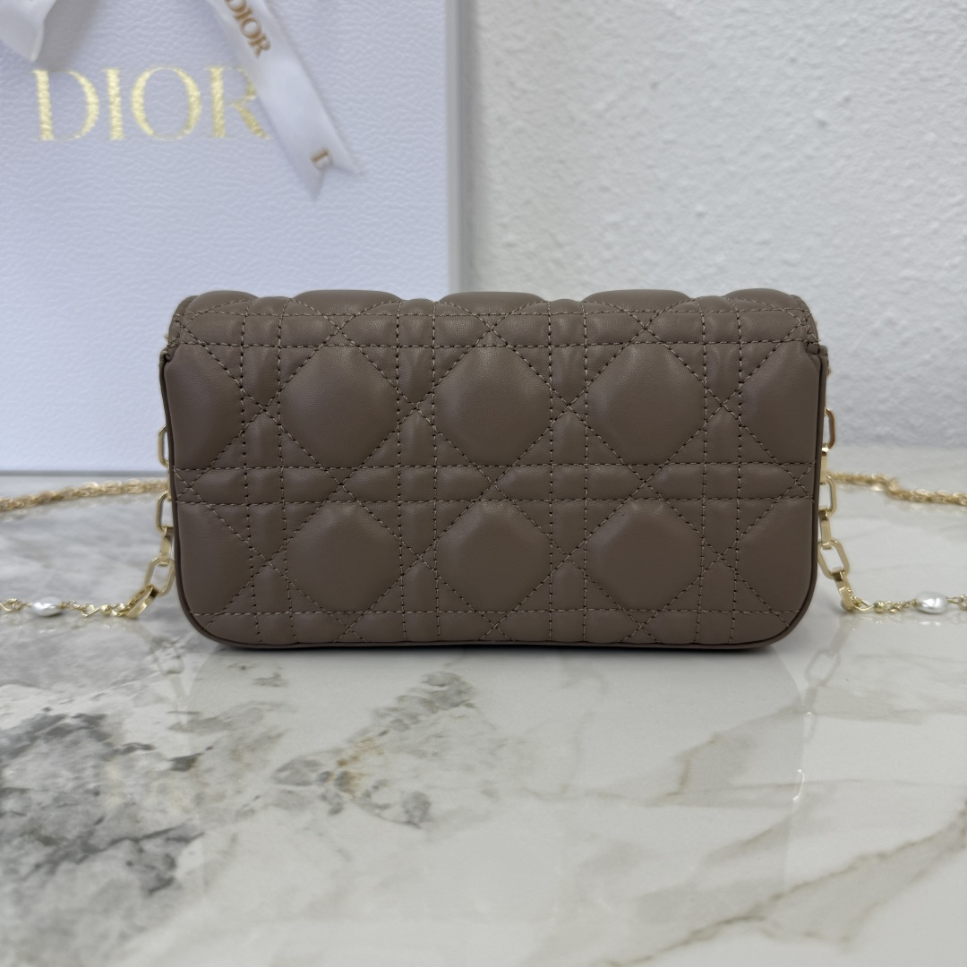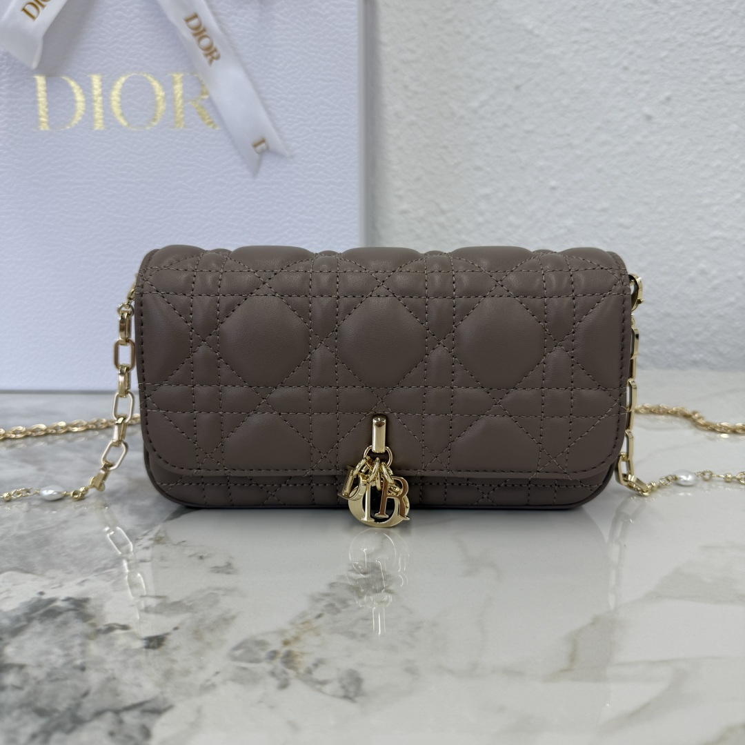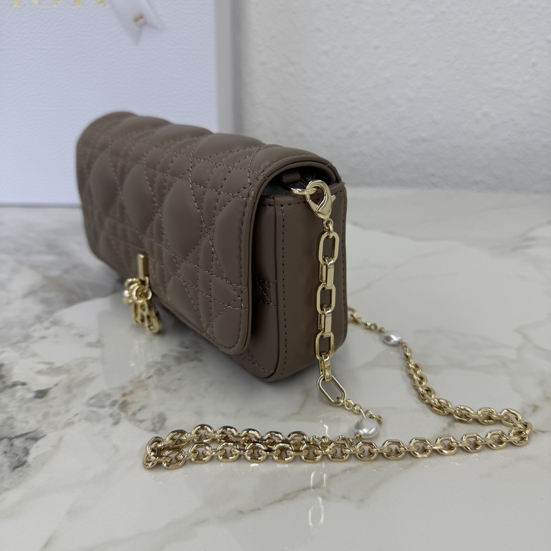 My Dior - Dior Talk phone pouch is elegant and unique in style. Meticulously crafted from taupe lambskin, adorned with a cannage pattern, and paired with a light gold-finish metal D.I.O.R. charm. The elegant design features a removable chain decorated with resin beads, allowing it to be carried by hand, on the shoulder, or across the body.