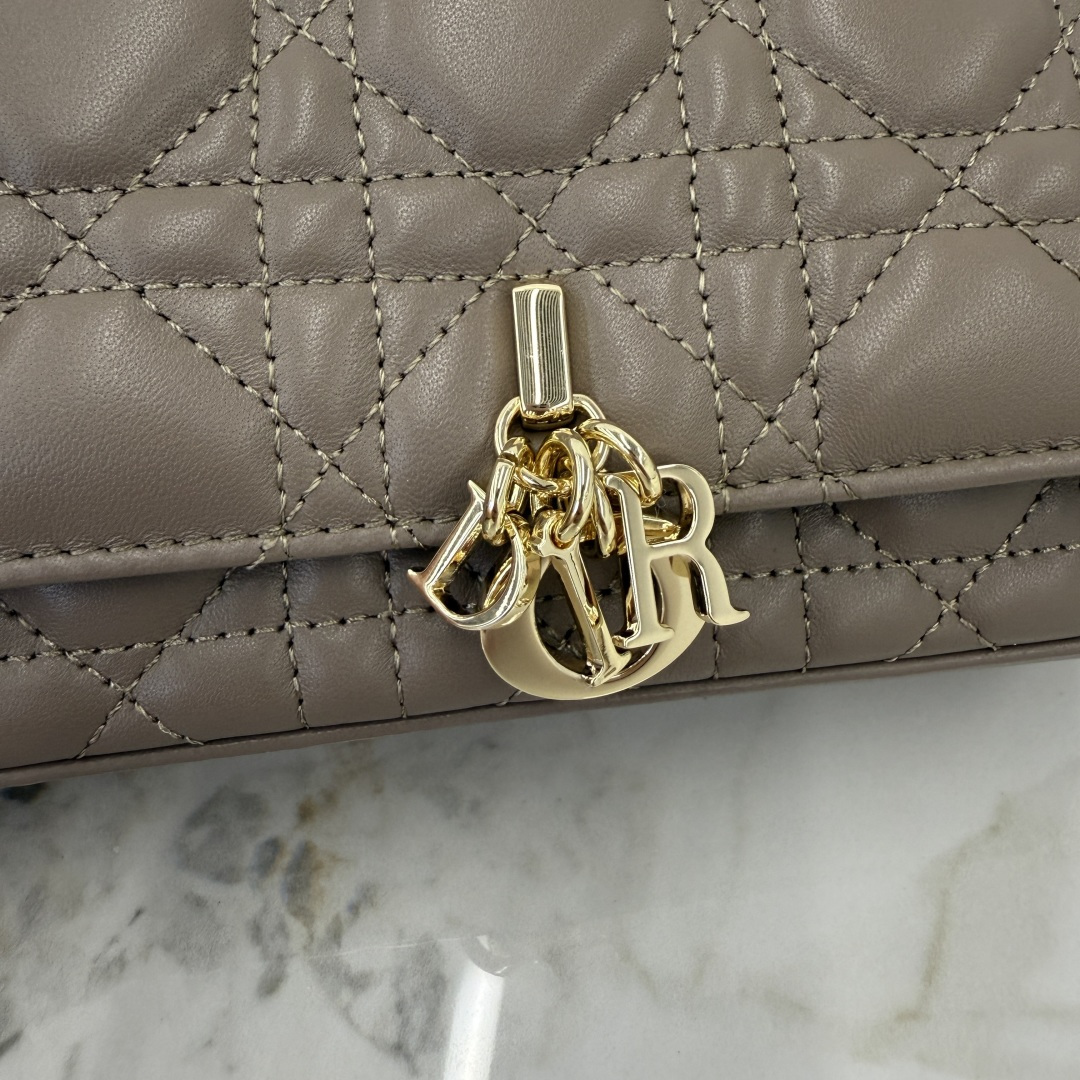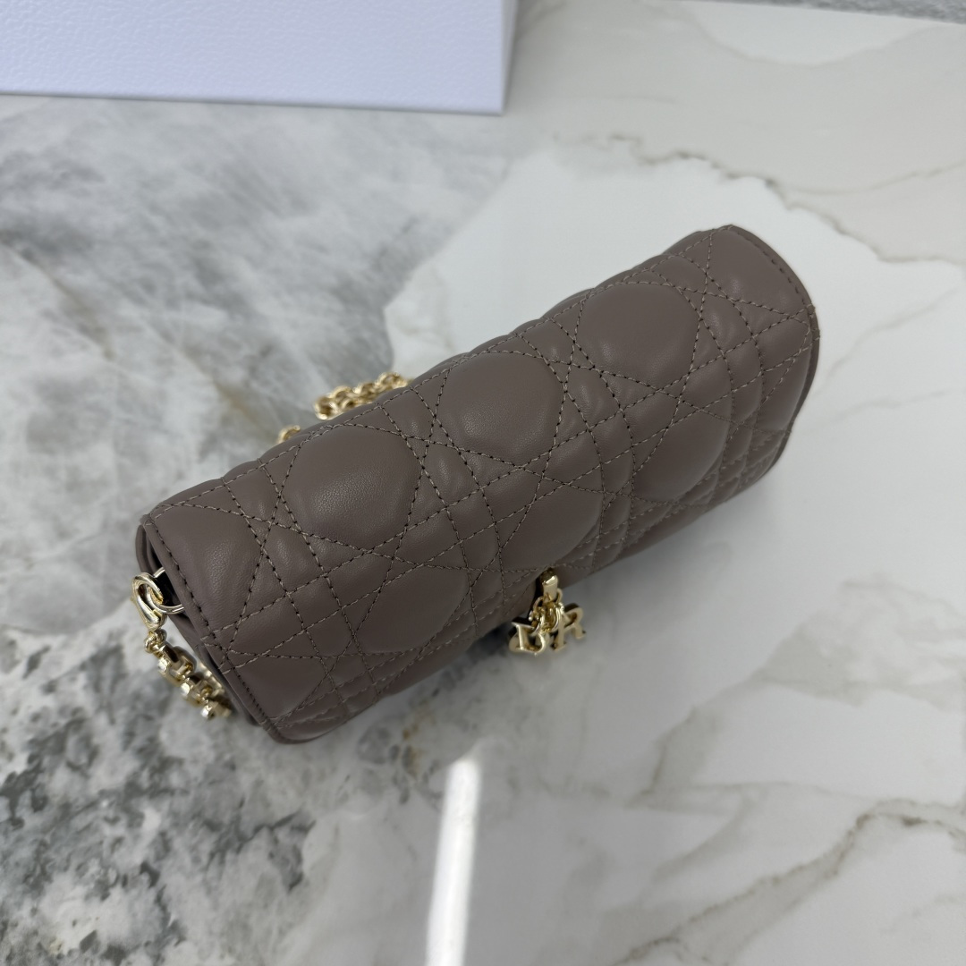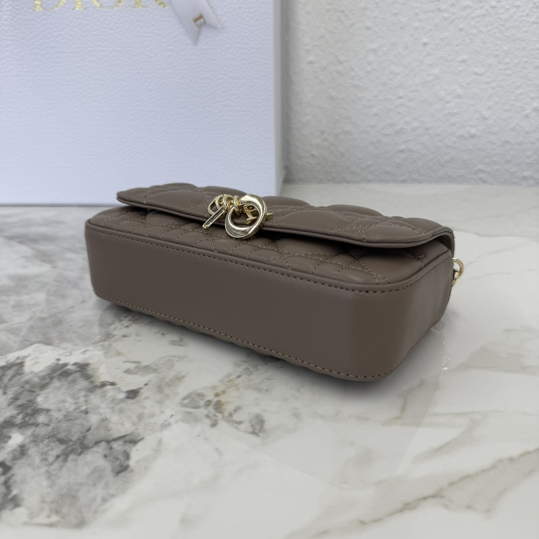 My Dior - Dior Talk phone pouch is elegant and unique in style. Meticulously crafted from taupe lambskin, adorned with a cannage pattern, and paired with a light gold-finish metal D.I.O.R. charm. The elegant design features a removable chain decorated with resin beads, allowing it to be carried by hand, on the shoulder, or across the body.