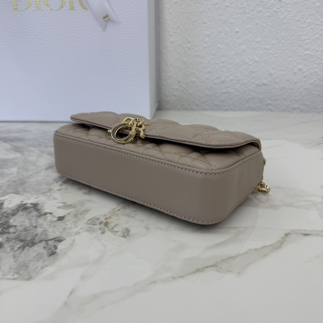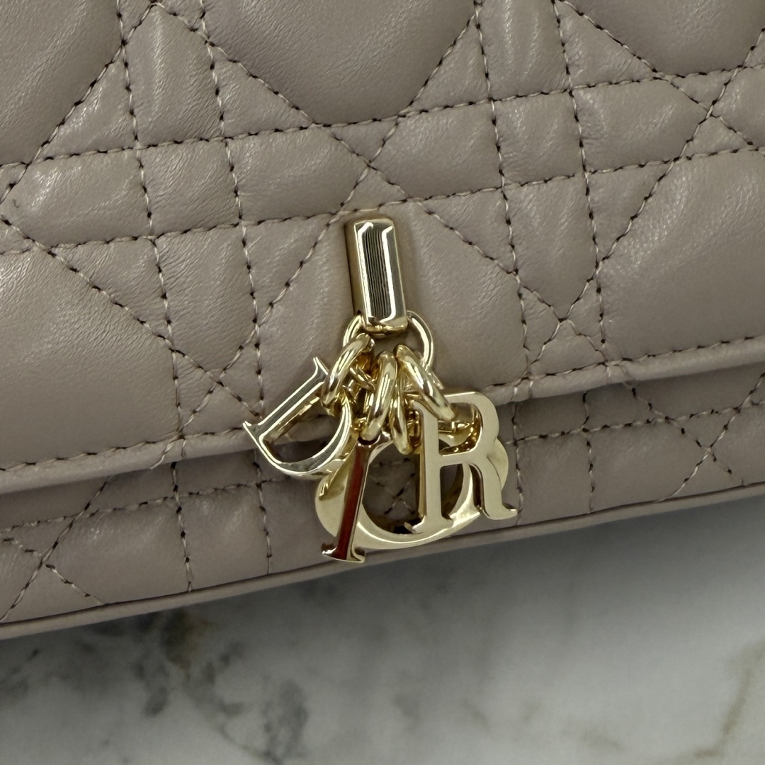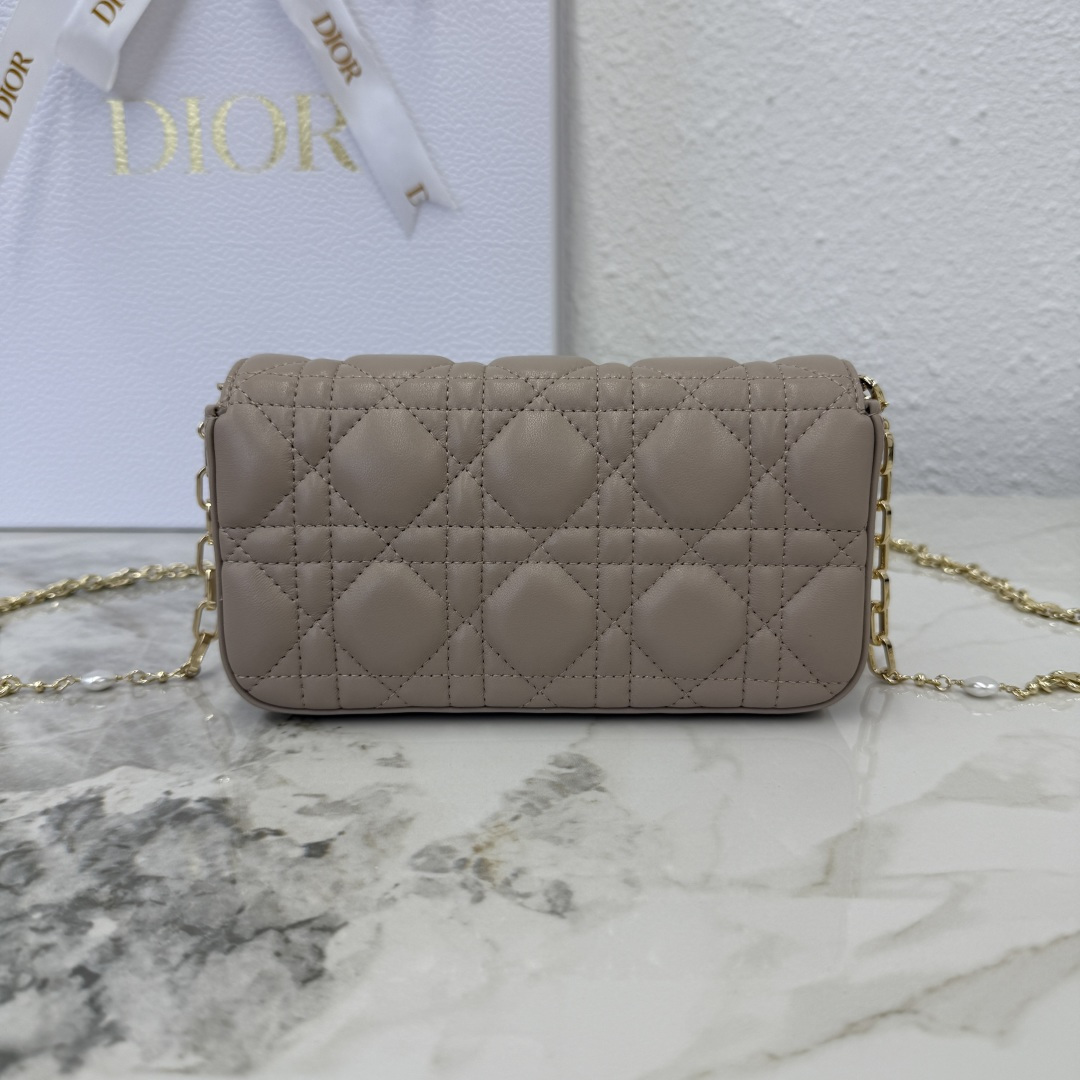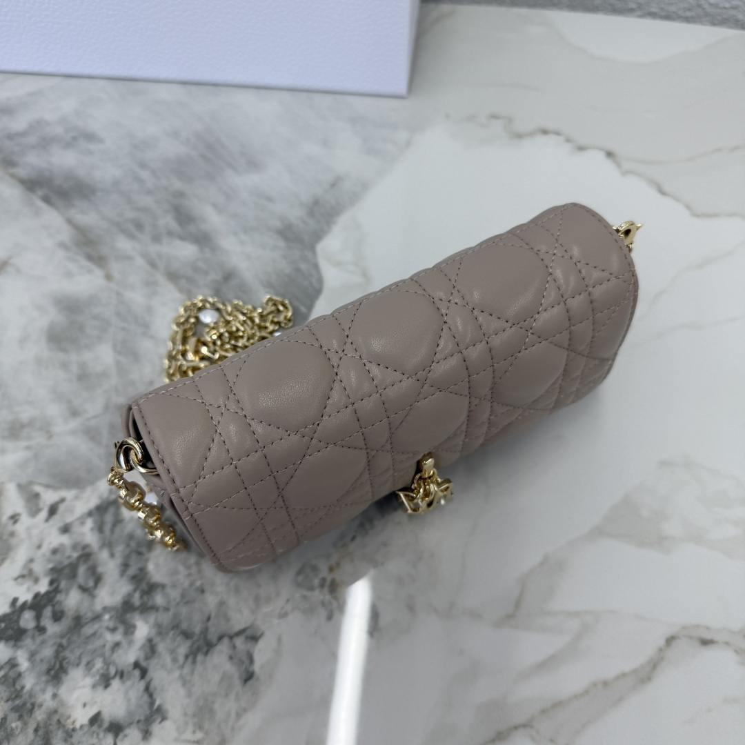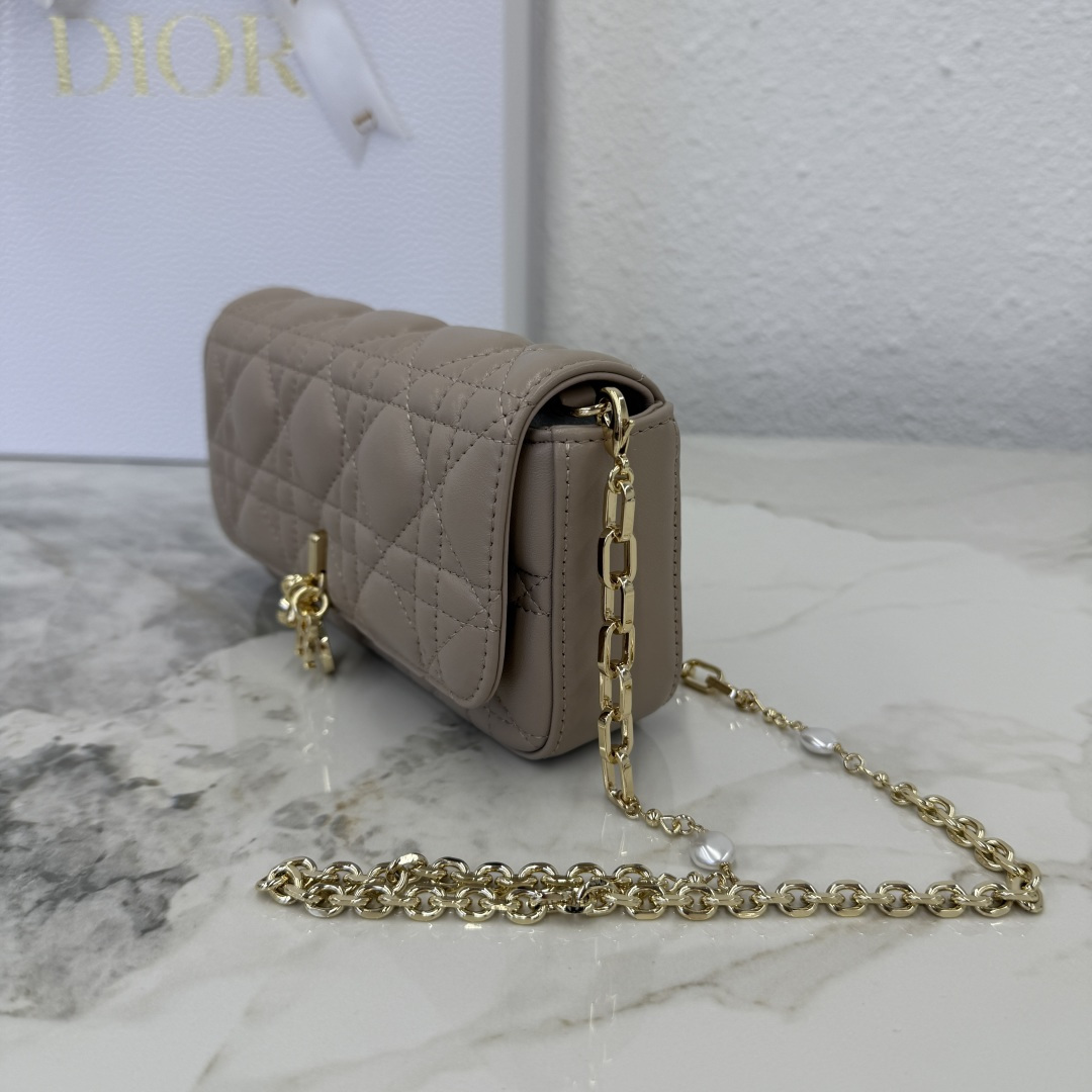 My Dior - Dior Talk phone pouch is elegant and uniquely crafted. Made from blush beige lambskin, adorned with a cannage pattern, and featuring a light gold-finish metal D.I.O.R. charm. The elegant design includes a removable chain decorated with resin beads, allowing it to be carried by hand, on the shoulder, or across the body.