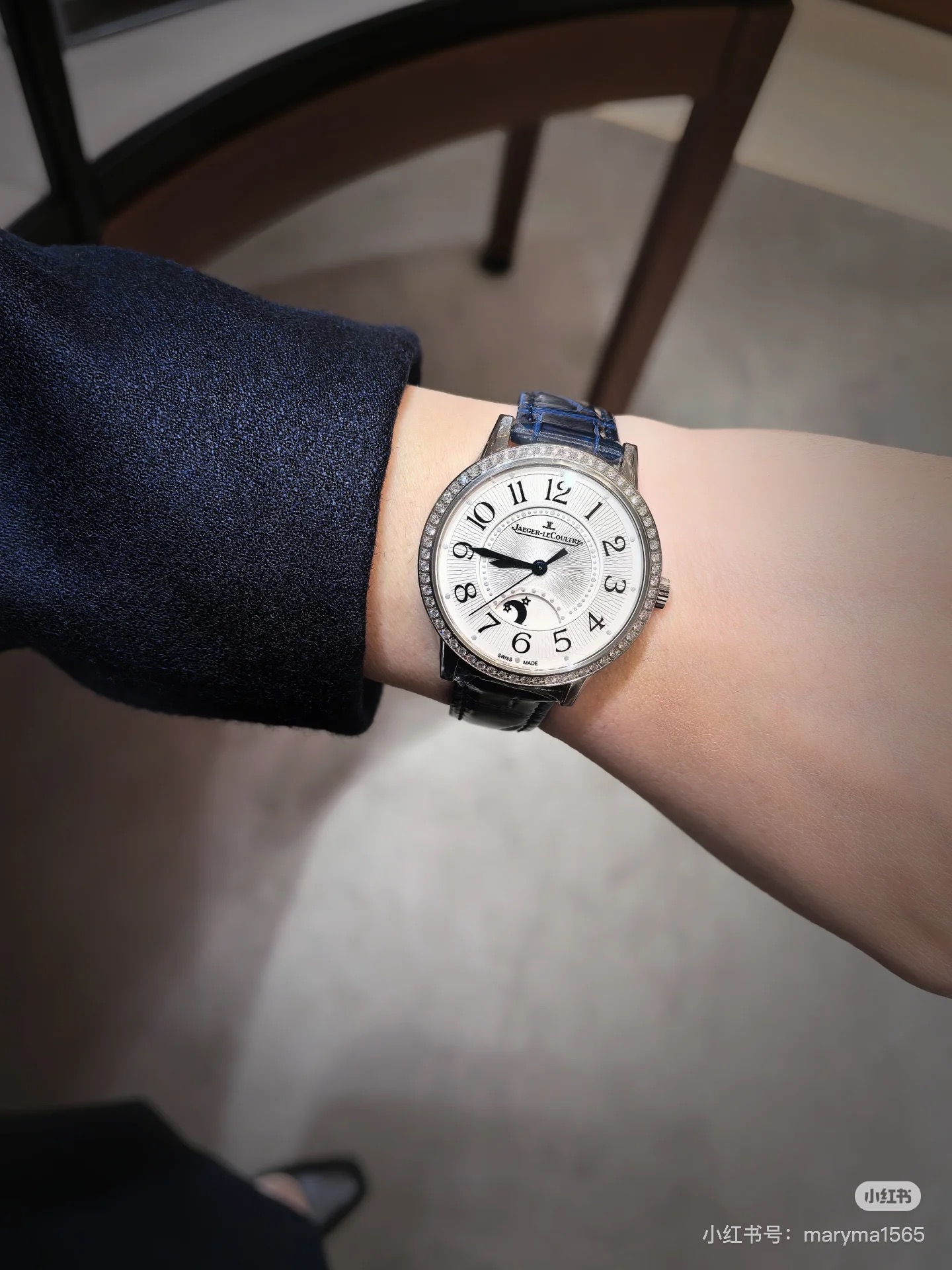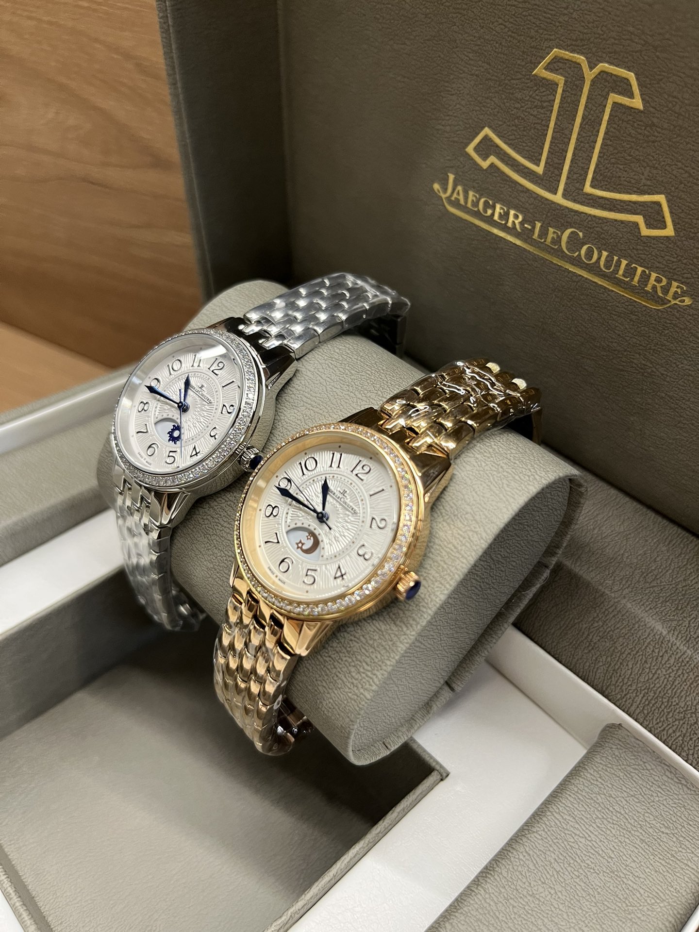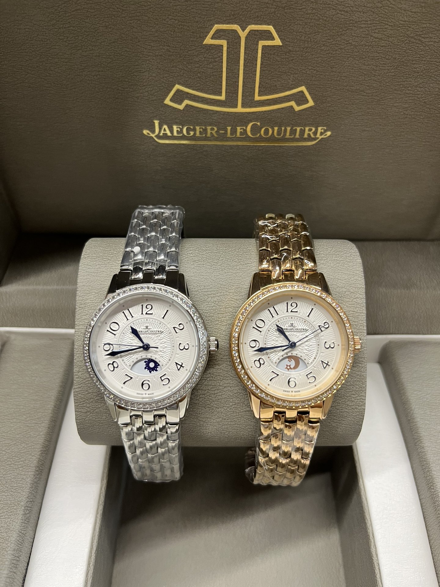 Jaeger-LeCoultre Rendez-Vous series high-quality women's watch, sun, moon, and star display, imported quartz movement, original folding clasp / stainless steel strap, dimensions width 33mm, thickness 10mm.
