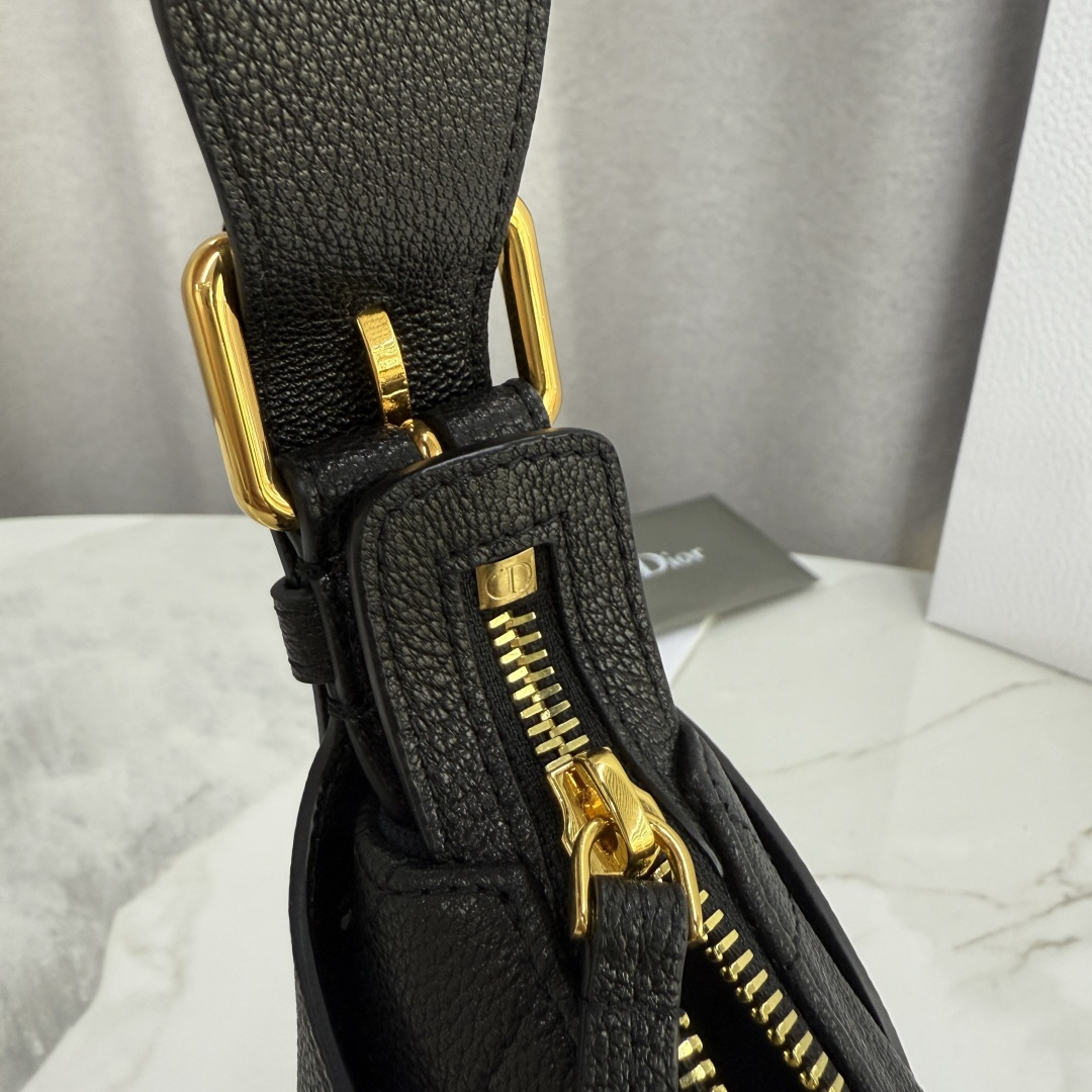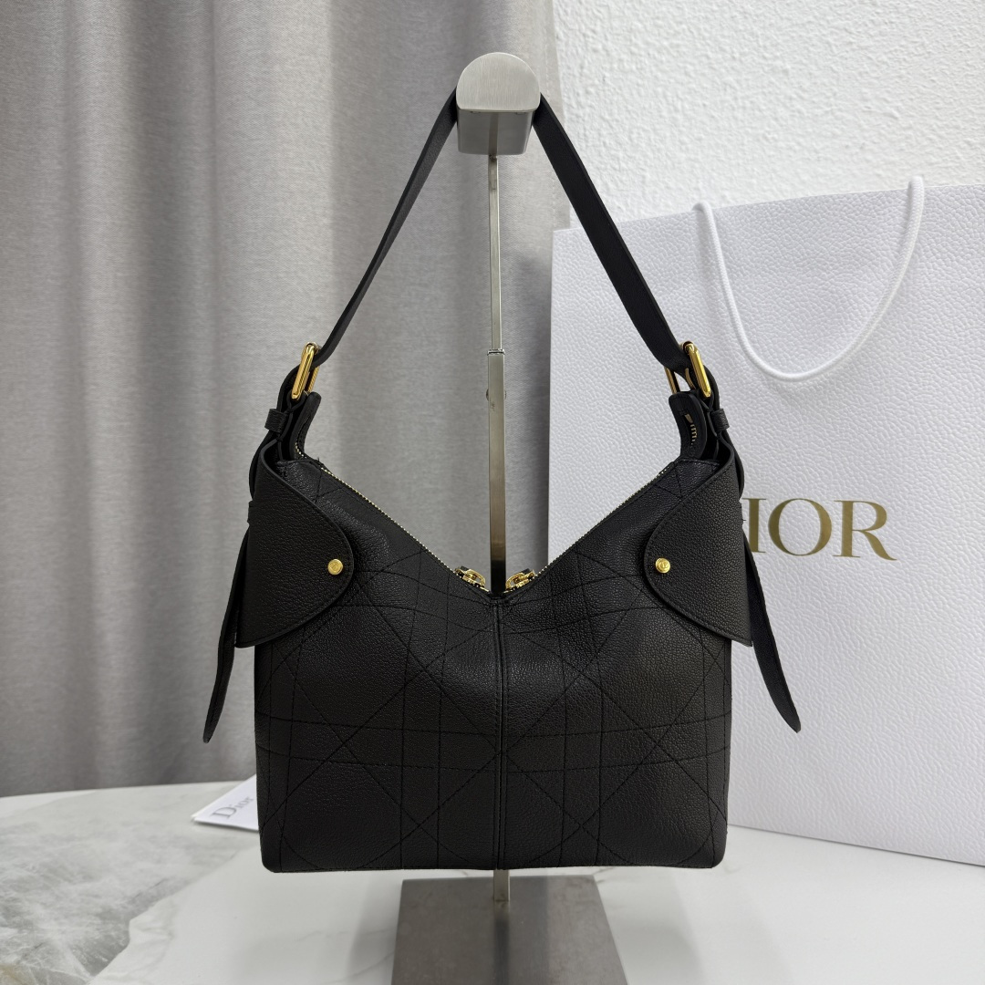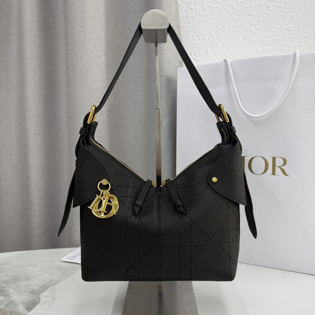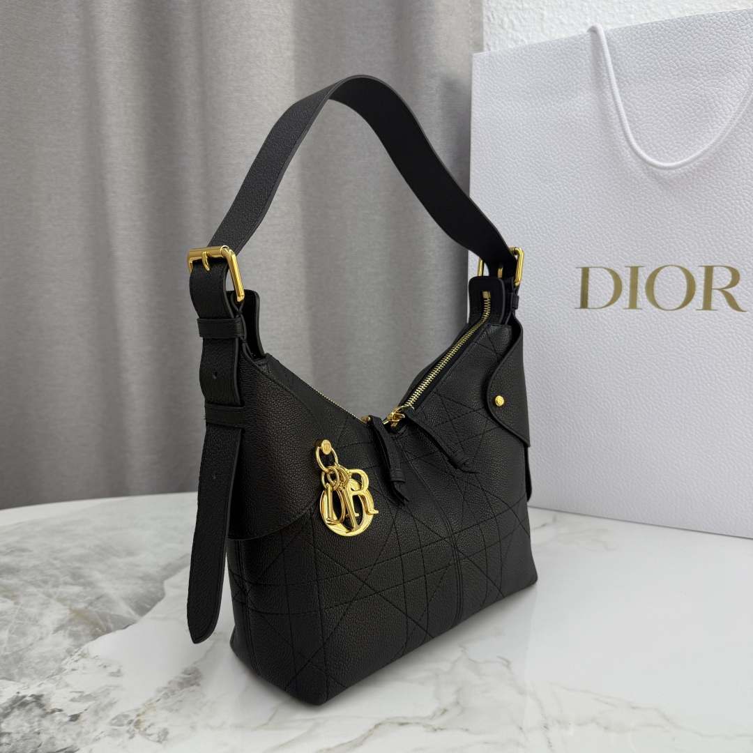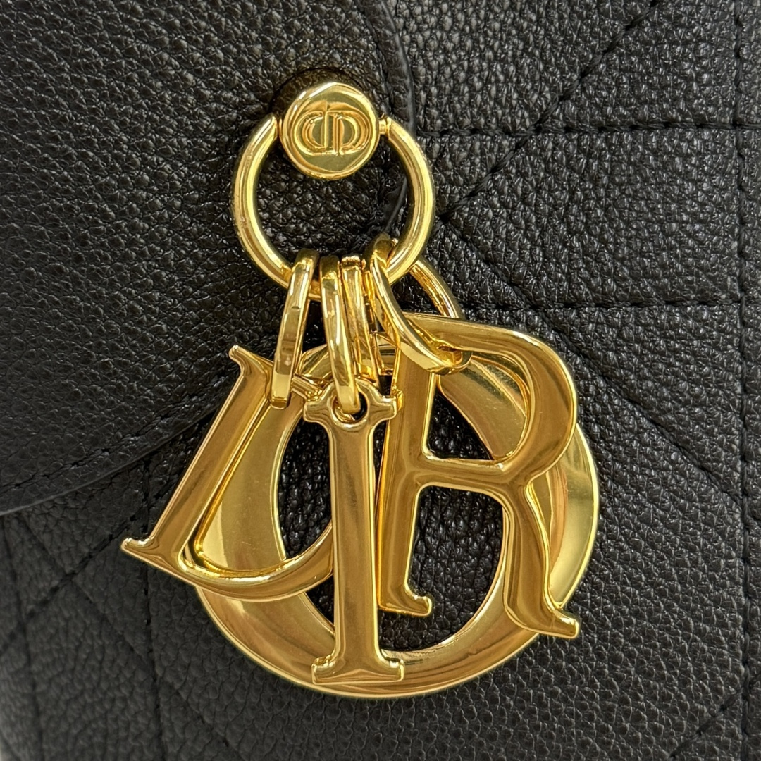 This Dior Voyage handbag is part of the early Spring-Summer 2026 ready-to-wear collection, combining soft lines and elegant details to create a harmonious silhouette. Meticulously crafted from black grained calfskin, it features flat, oversized cannage stitching, offering a fresh interpretation of Dior's classic motif. The soft structure is enhanced by a vintage gold-finish metal D.I.O.R. charm and meticulously crafted leather accents, adding sophistication and structure to the shape. The main compartment is secured with a practical and safe two-way zip fastening. In a small size, it features a top handle with an adjustable clasp, allowing it to be carried by hand or on the shoulder, making it an ideal companion for everyday styling.