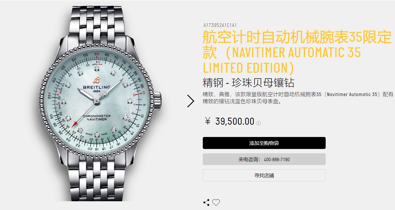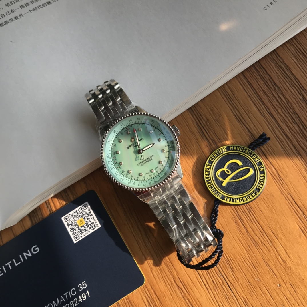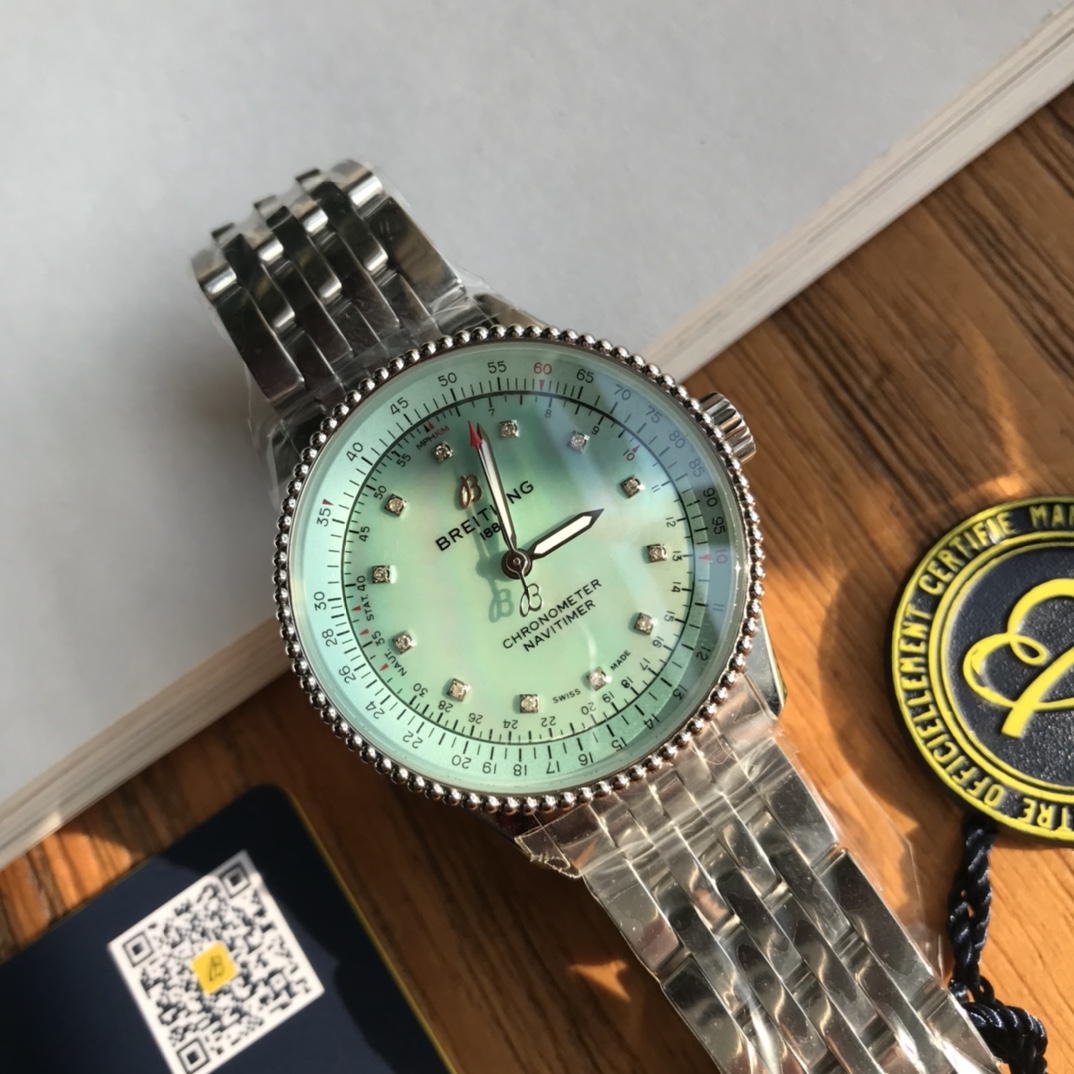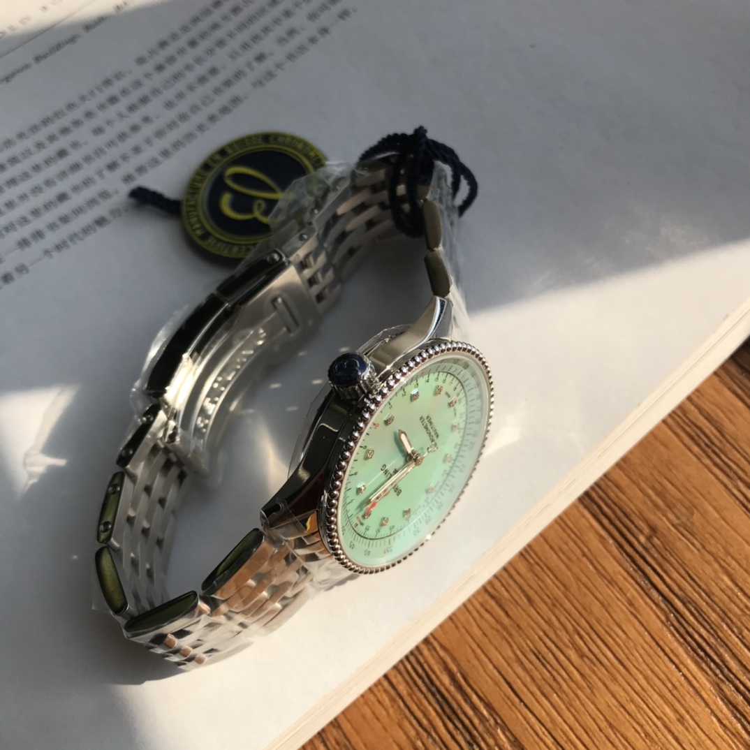 New arrivals are truly stunning! The watch face features 12 real diamonds paired with an exquisite colorful mother-of-pearl dial!! Original Breitling Navitimer automatic watch, designed for women with elegance and sophistication, carefully blending classic historical charm with precise modern watch design. The watch features a 35 mm case, equipped with a beaded bezel and a series of elegant and refined dial styles, such as silver, blue, copper dials, or a white mother-of-pearl dial set with diamonds. The watch is powered by the original Swiss SW200 movement (officially certified by Breitling as the Breitling B17 movement). Official website sells for tens of thousands! You know our quality and pricing!