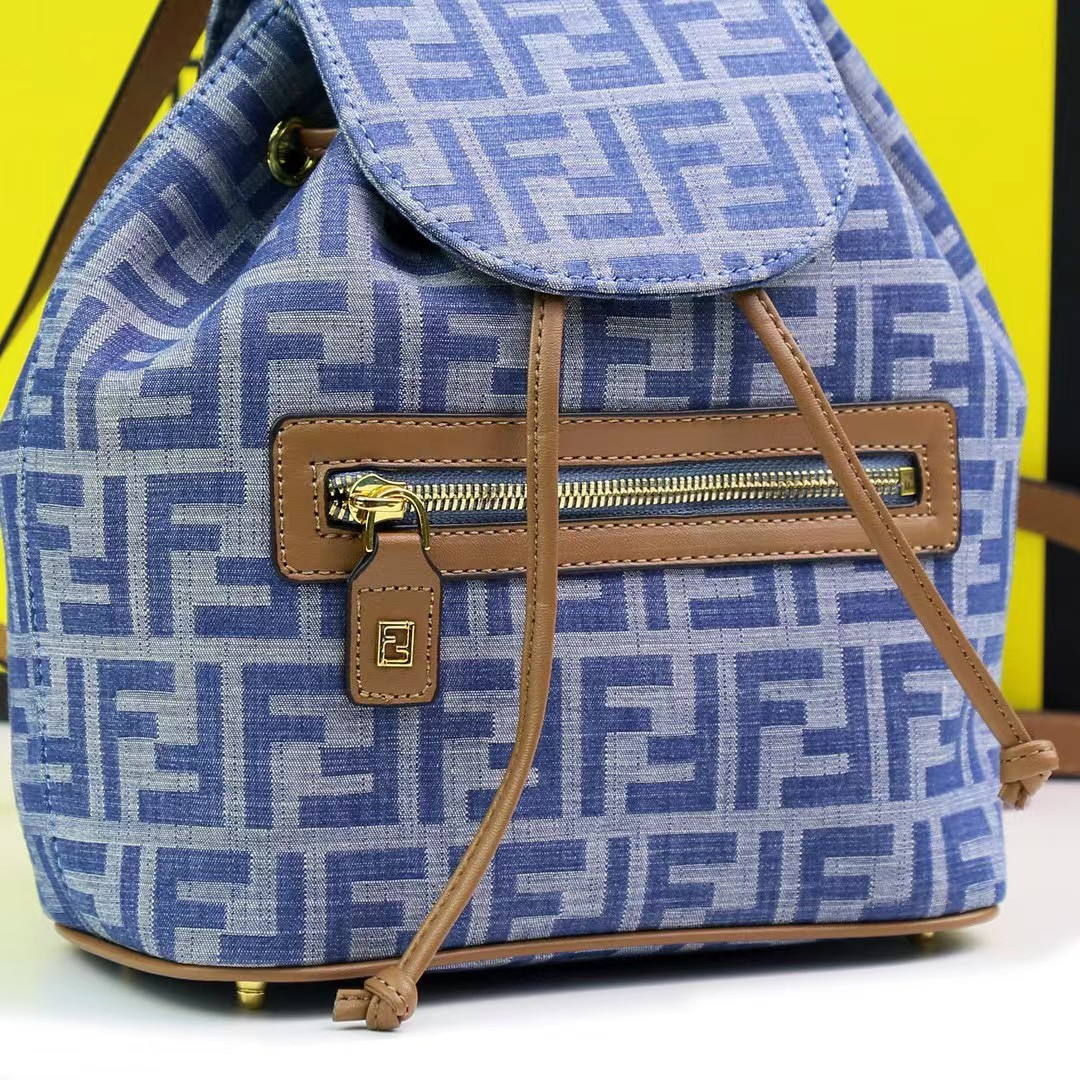 Factory Direct Sale FEND1 Denim Backpack Fendi Vintage Top Condition. This small backpack is truly exceptional. The overall bag design, along with this year's latest combination of light blue double F denim and brown leather, gives an excellent feel. It's easy to pair and doesn't require a specific style to carry, making it a must-have for street outings. Size: 23×11×20cm