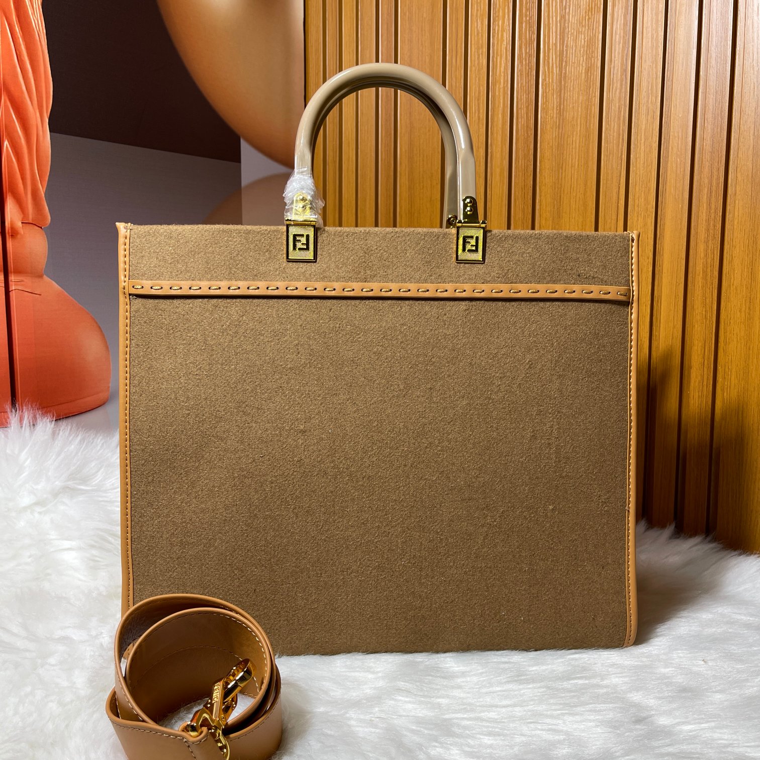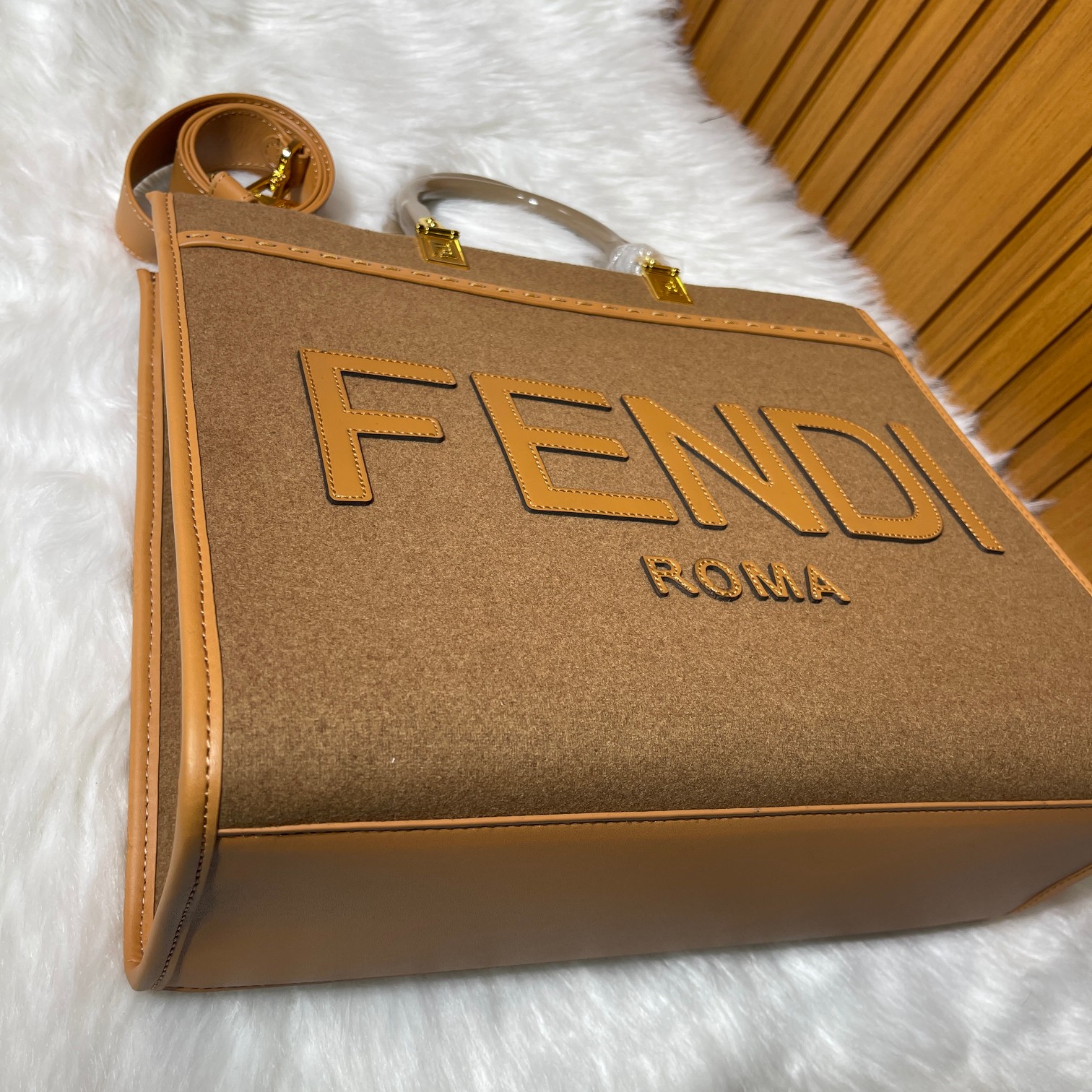 Printed with brown FF jacquard pattern and light brown leather FENDI ROMA lettering, with hard leather handles. Features a spacious lined interior compartment, light brown leather trim, and gold-finished metal hardware. Can be carried using the dual handles; two internal clasps can be used to secure the shoulder strap. Dimensions: 36cm Model 8835