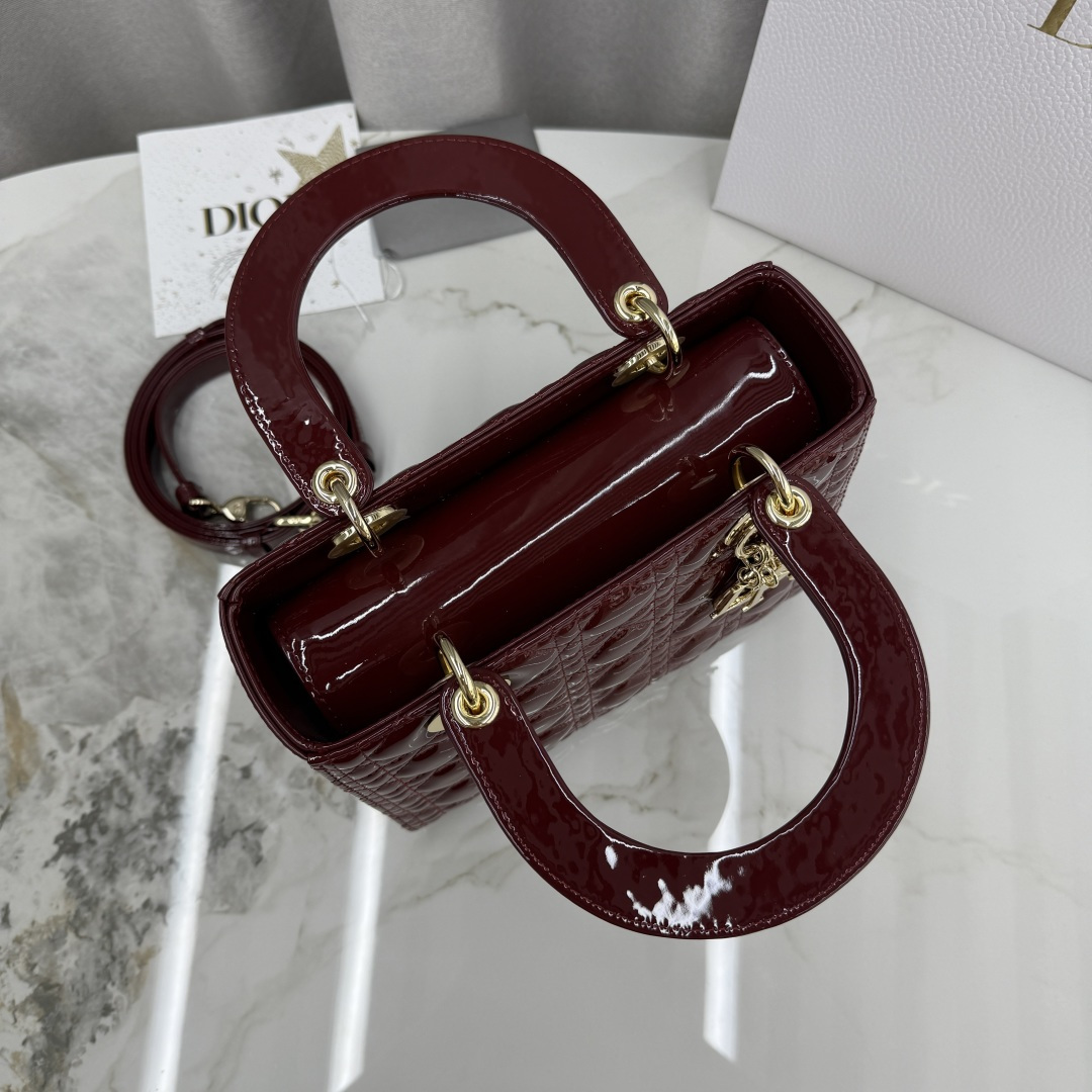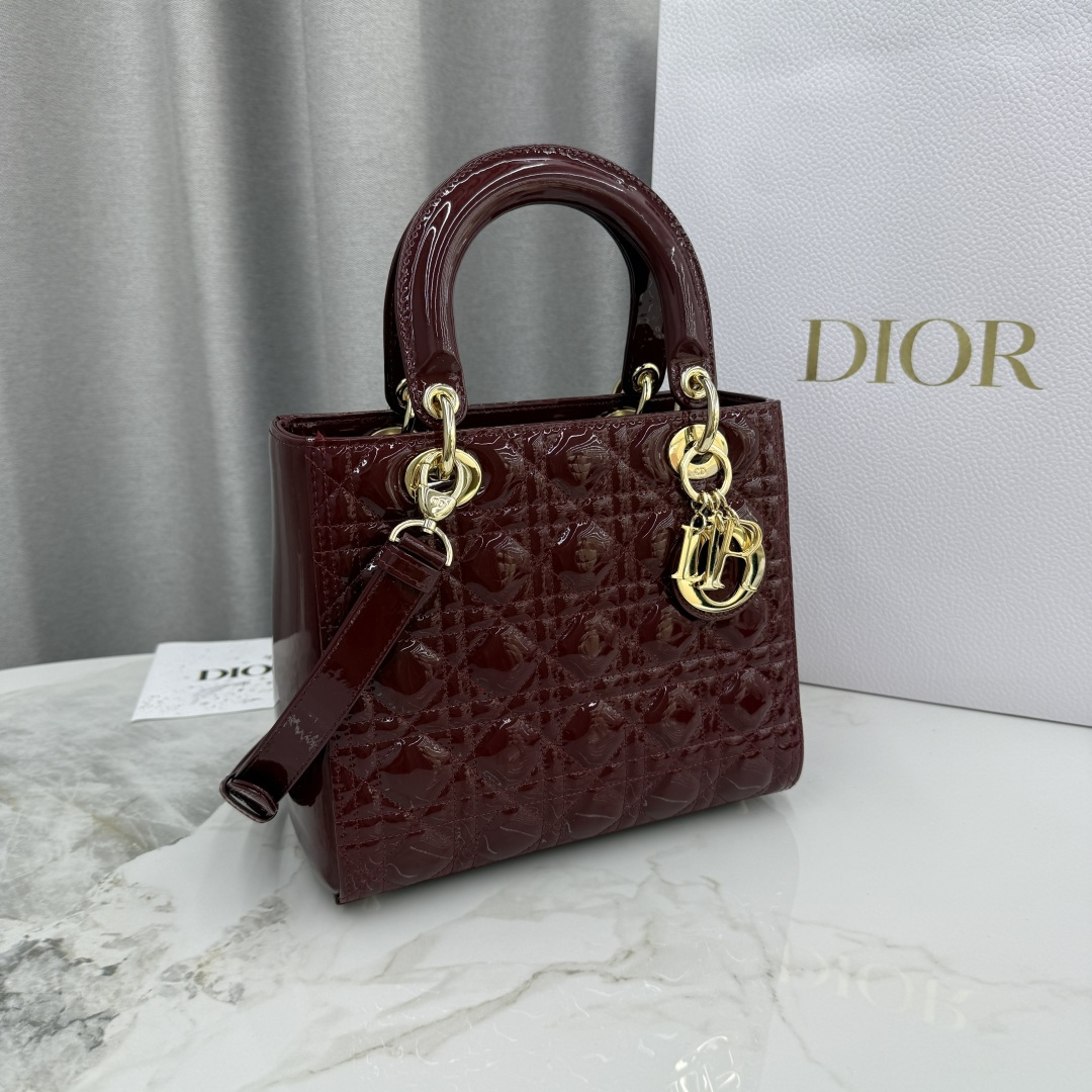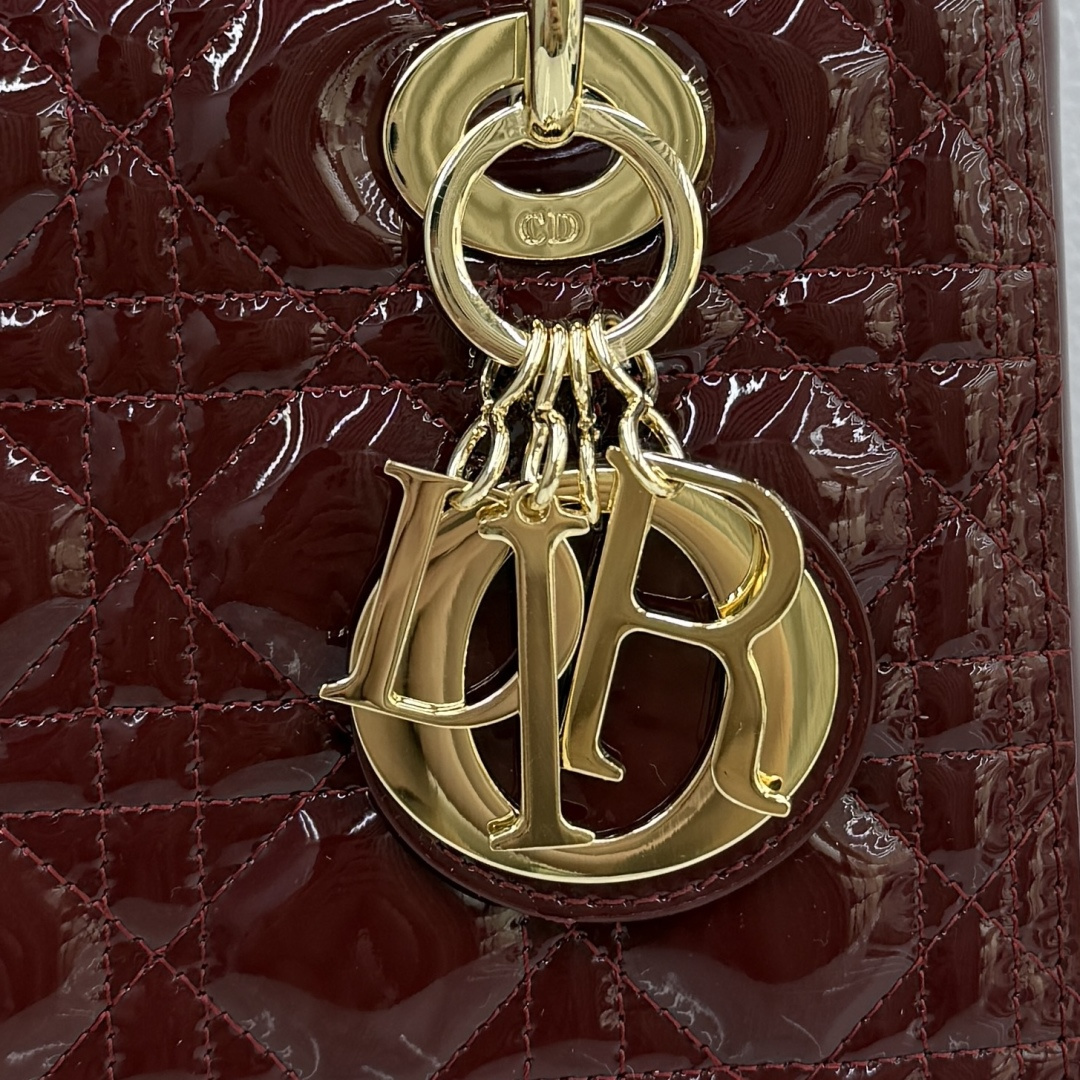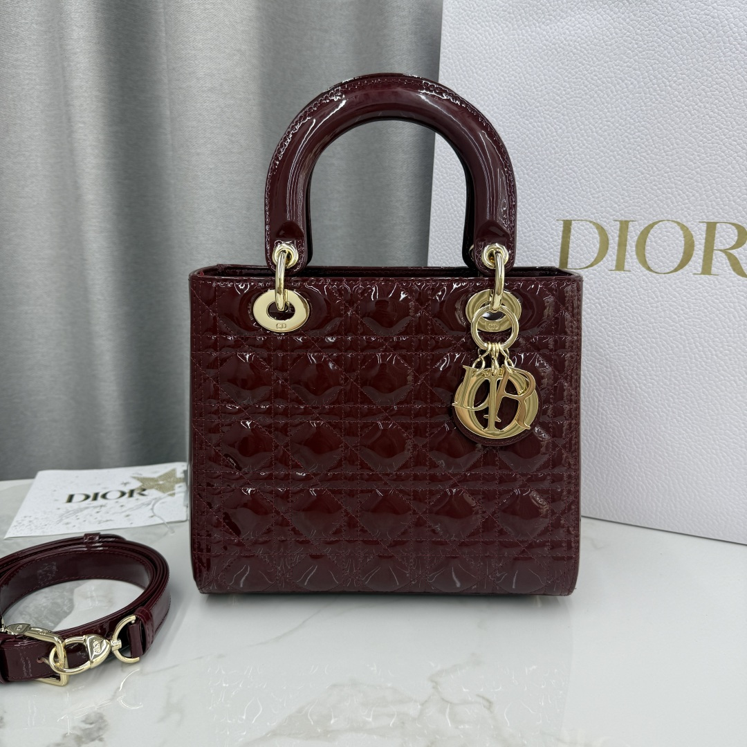This Lady Dior handbag embodies Dior's profound insight into elegance and beauty. The stylish and elegant design is timeless. Meticulously crafted from burgundy patent calfskin leather, adorned with cannage quilting and stitching, the quilted texture is eye-catching. Paired with a light gold-finished metal D.I.O.R. charm, it adds a touch of dynamism to the exquisite silhouette. Medium size, featuring a detachable leather thin strap, can be carried by hand or across the body.