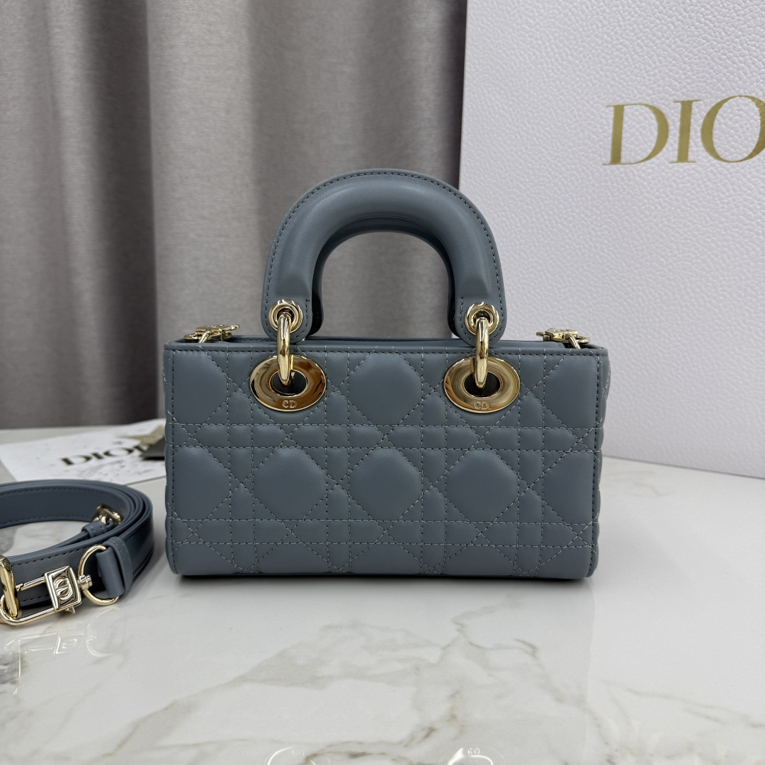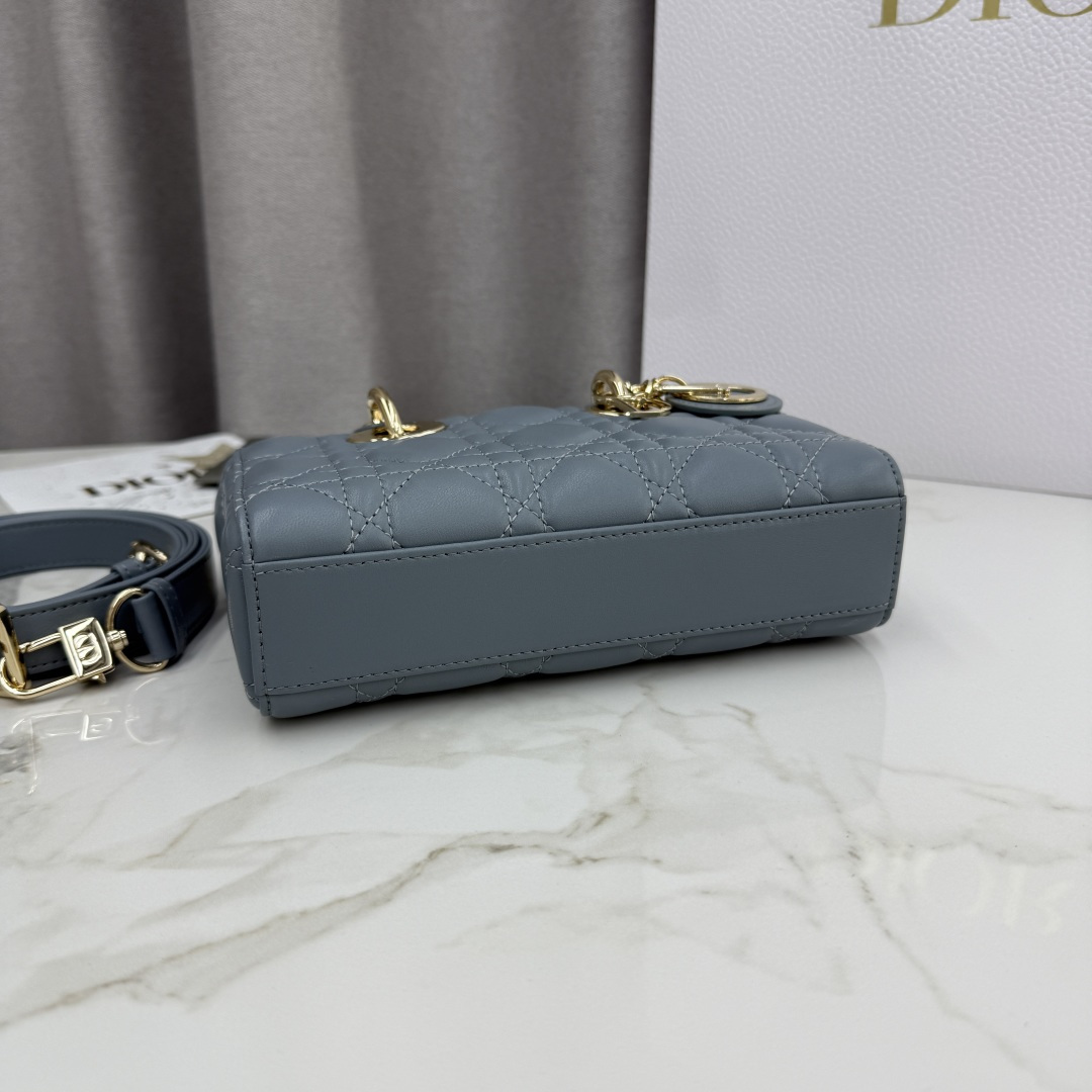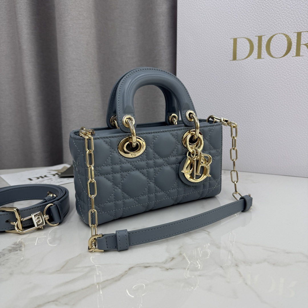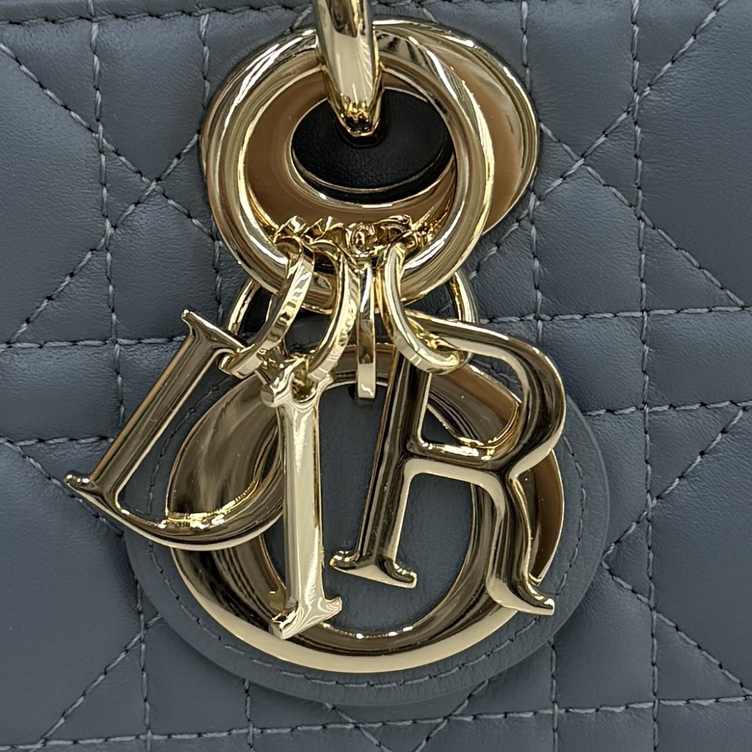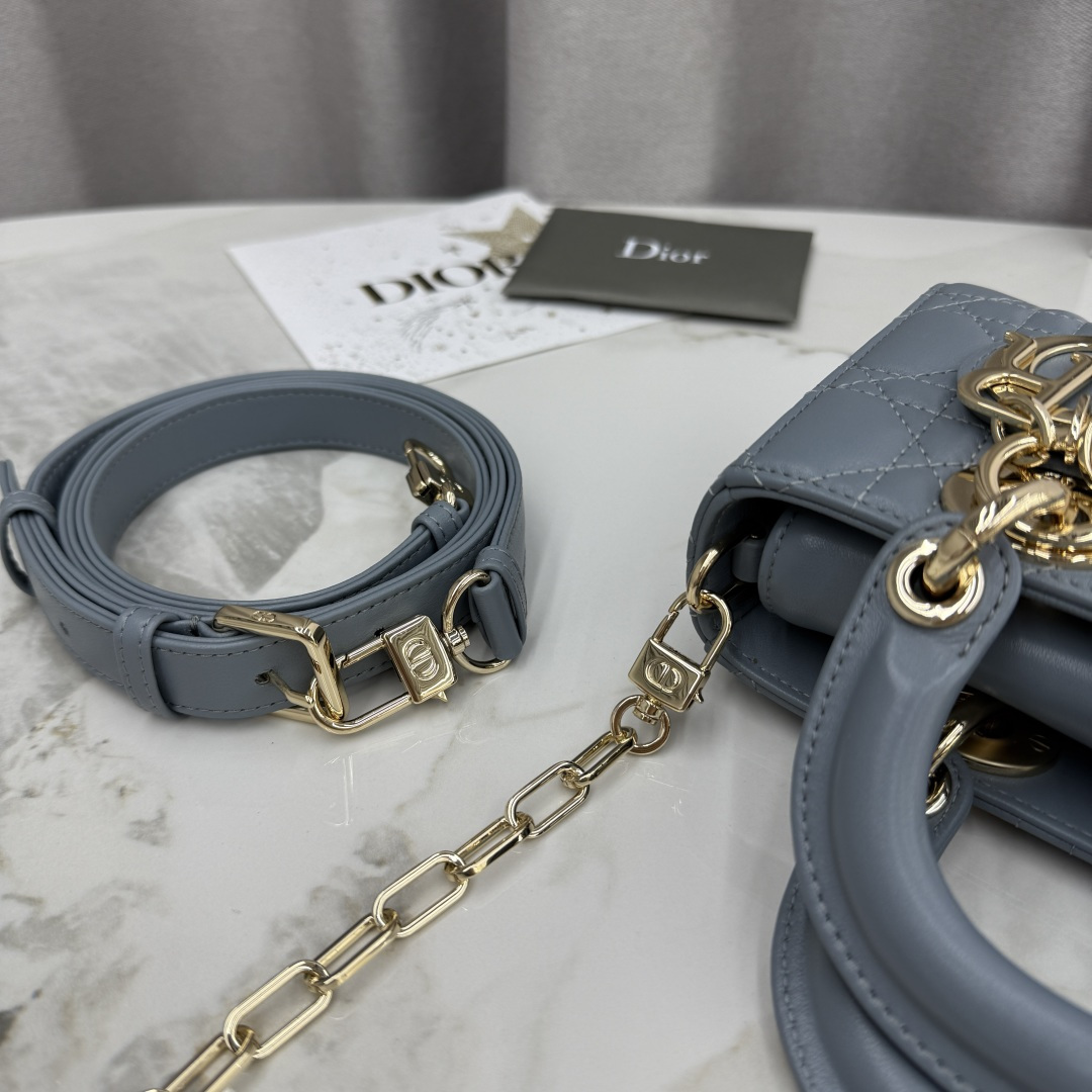 This Lady D-Joy handbag is a new addition to the 2025 Autumn-Winter ready-to-wear collection, highlighting the classic minimalist aesthetic of the Lady Dior line and fully embodying Dior's profound insight into elegance and beauty. Meticulously crafted from misty blue lambskin leather and adorned with cannage stitching, its stylish and elegant design is timeless. The light gold-toned metal D.I.O.R. charm enhances its sophistication, adding a touch of dynamism to the exquisite silhouette. The mini style comes with a detachable chain strap and an adjustable, detachable leather strap, allowing it to be carried by hand, on the shoulder, or across the body, making it an ideal choice for everyday styling.
