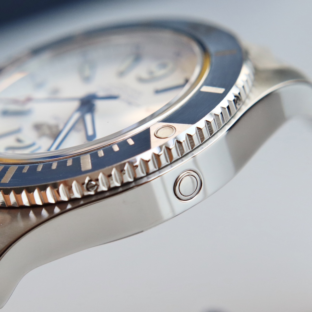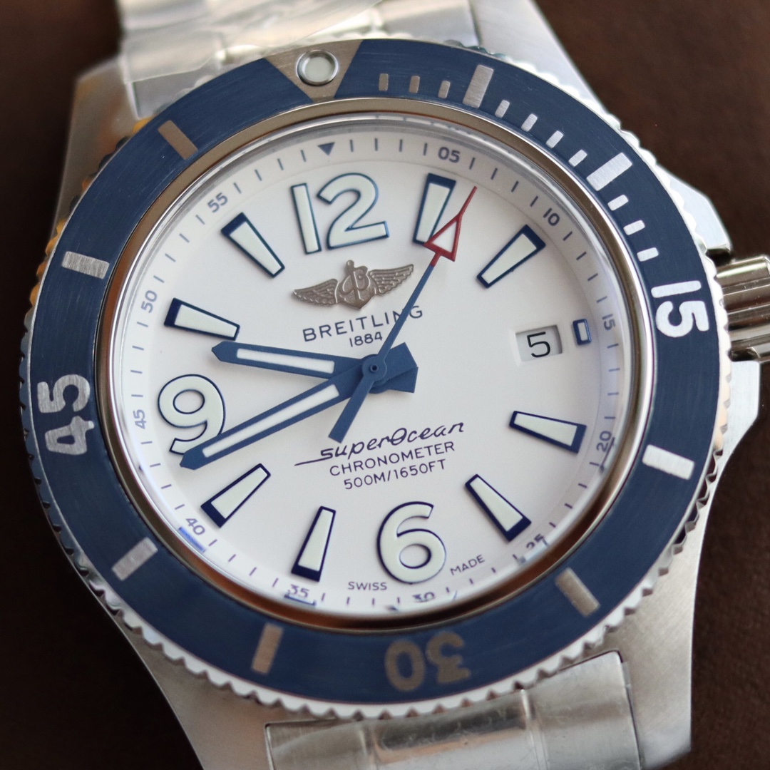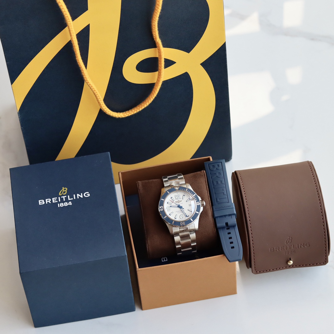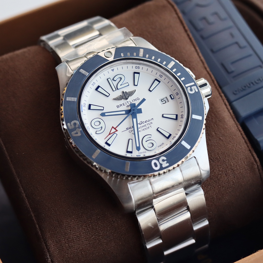 Batch, latest arrival Original Breitling genuine Breitling Superocean automatic mechanical watch, fresh, colorful, and sporty, specially designed for men who pursue excellent watch performance and modern style. The sense of power, functionality, and cool contemporary style outline the classic image of Breitling's ocean series. It features a sturdy 44mm stainless steel case, a ratcheted unidirectional bezel, and is equipped with an original Swiss ETA SW200 automatic mechanical movement. The curved sapphire crystal is anti-reflective on both sides. Channel stock, absolutely stunning in price and style, retailing for over ten thousand at counters, comes with an additional strap, full original packaging for shipment.