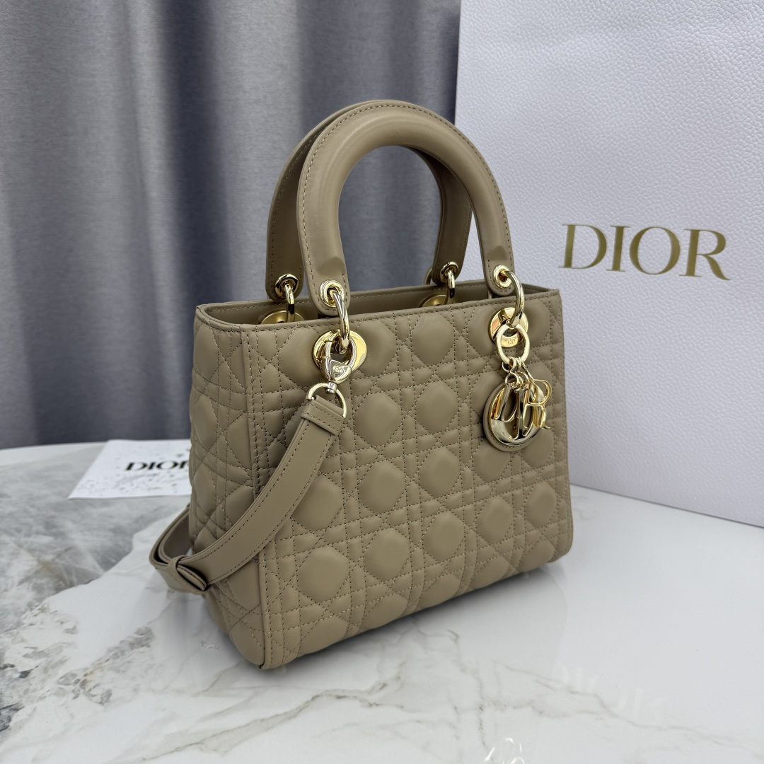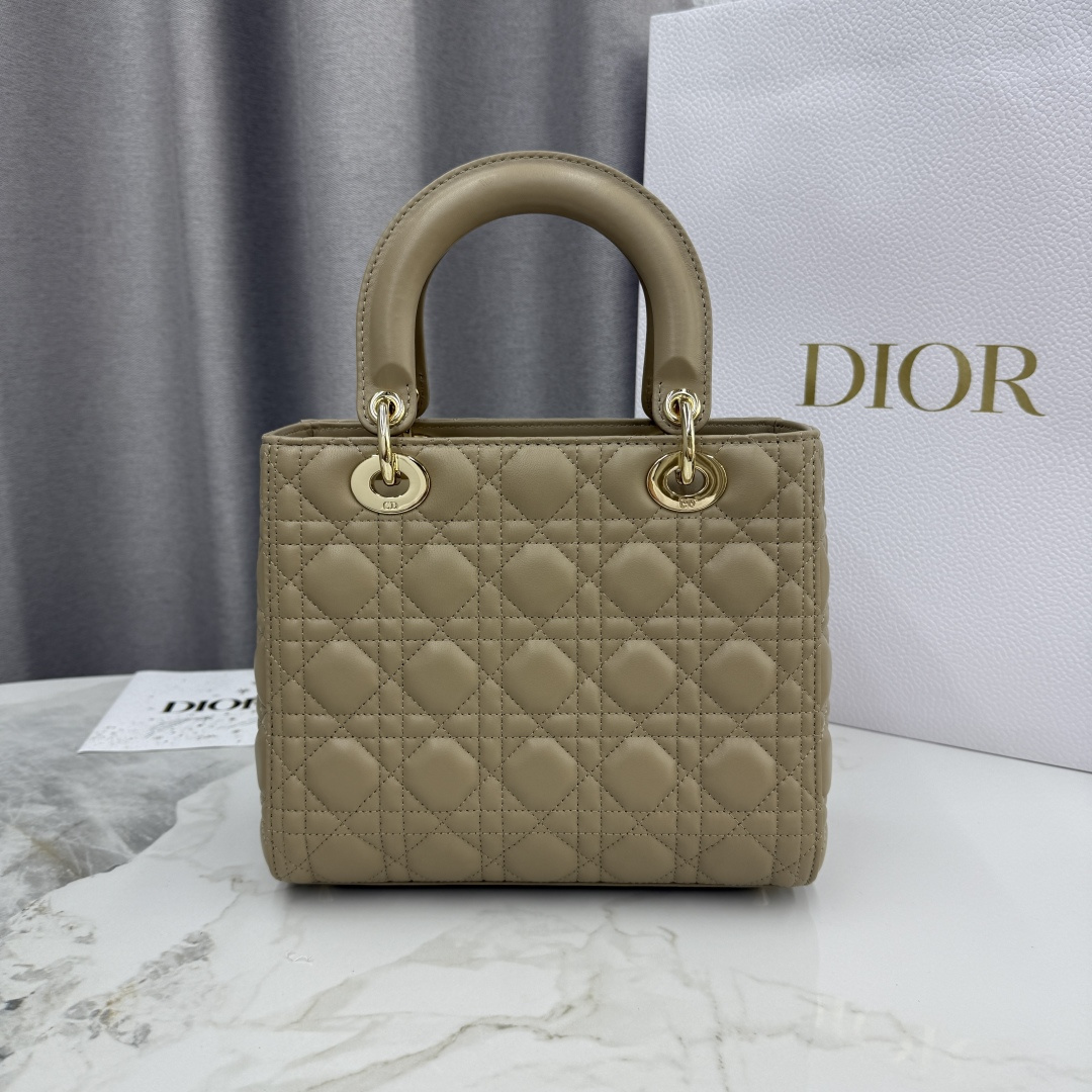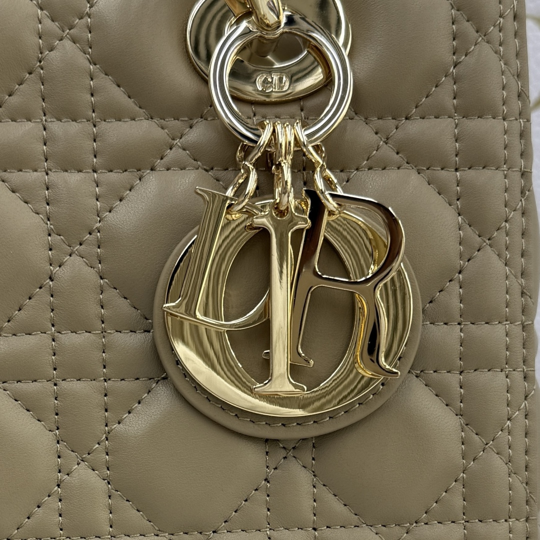 This Lady Dior handbag embodies Dior's profound insight into elegance and beauty. Meticulously crafted from beige-apricot lambskin, it features striking quilted details with cannage stitching, presenting a timeless and chic design. Adorned with a light gold-finished metal D.I.O.R. charm, it exudes an elegant temperament. The medium size comes with a detachable leather shoulder strap, allowing it to be carried by hand or worn crossbody.