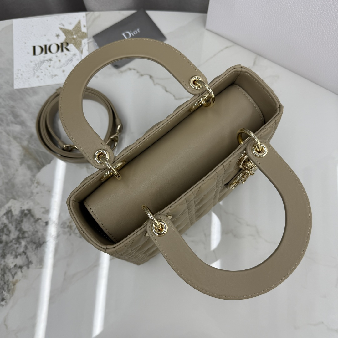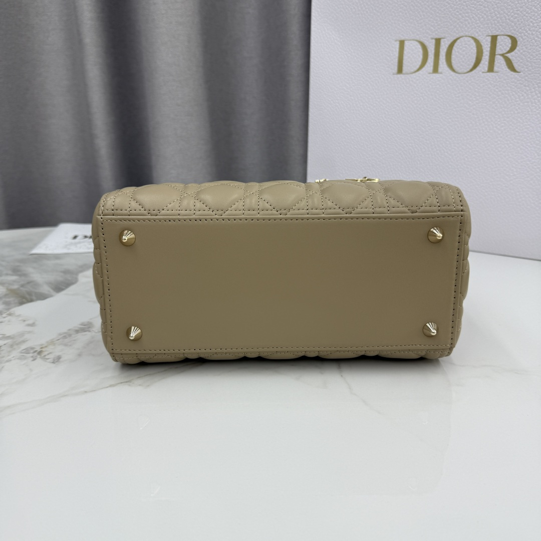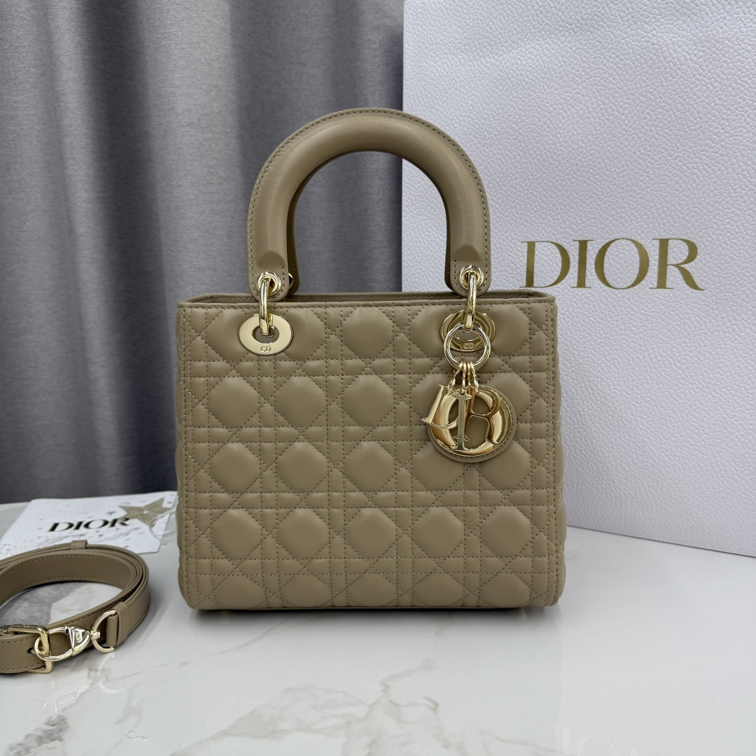 This Lady Dior handbag embodies Dior's profound insight into elegance and beauty. Meticulously crafted from beige-apricot lambskin, it features striking quilted details with cannage stitching, presenting a timeless and chic design. Adorned with a light gold-finished metal D.I.O.R. charm, it exudes an elegant temperament. The medium size comes with a detachable leather shoulder strap, allowing it to be carried by hand or worn crossbody.