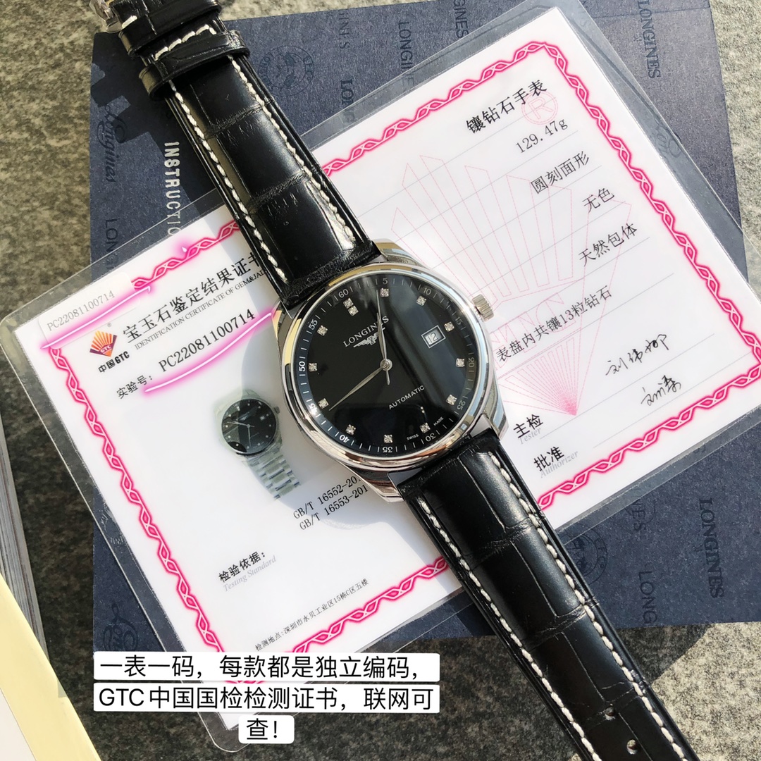 Top-tier Longines "Master Collection Genuine Diamond Edition" authentic, a century-old classic, ultra-thin design style presents the wearer with a minimalist quality on the wrist. Genuine American alligator strap, comes with a steel bracelet! Case diameter 40mm, silver triple-fold safety clasp and push-button opening mechanism, "exhibition caseback" Swiss fully automatic mechanical movement, the movement's dynamism is clear at a glance! Water resistance 30 meters, lug width 21mm, silver "grain" patterned dial, set with 13 high-quality VVS-SI grade diamonds from Wesselton, total weight 0.059 carats, each diamond watch comes with a diamond certificate issued by China's authoritative GTC certification body, ensuring every diamond is genuine, each certificate's inspection number is a unique serial number with no duplicates, scan the official website of the institution to verify! Silver-plated polished hands, scratch-resistant synthetic sapphire crystal glass, adorned with elegant diamond numeral hour markers, complementing the simple and aesthetically pleasing central blue steel large hands, making the time display clear and intuitive. The movement uses the highest grade Swiss SW200 observatory-certified fully automatic mechanical movement, original parts from factory channels, the strap, clasp, and case are all made from Swiss factory-specified standard 316 stainless steel for superior wear resistance and corrosion resistance! Ultra-clear English and numerical information on the caseback, hand color, and length craftsmanship are visible, one watch one code, caseback code, tag, and warranty card three codes match. Unremoved protective film supports returns, movement is free from human damage and comes with a lifetime warranty.