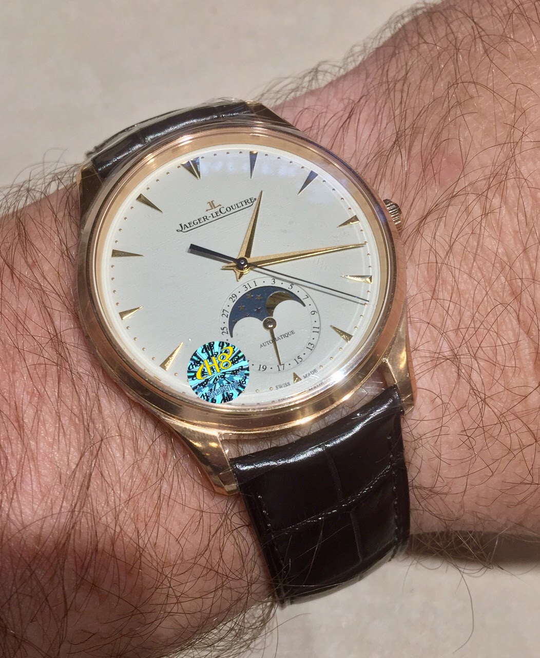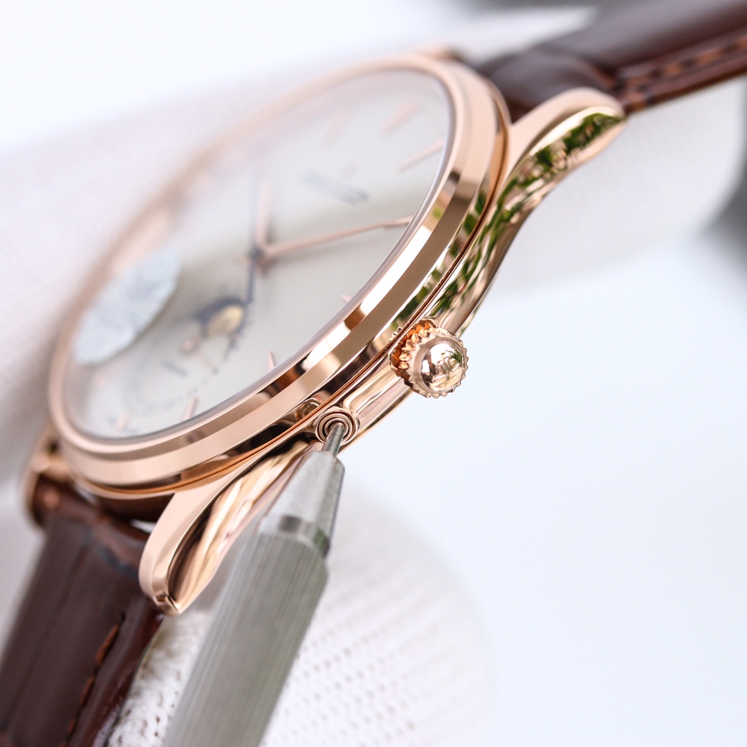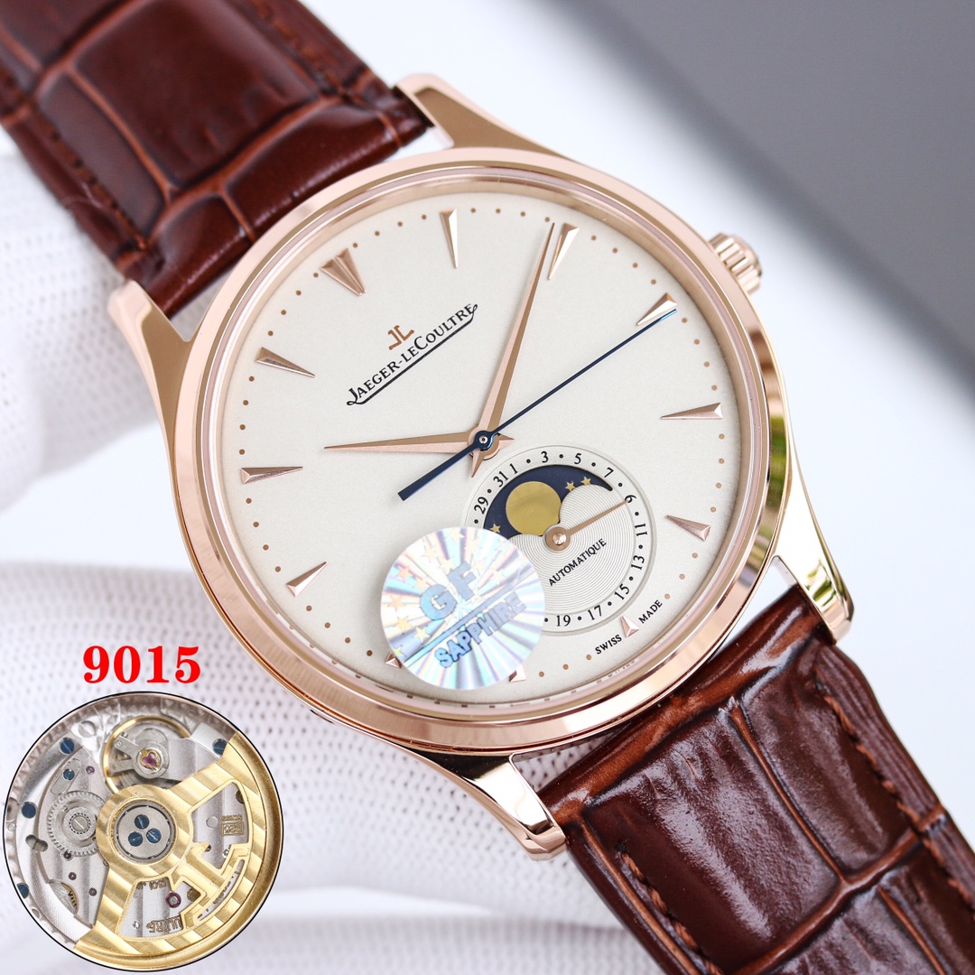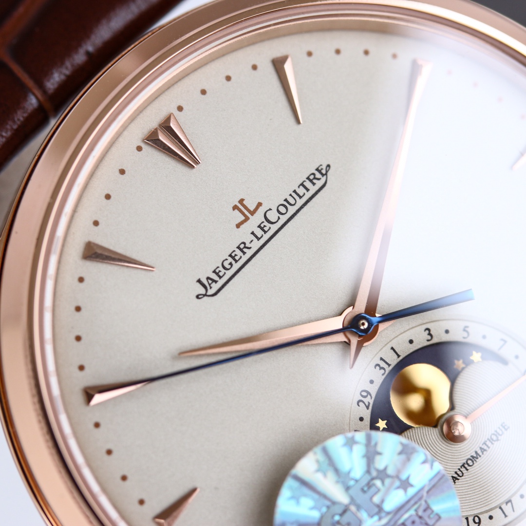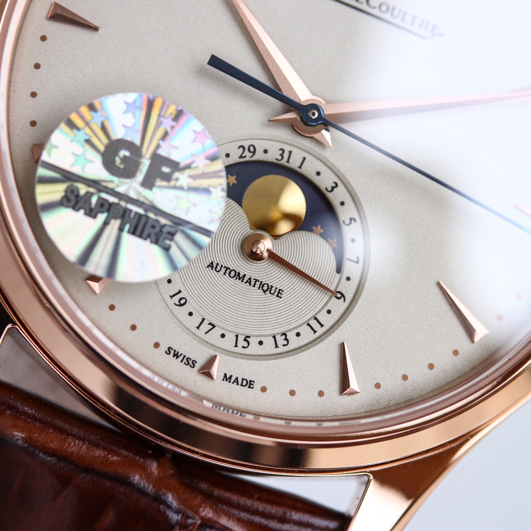 H8 Jaeger-LeCoultre Master Series (Classic Moon Phase) equipped with Cal2824 modified/9015 modified movement, diameter 39mm! 316 stainless steel perfectly replicates the original master, transparent sapphire crystal glass, exquisite yin-yang mother-child hands, flash silver silk dial, imported platinum scales from Taiwan, Italian calfskin and original butterfly clasp, all showcasing elegance and refinement comparable to genuine boutique products! Meticulously crafted, enjoy luxury, exclusive quality.